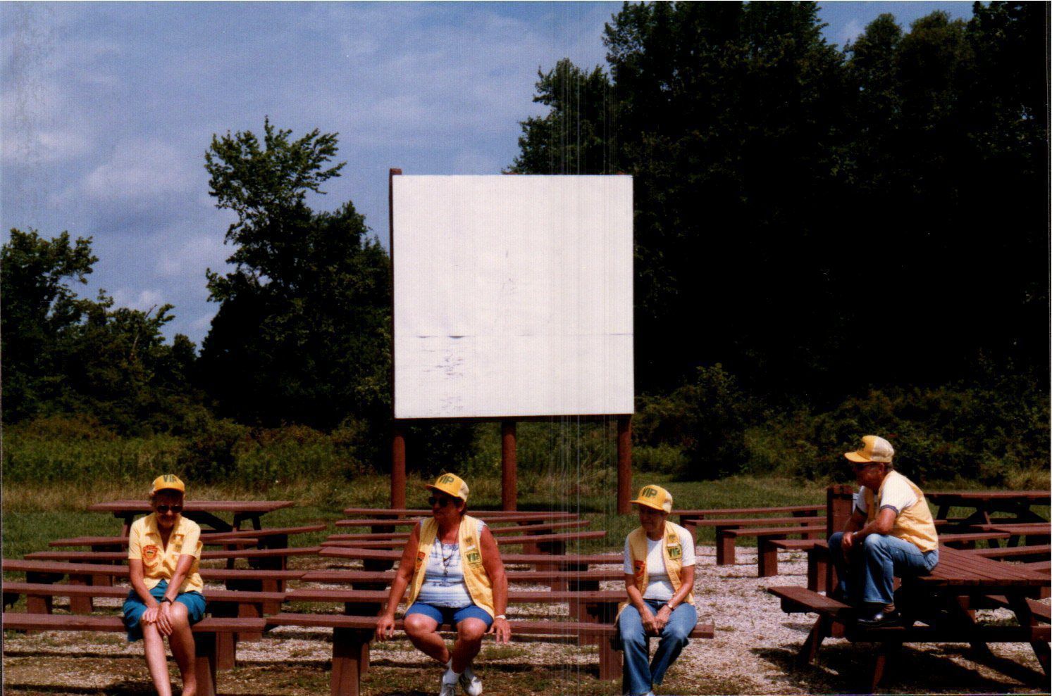 Highly-involved park volunteers at Delaware State Park don their "VIP" hats and vests for a group photo at the park's amphitheater.