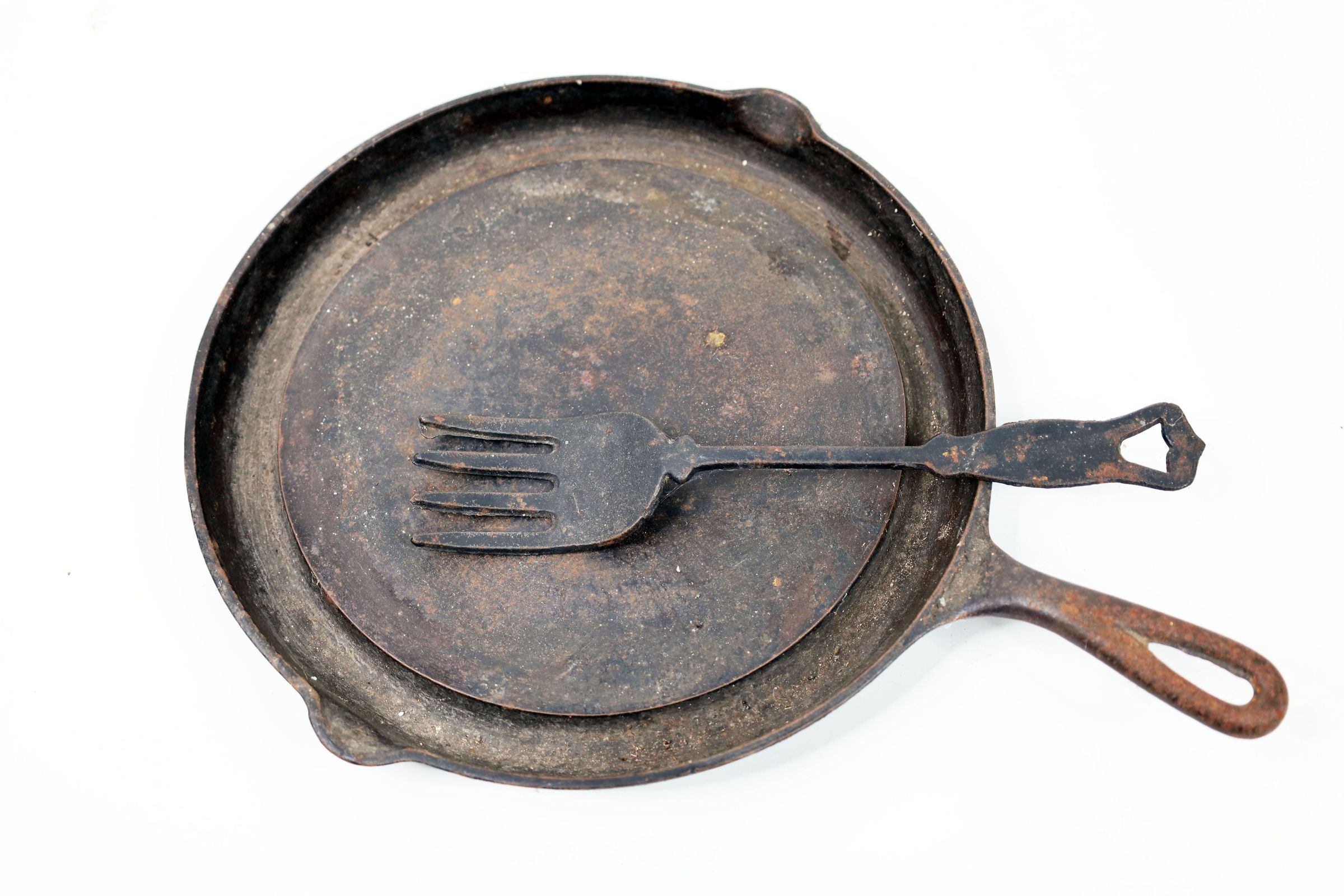 Cast iron skillet, made by Wagner Manufacturing of Sidney, Ohio. Founded in 1891, Wagner went through many changes in corporate ownership in the latter half of the 20th century, and ultimately ceased production of housewares at their Sidney foundry in 1999. The Wagner brand was recently revived, and is currently headquartered in Philadelphia, PA. This skillet features a recessed ring for the accumulation of fat and liquids, and two pour spouts for the drainage of excess. The maker of the turning fork is unknown.