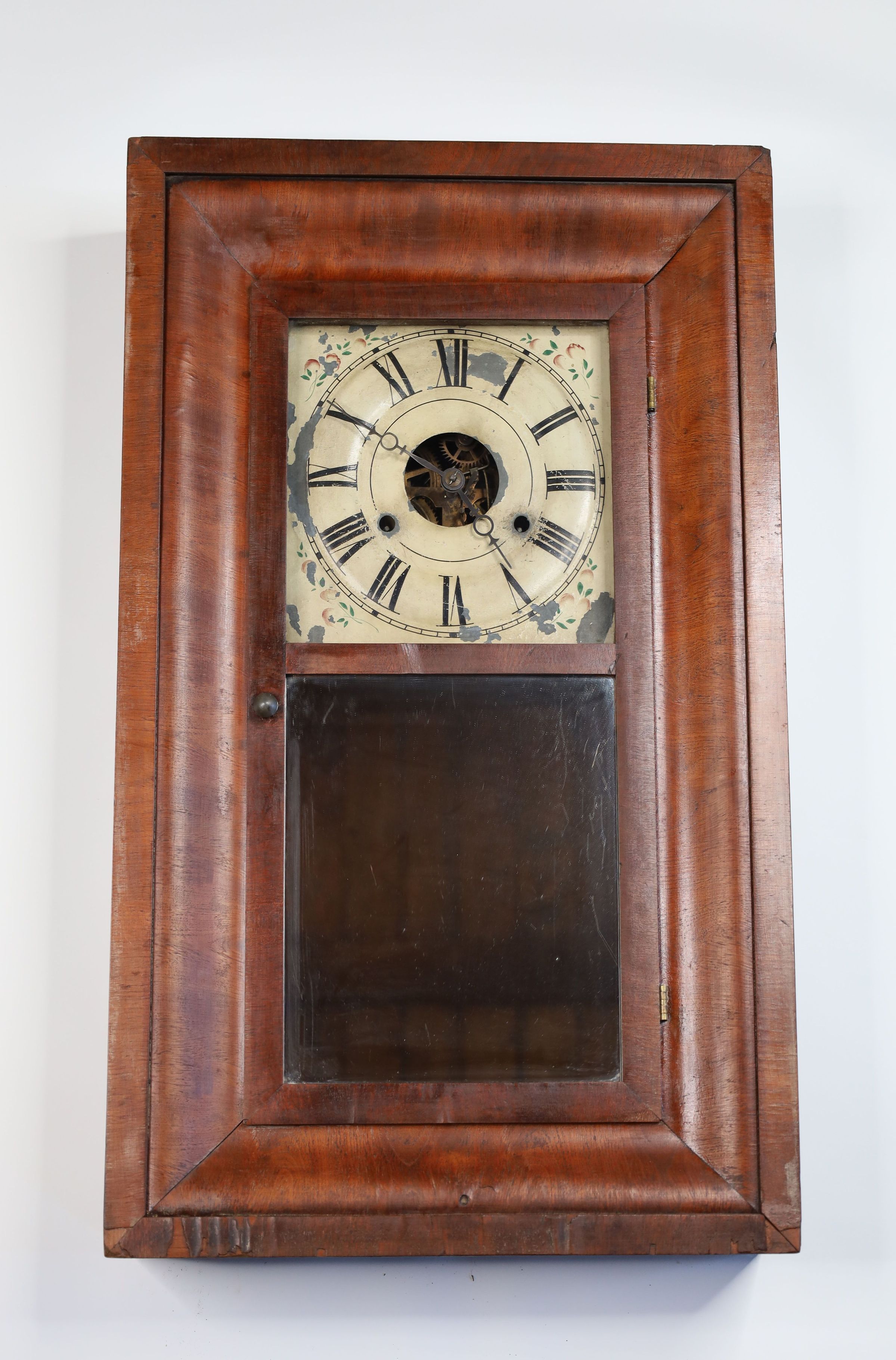 Antique wall clock with mirrored panel. Age and maker unknown.