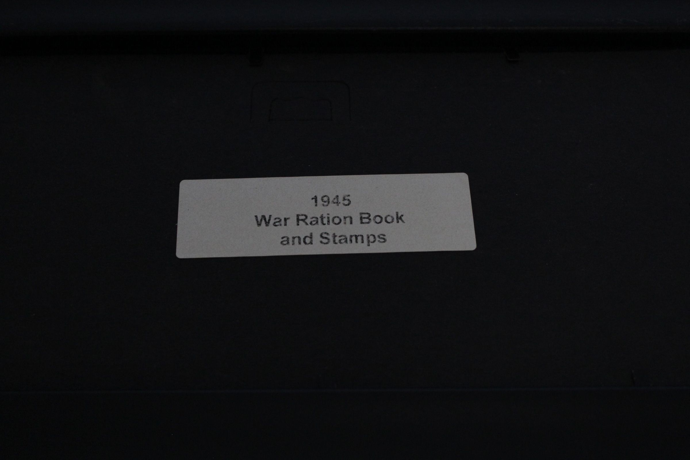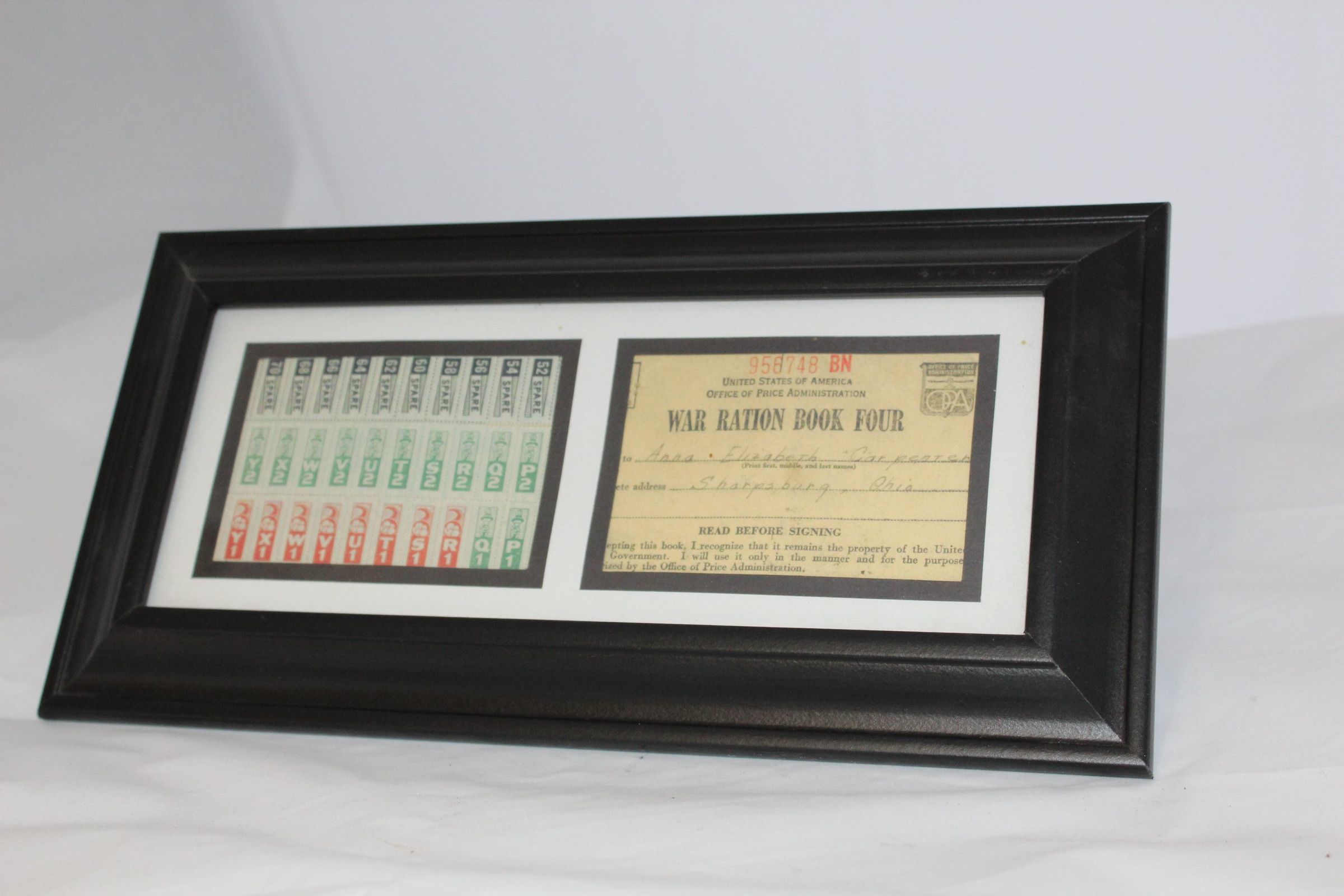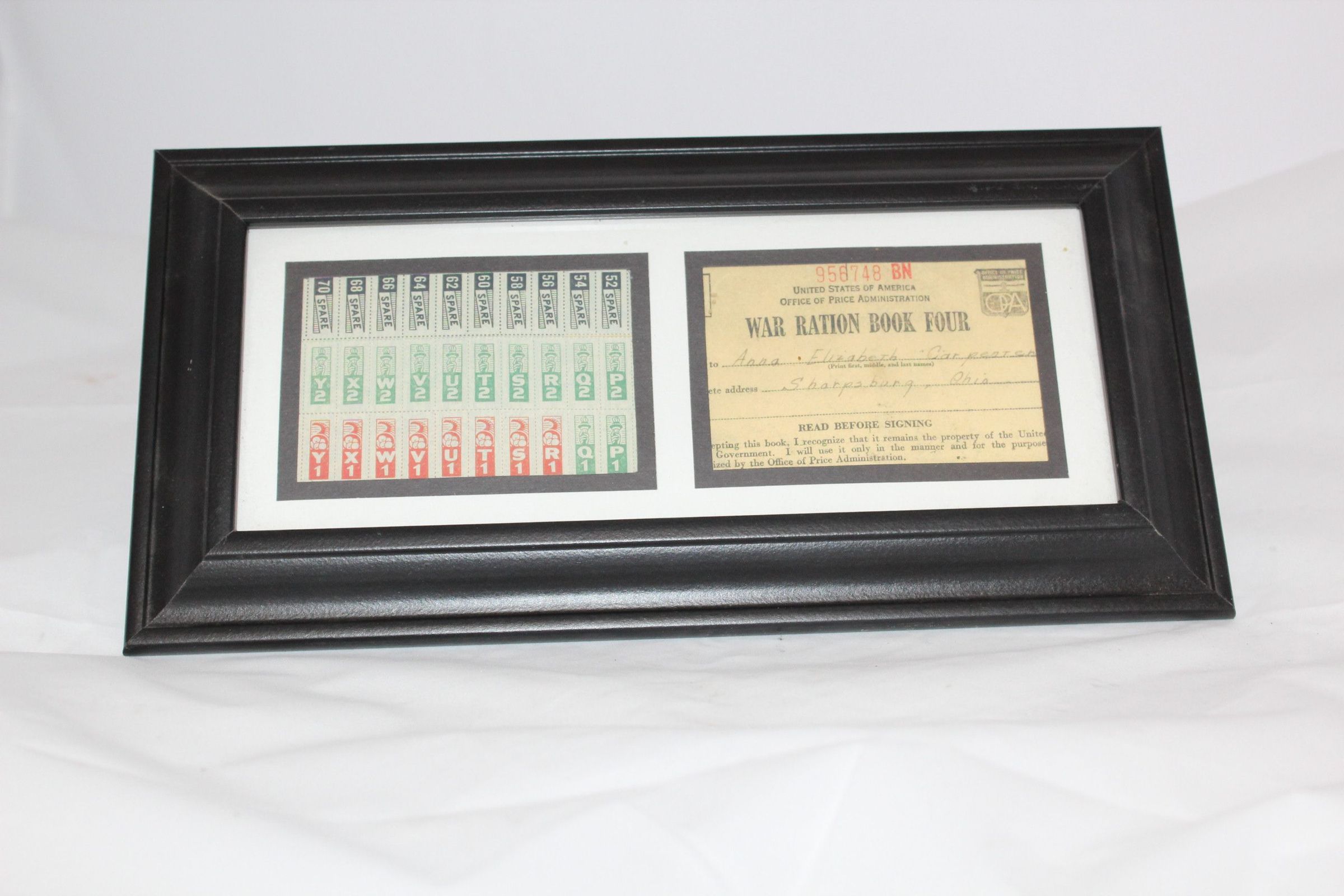 War Ration Book Four and a set of stamps are matted and framed here. The ration book is numbered 958748BN and is signed Anna Elizabeth Carpenter. A variety of stamps are included.