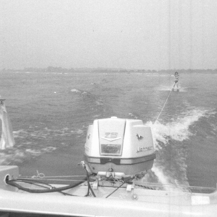 A motorboat pulls a water skier gliding across the water of Delaware Lake.