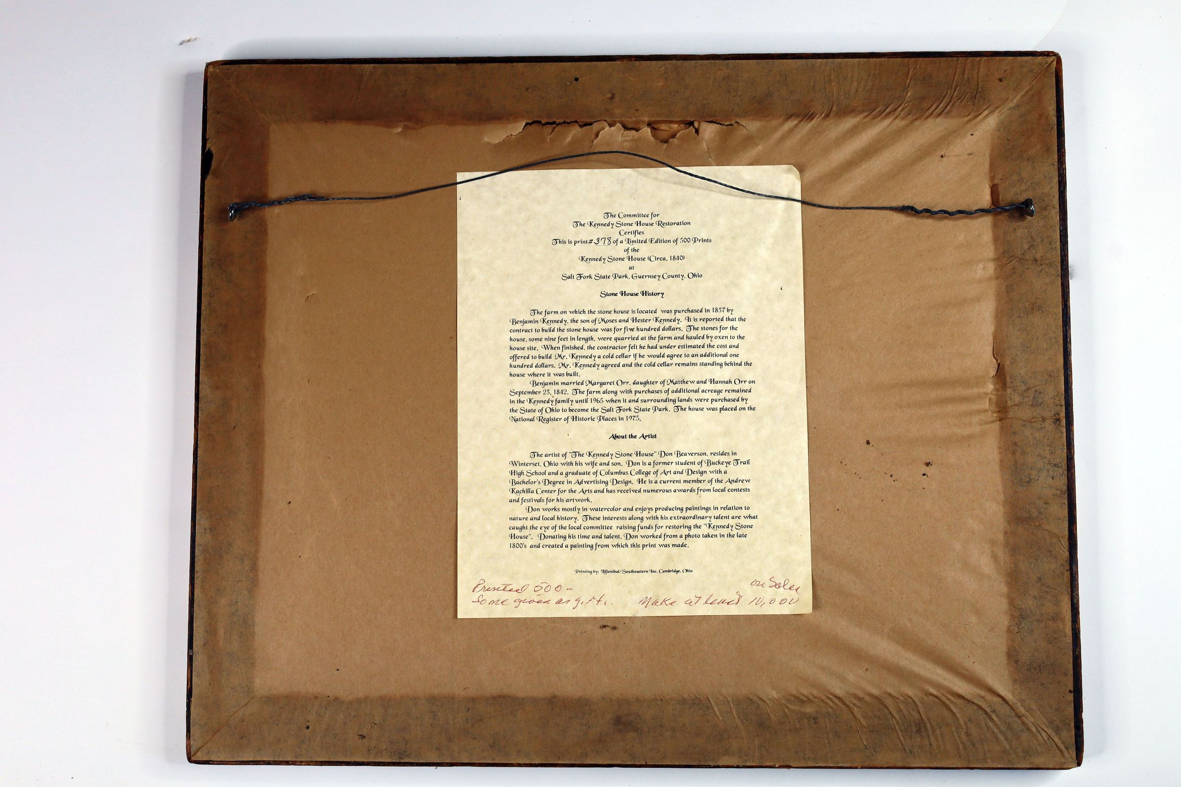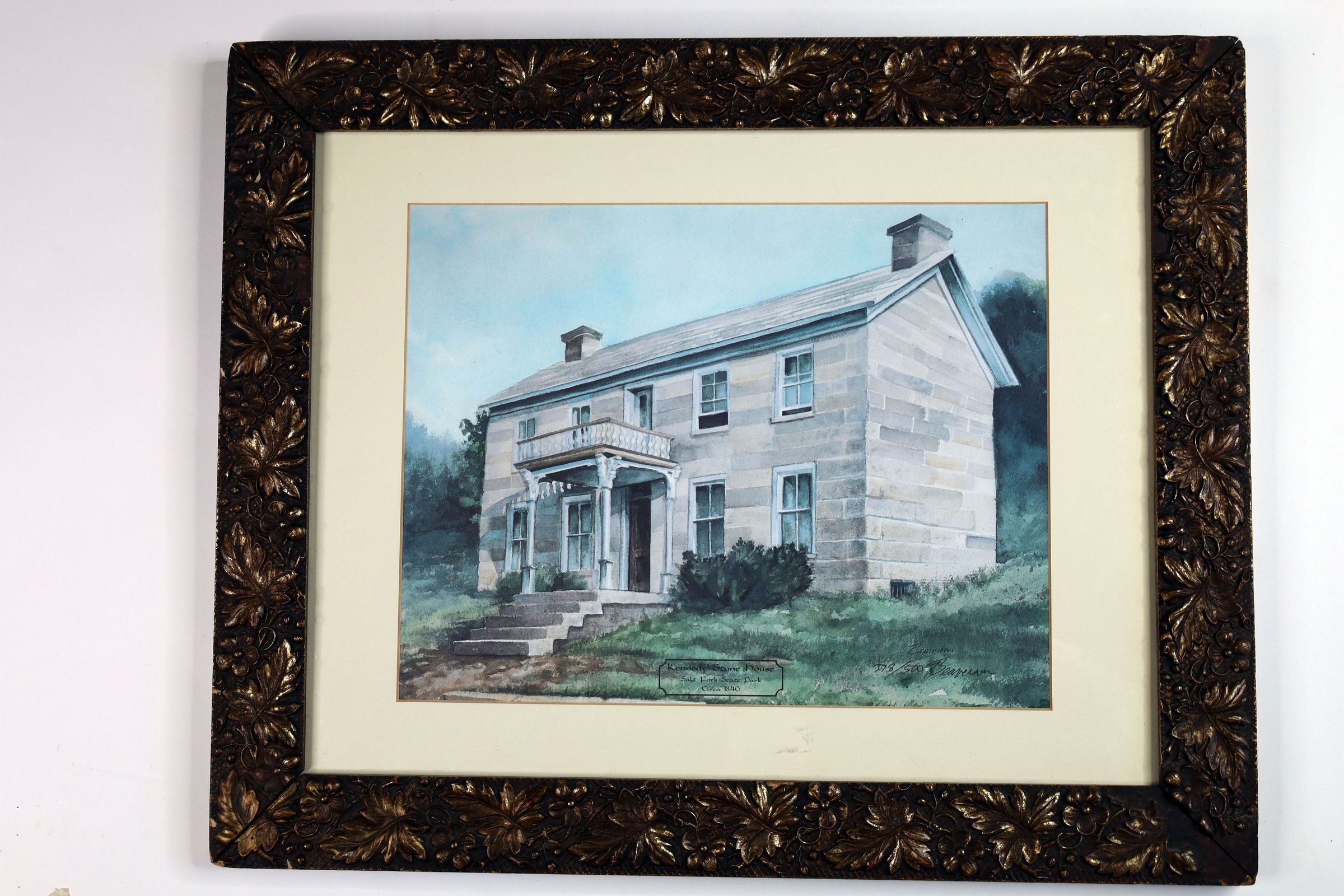 Print of a watercolor painting of the Kennedy Stone House by Don Beaverson of Winterset, Ohio. Number 378/500 prints made.