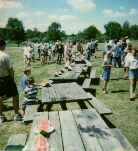 Chunks of ripe watermelon are laid out for what appears to be a watermelon eating contest. This event was part of the commemoration for Indian Lake State Park's 50th anniversary as a state park held on August 21, 1999. Indian Lake has a long history as a recreation destination stretching back into the 1800s. It was one of Ohio's first state parks following the creation of the Ohio Department of Natural Resources (ODNR) in 1949.