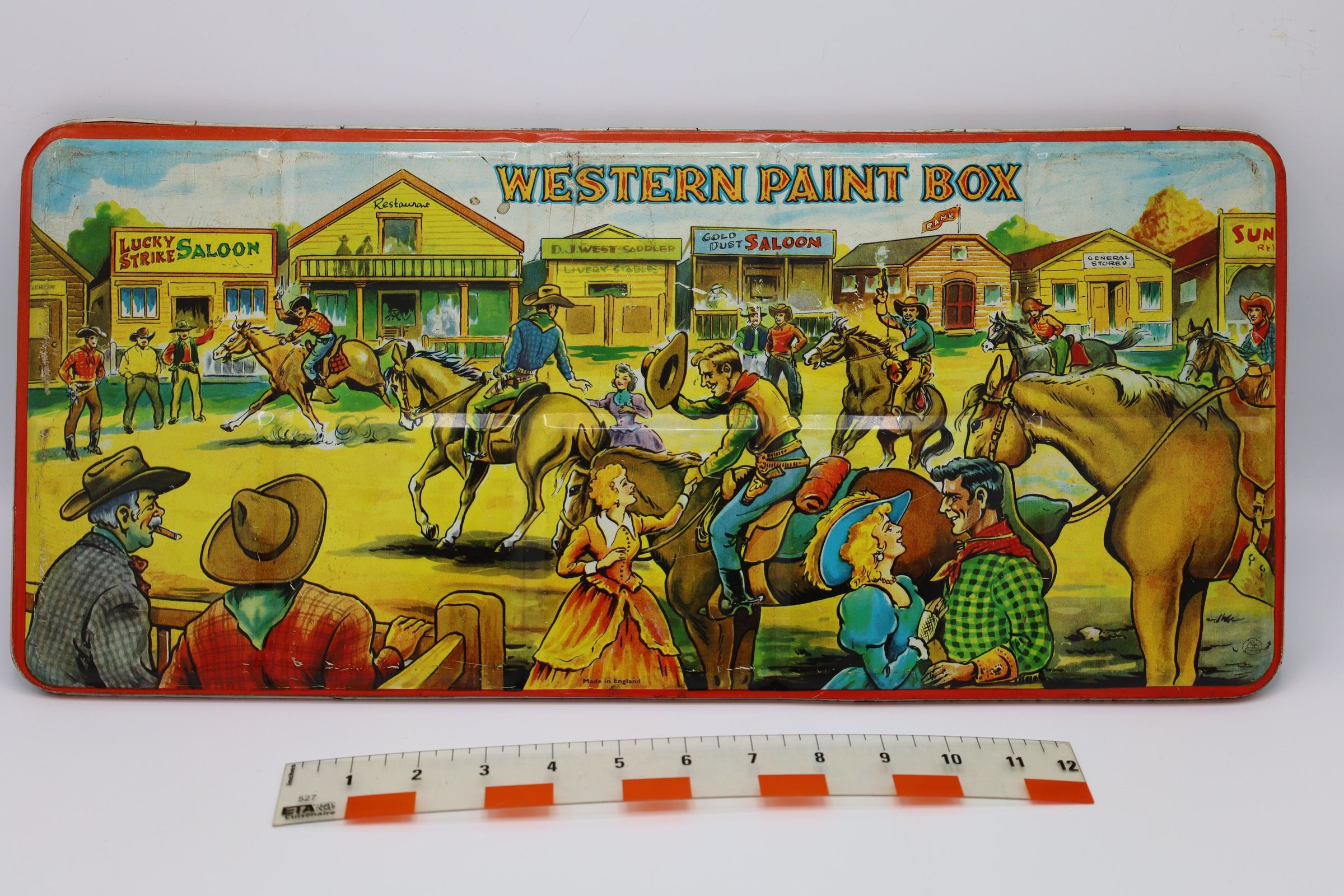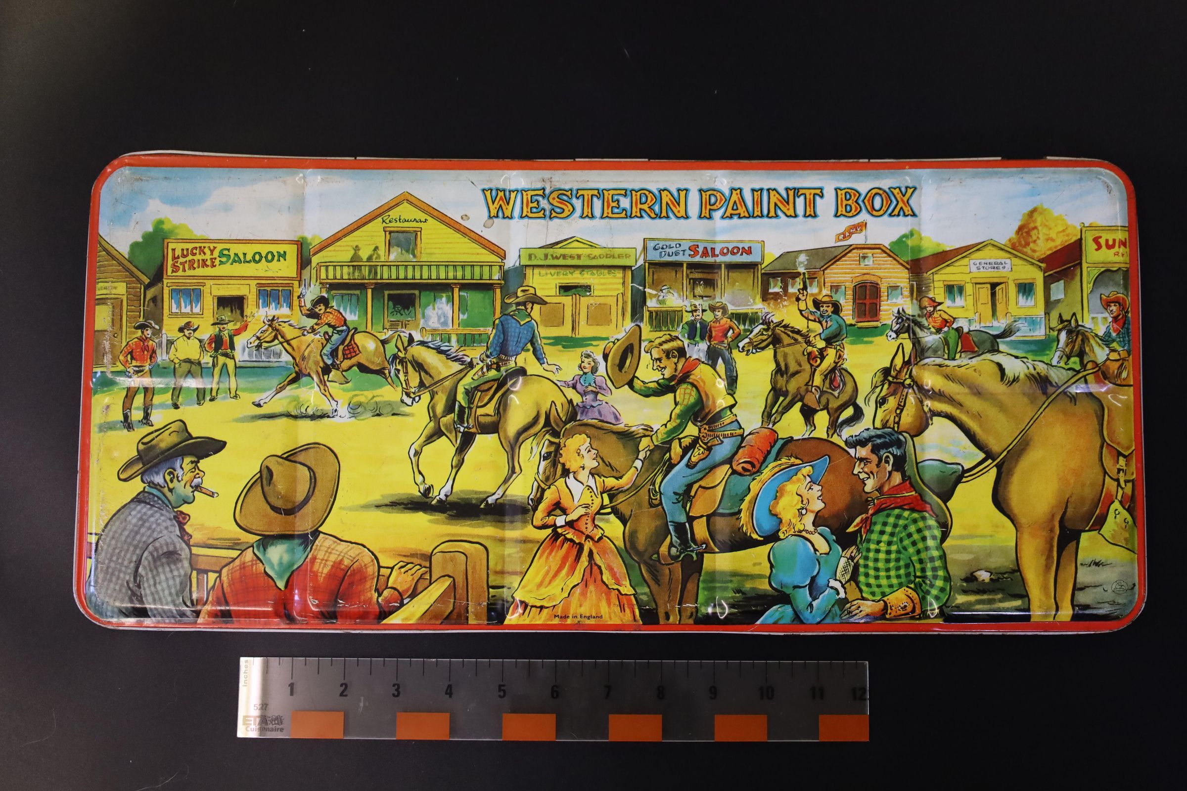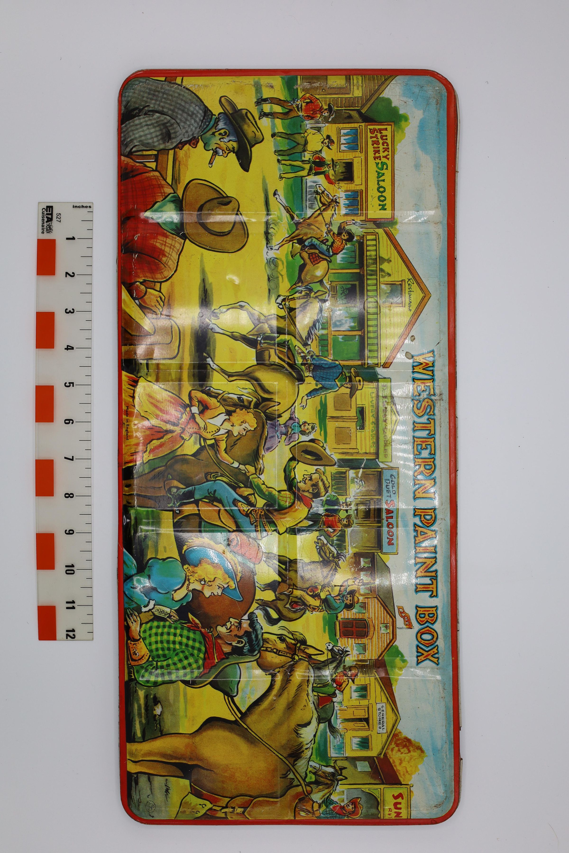 This paint box was made in England by Page of London. The exterior has a Wild West scene with cowboys on horseback and ladies in feather hats. A gunfight on horseback has erupted in the background in front of a saloon. Paint boxes were a popular toy in the 1950s.Location