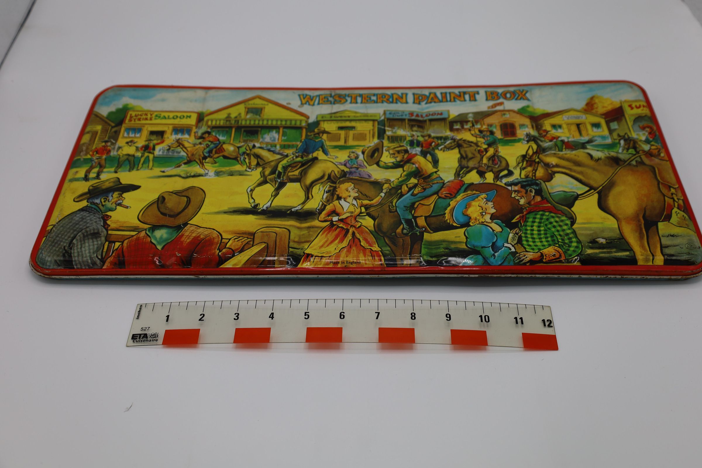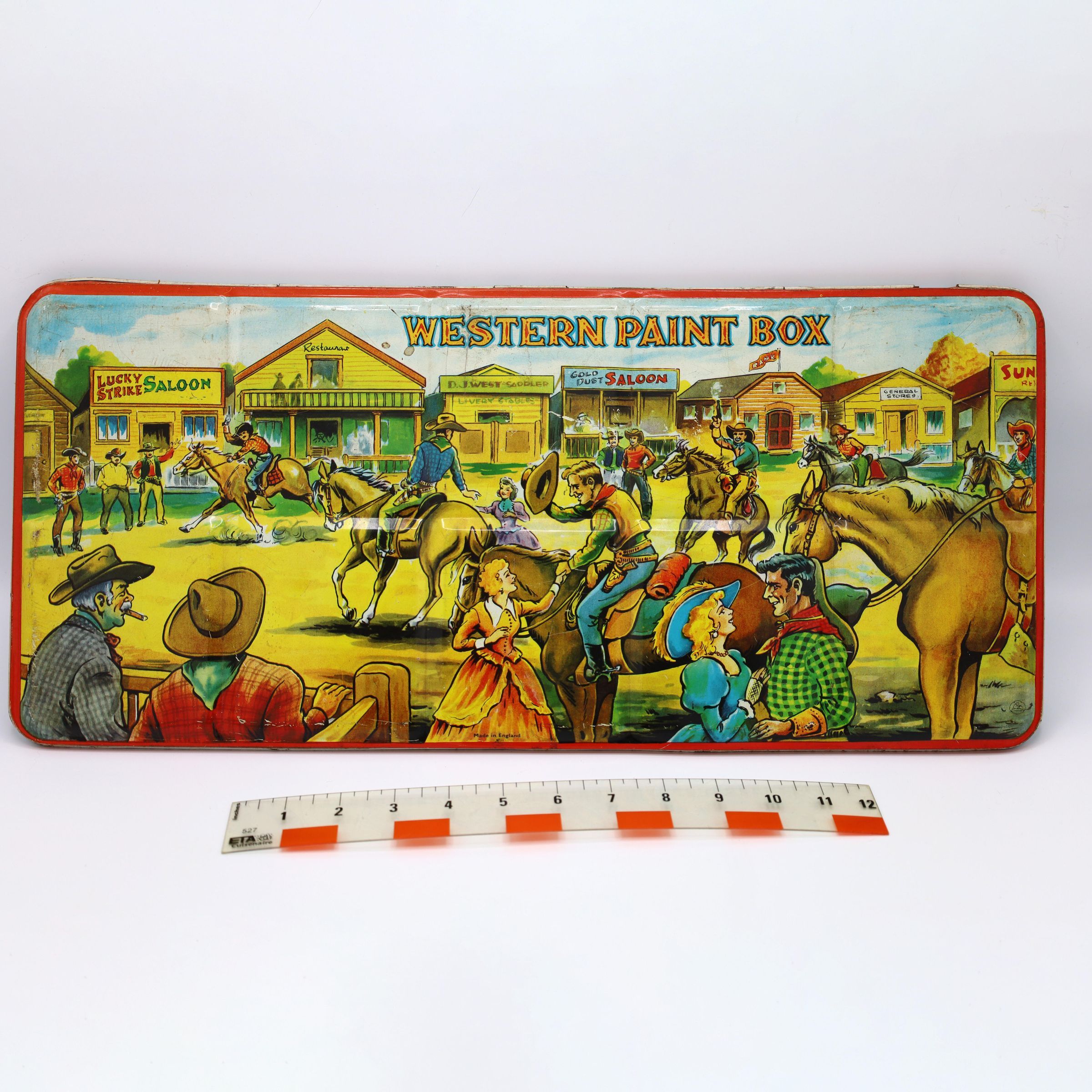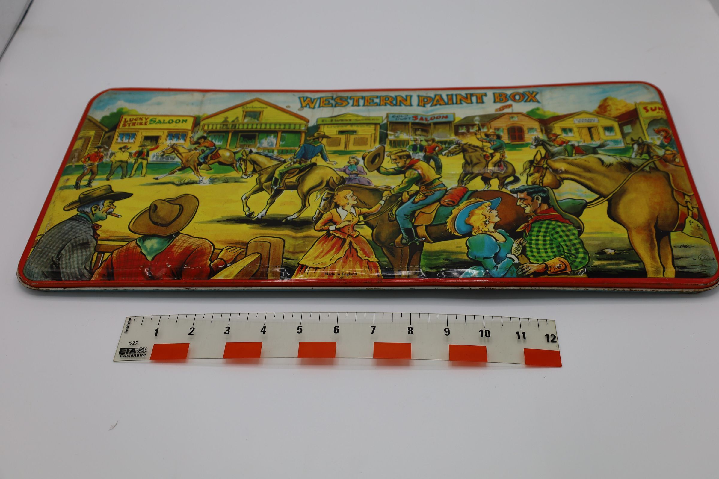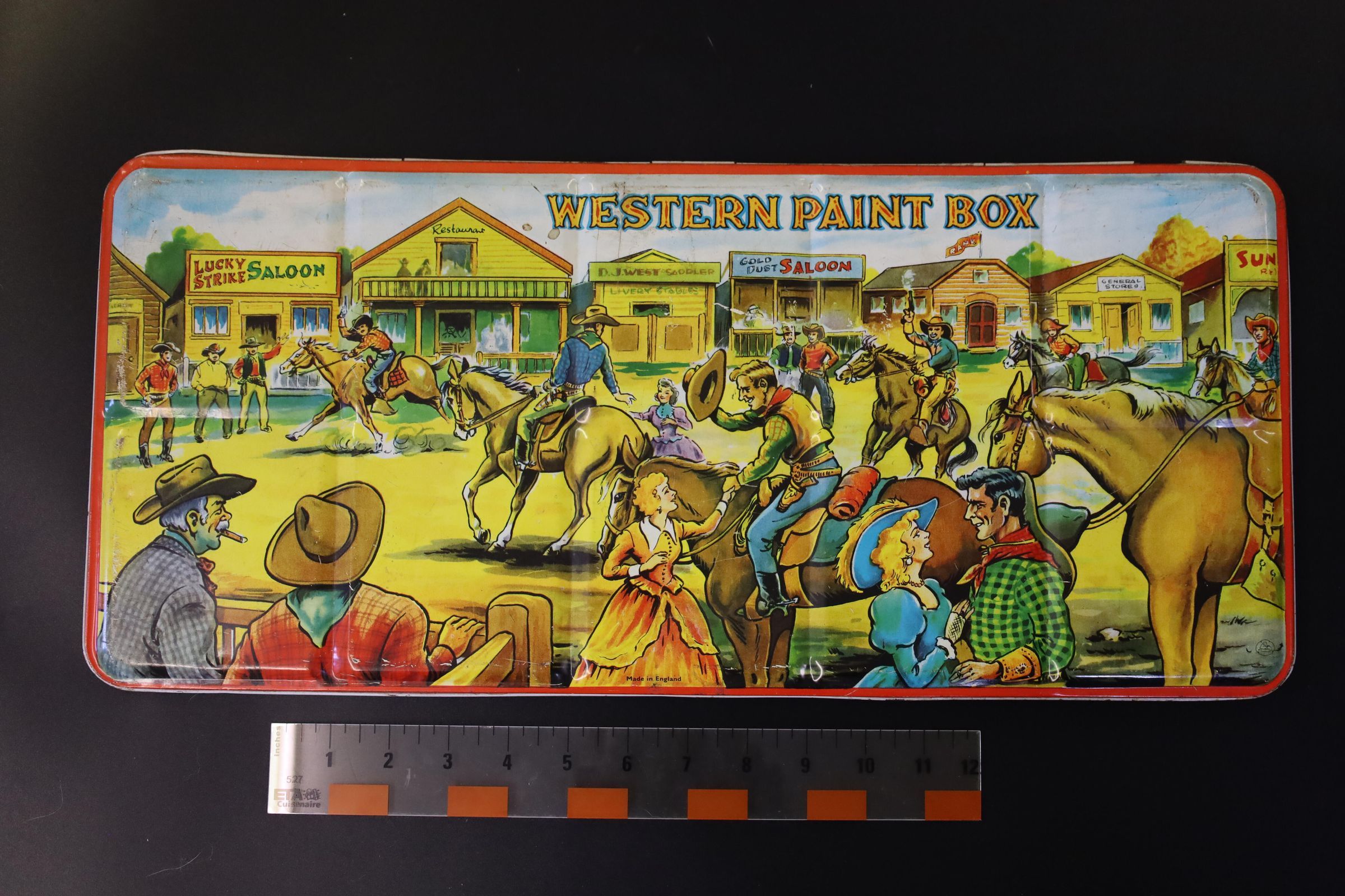 This paint box was made in England by Page of London. The exterior has a Wild West scene with cowboys on horseback and ladies in feather hats. A gunfight on horseback has erupted in the background in front of a saloon. Paint boxes were a popular toy in the 1950s.Location