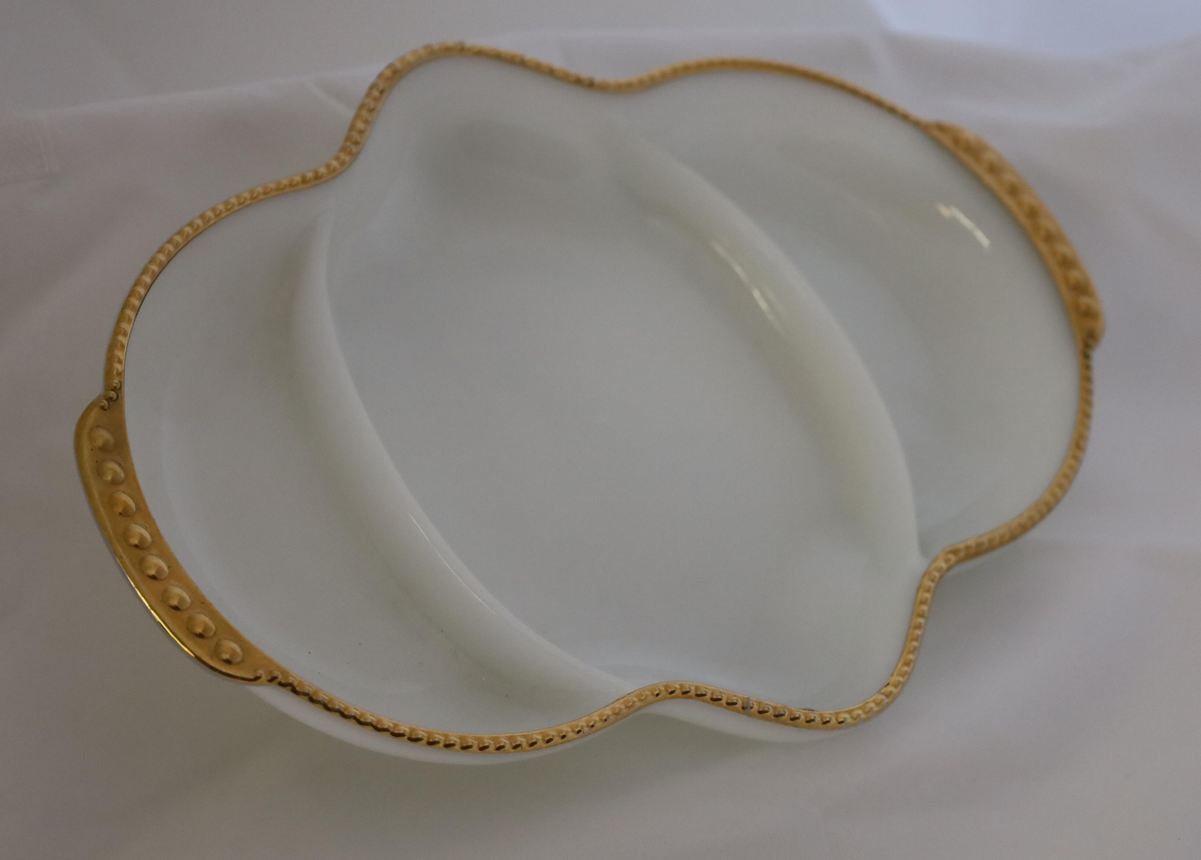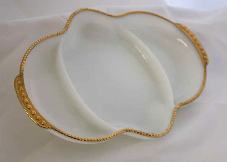 The divided milk glass serving with gold trim, likely the golden shell design, may be part of Anchor Hocking's 150th anniversary set. It is unknown whether the dish, currently in Mary Bromfield's bedroom, was actually used to hold her jewelry.Location