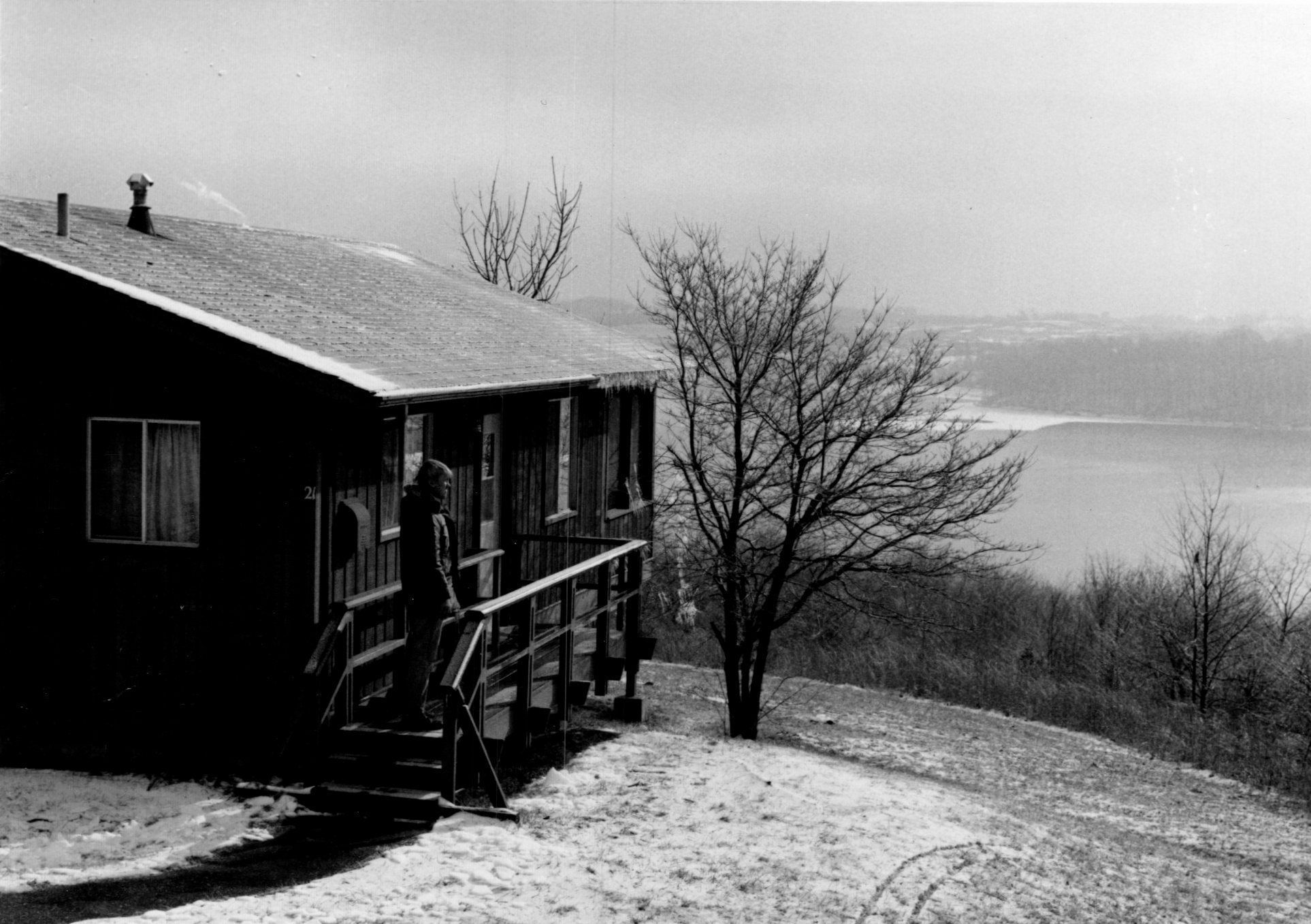 A dusting of snow has blanketed a cabin and the surrounding landscape at Dillon State Park. In the distance, Dillon Lake appears to be partially frozen over with ice.Cataloged By