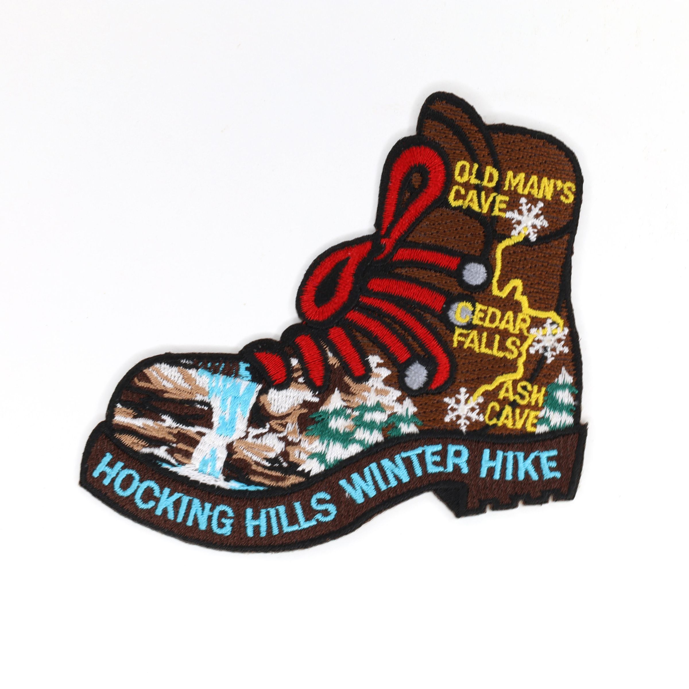 Embroidered hiking boot patch displays the river that flows through the Hocking Hills State Park. A stylized map on the right side of the patch depicts three favorite areas: Old Man's Cave, Cedar Falls, and Ash Cave.