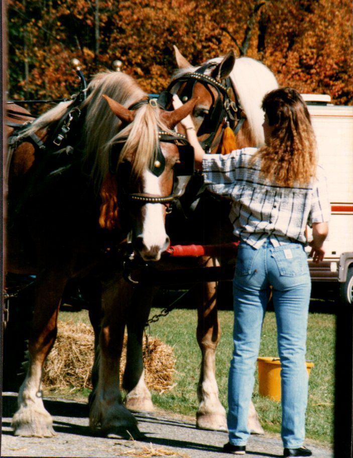 A woman pets a team of horses during a festival at Mt. Gilead State Park in 1989.