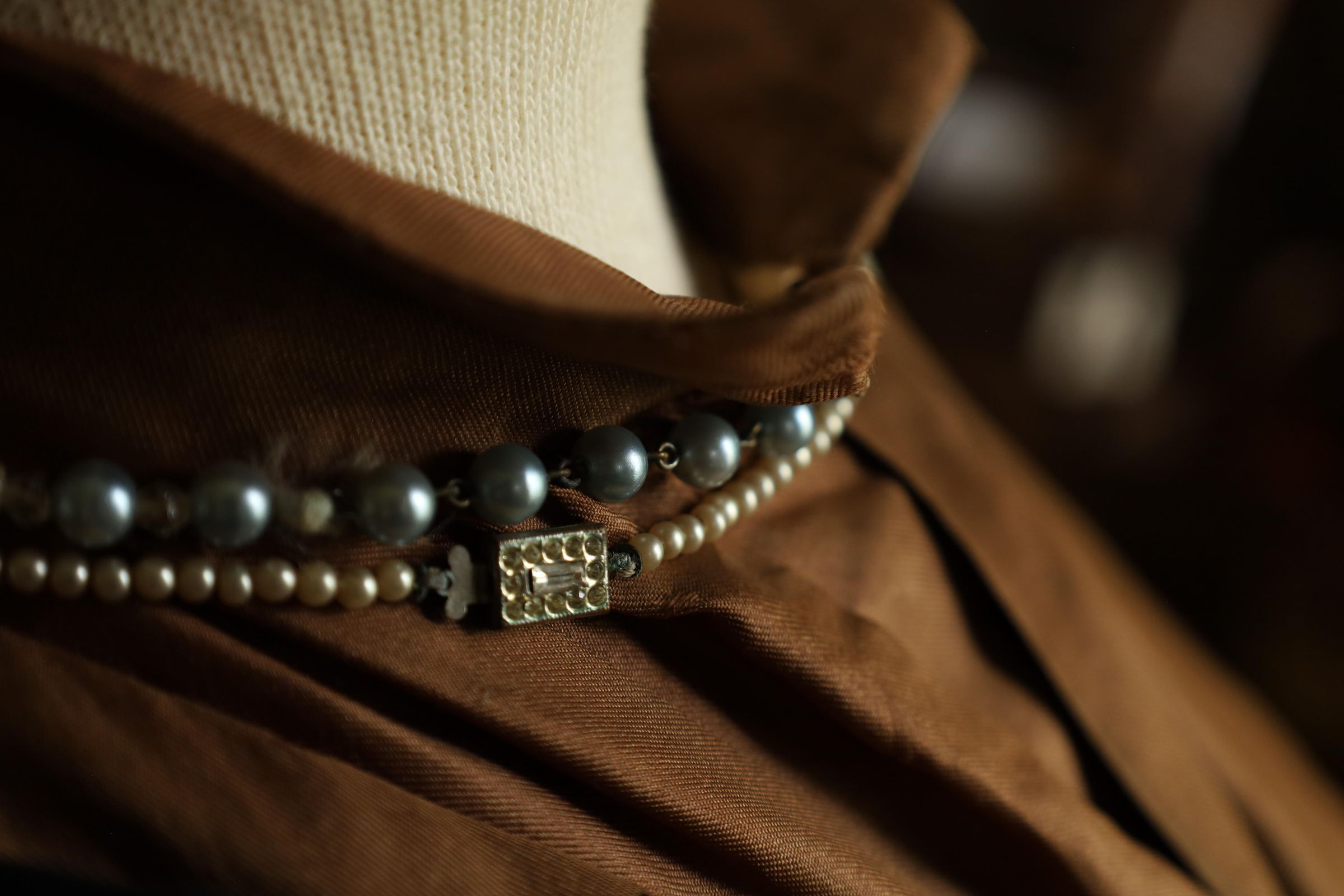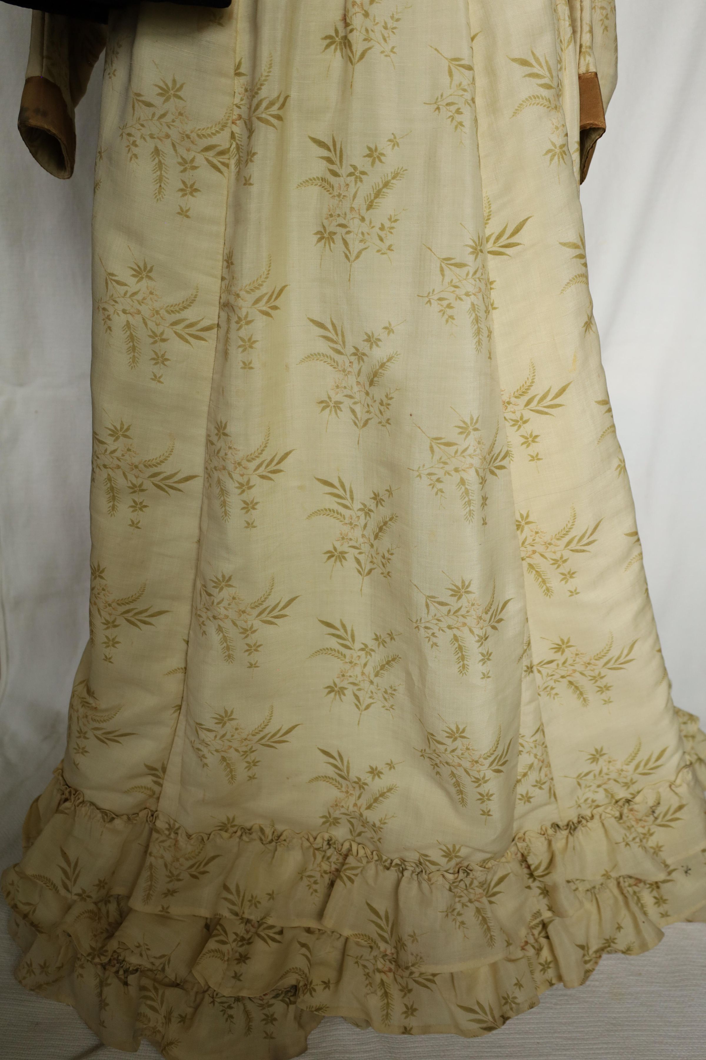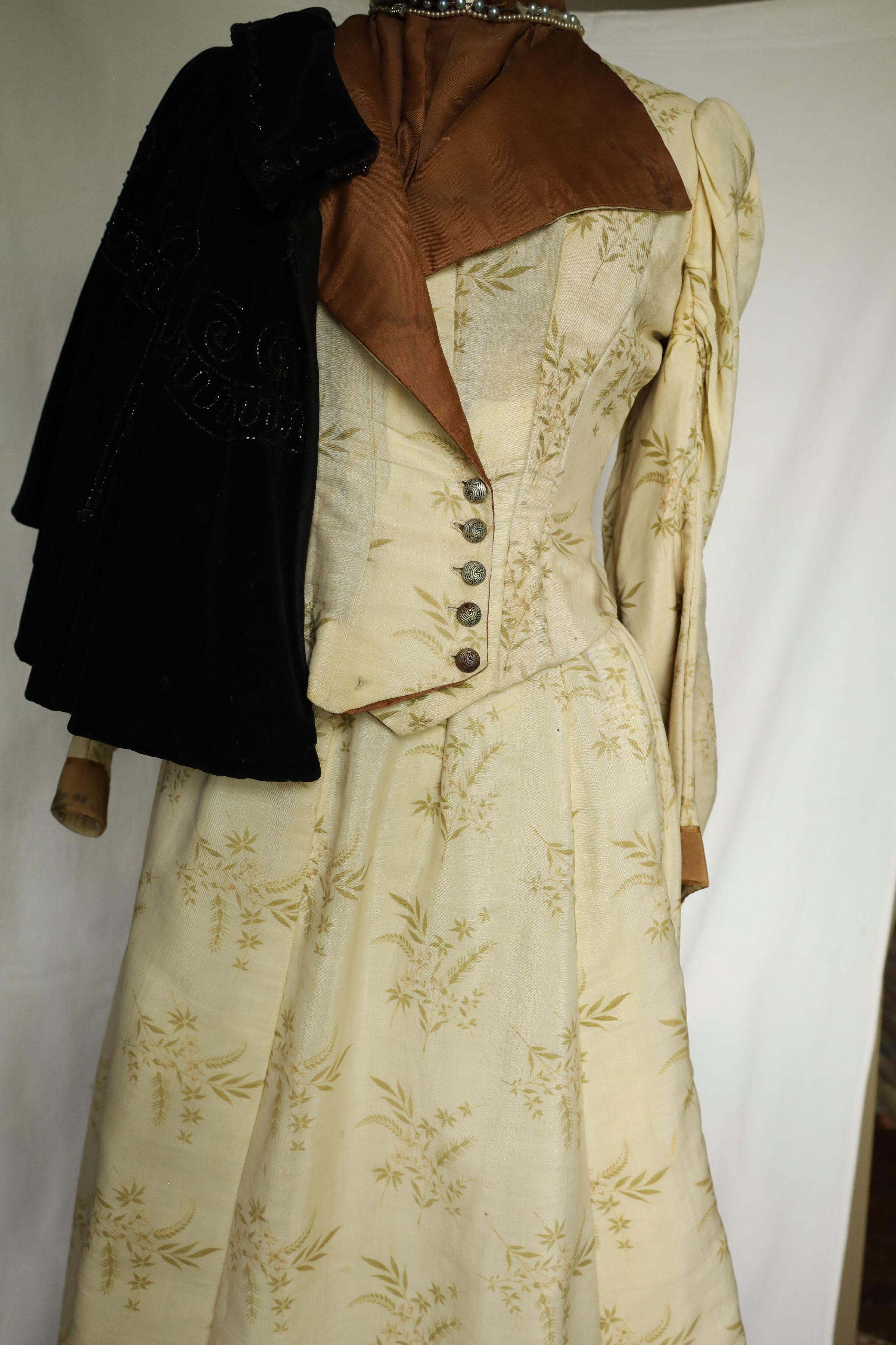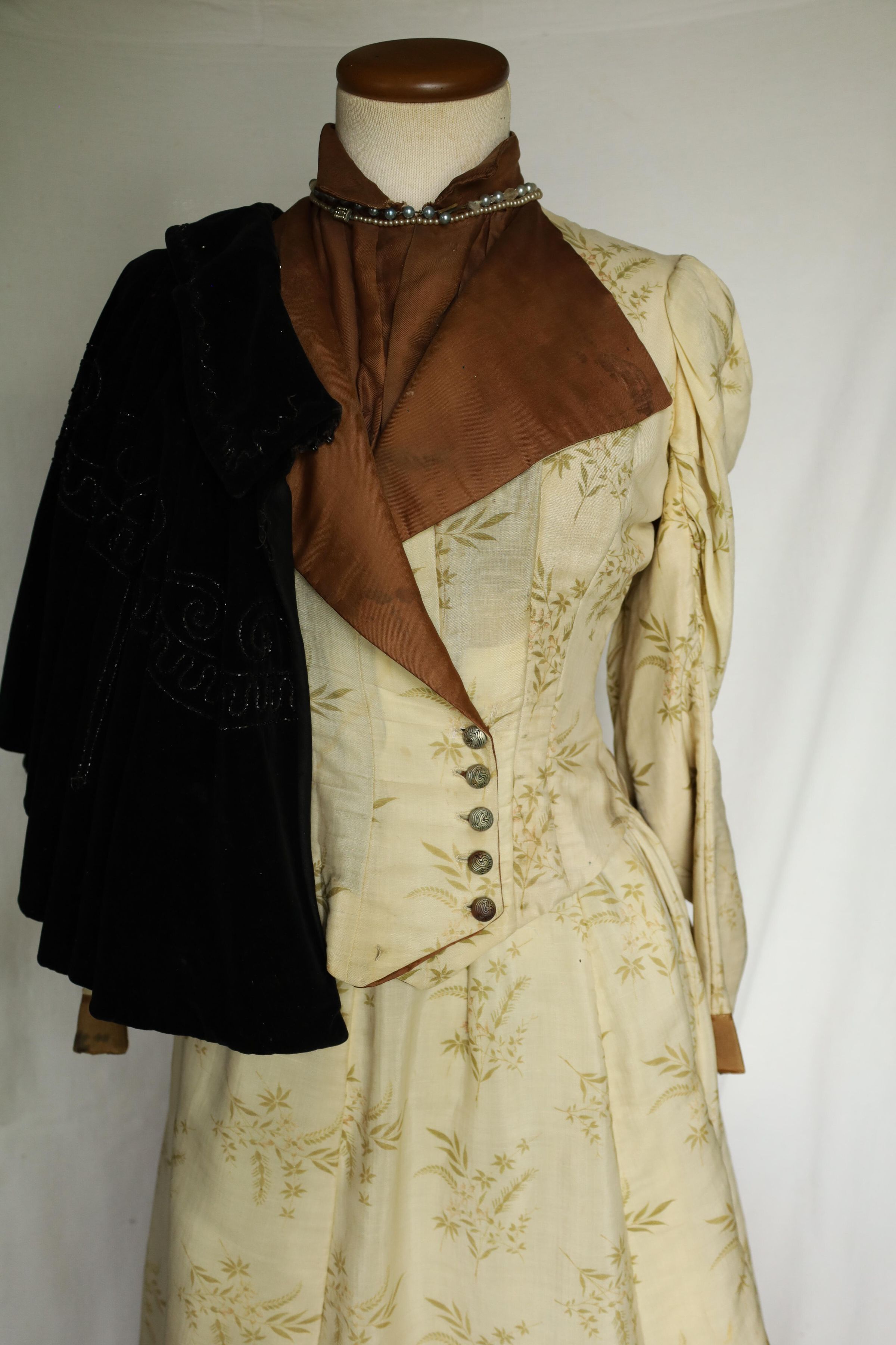 This is a 19th century woman's dress and cape with a mahogany brown inner layer to complement the off-white outer layer. The outer layer also presents a floral/leaf print. A dark brown cape is draped over the bust mannequins shoulder and two choker necklaces are worn around the neck, one adorned with small pearls and the other with larger darker pearls.Location