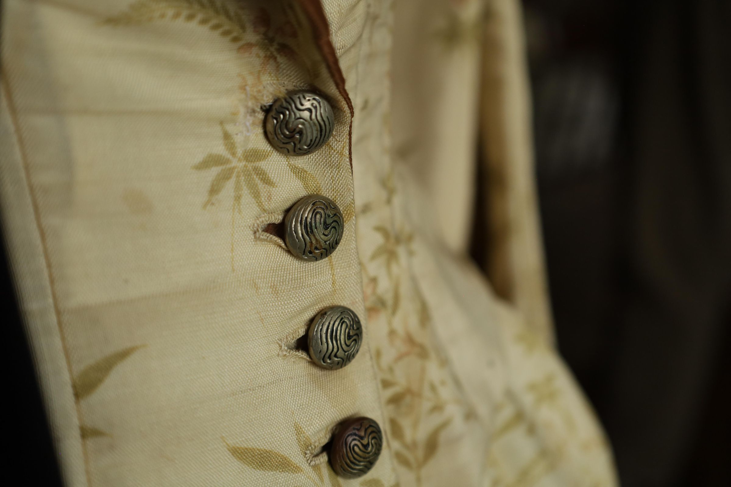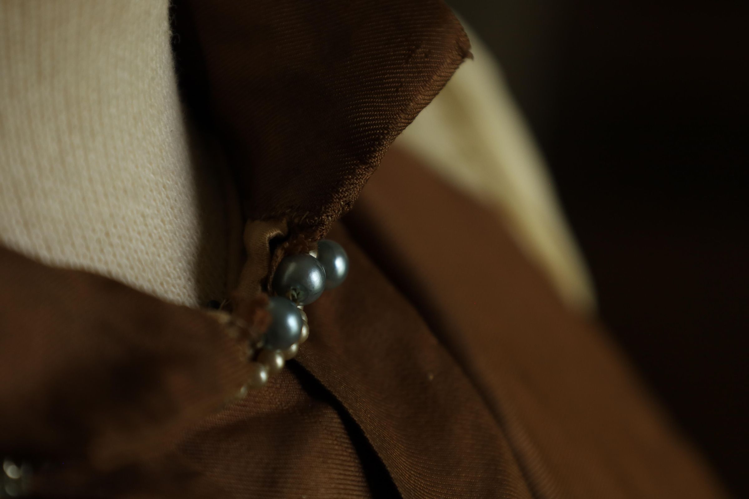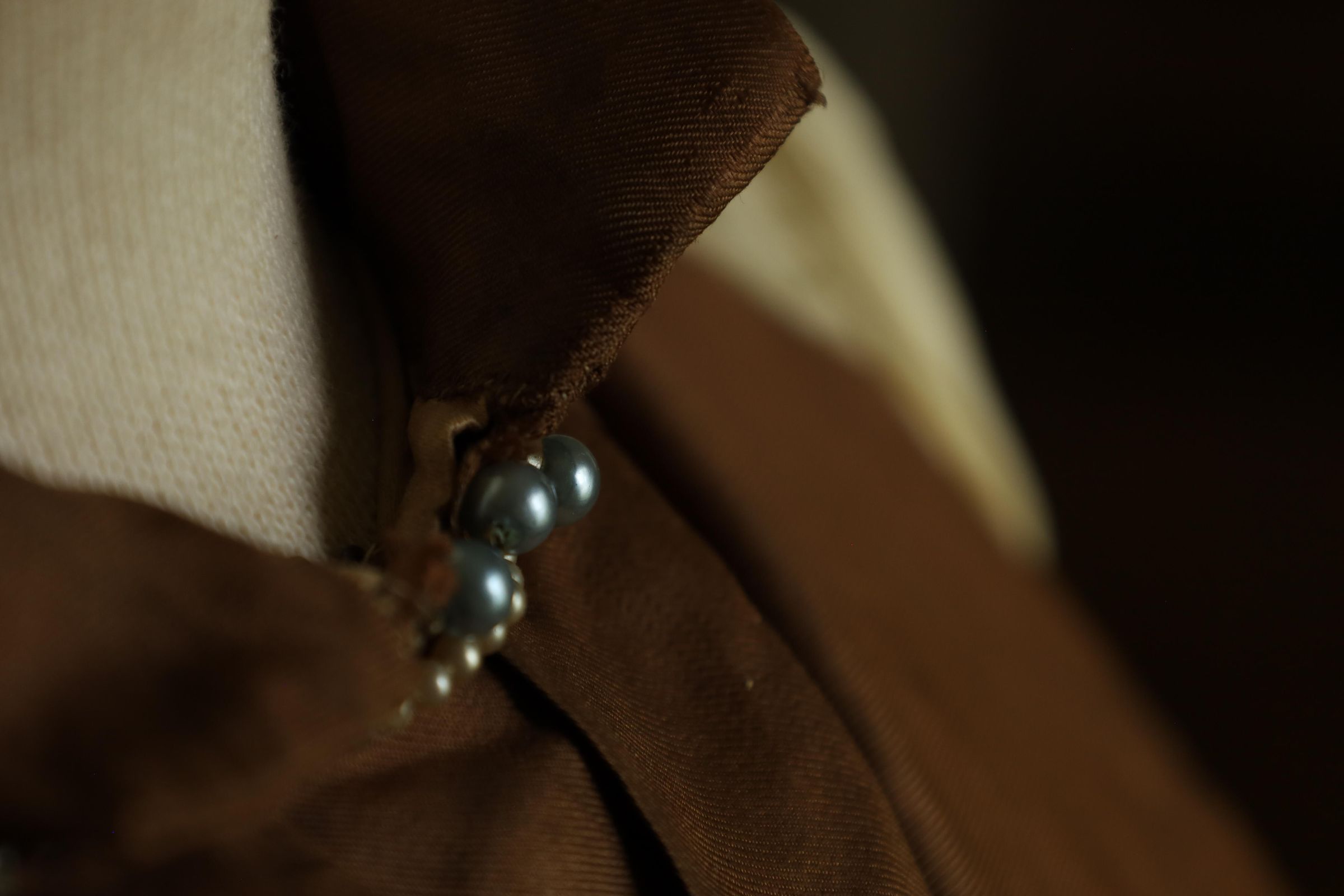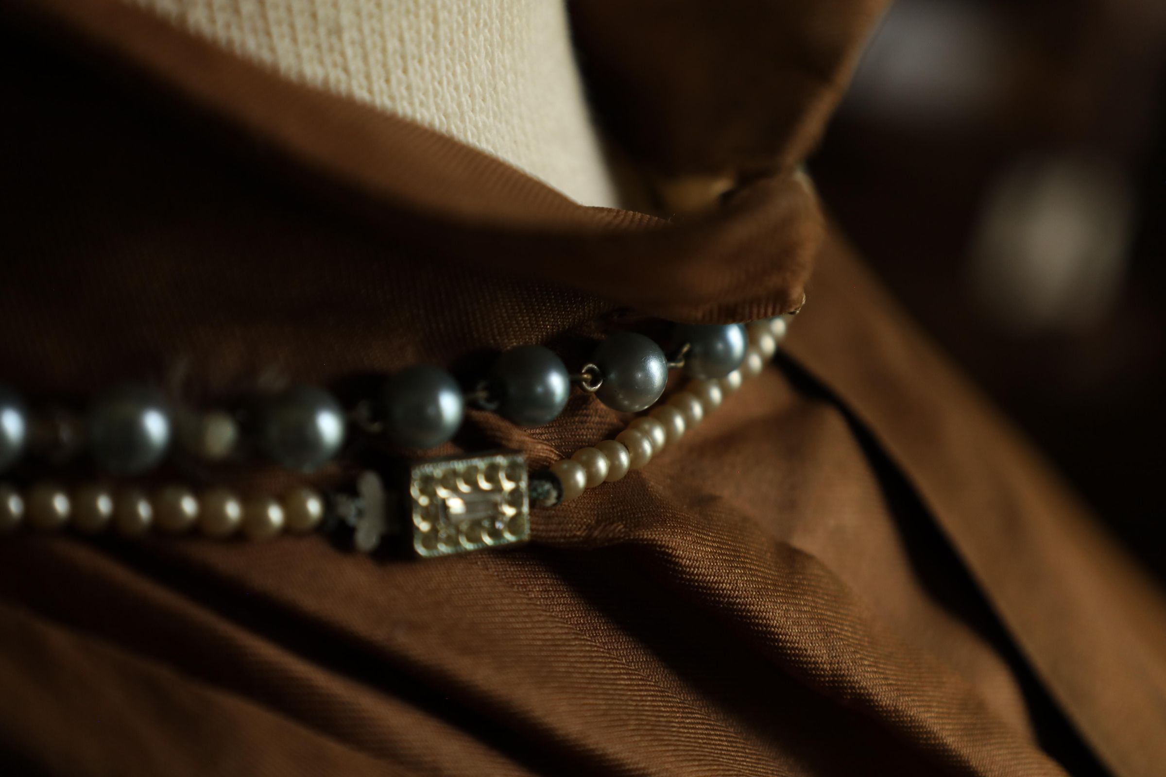 This is a 19th century woman's dress and cape with a mahogany brown inner layer to complement the off-white outer layer. The outer layer also presents a floral/leaf print. A dark brown cape is draped over the bust mannequins shoulder and two choker necklaces are worn around the neck, one adorned with small pearls and the other with larger darker pearls.Location