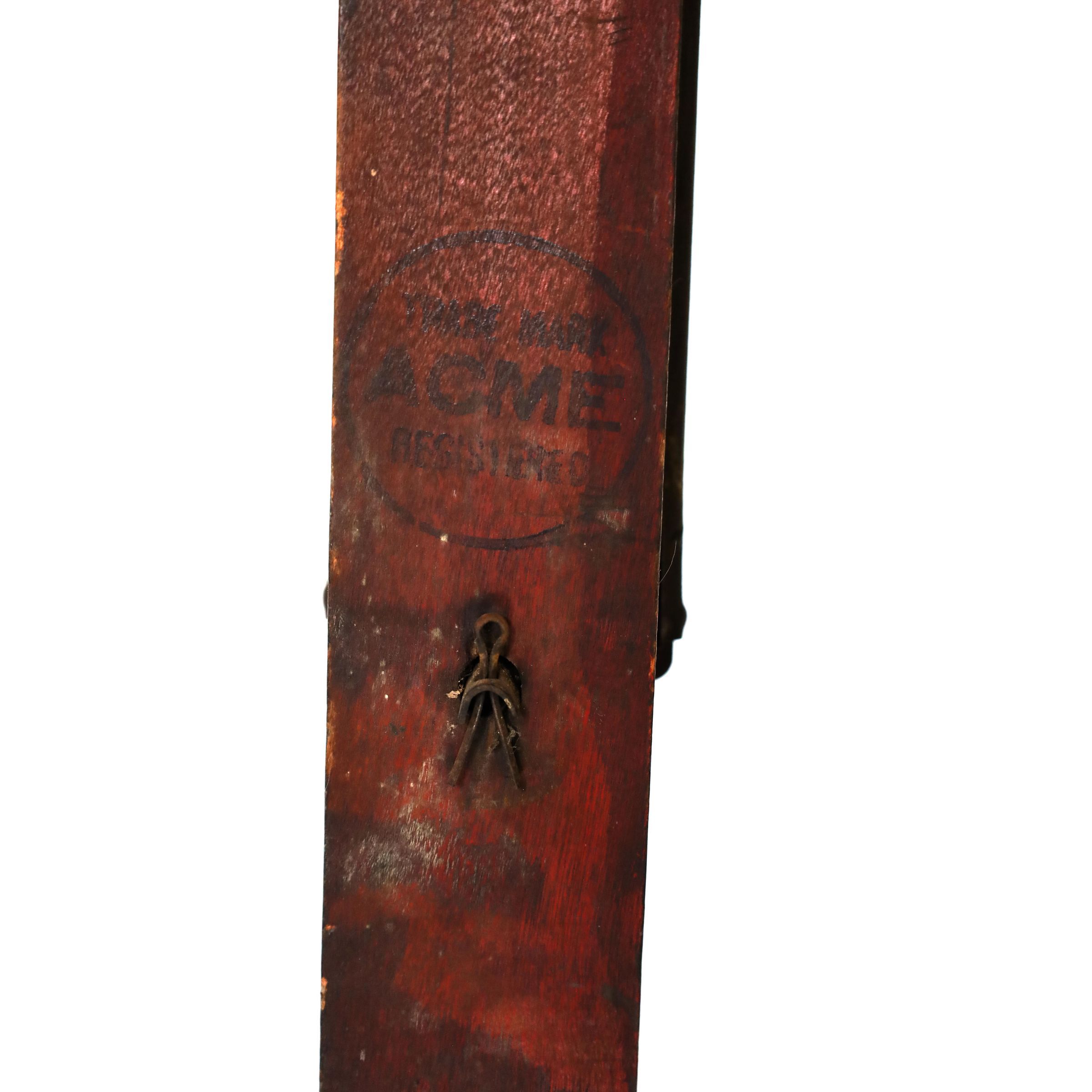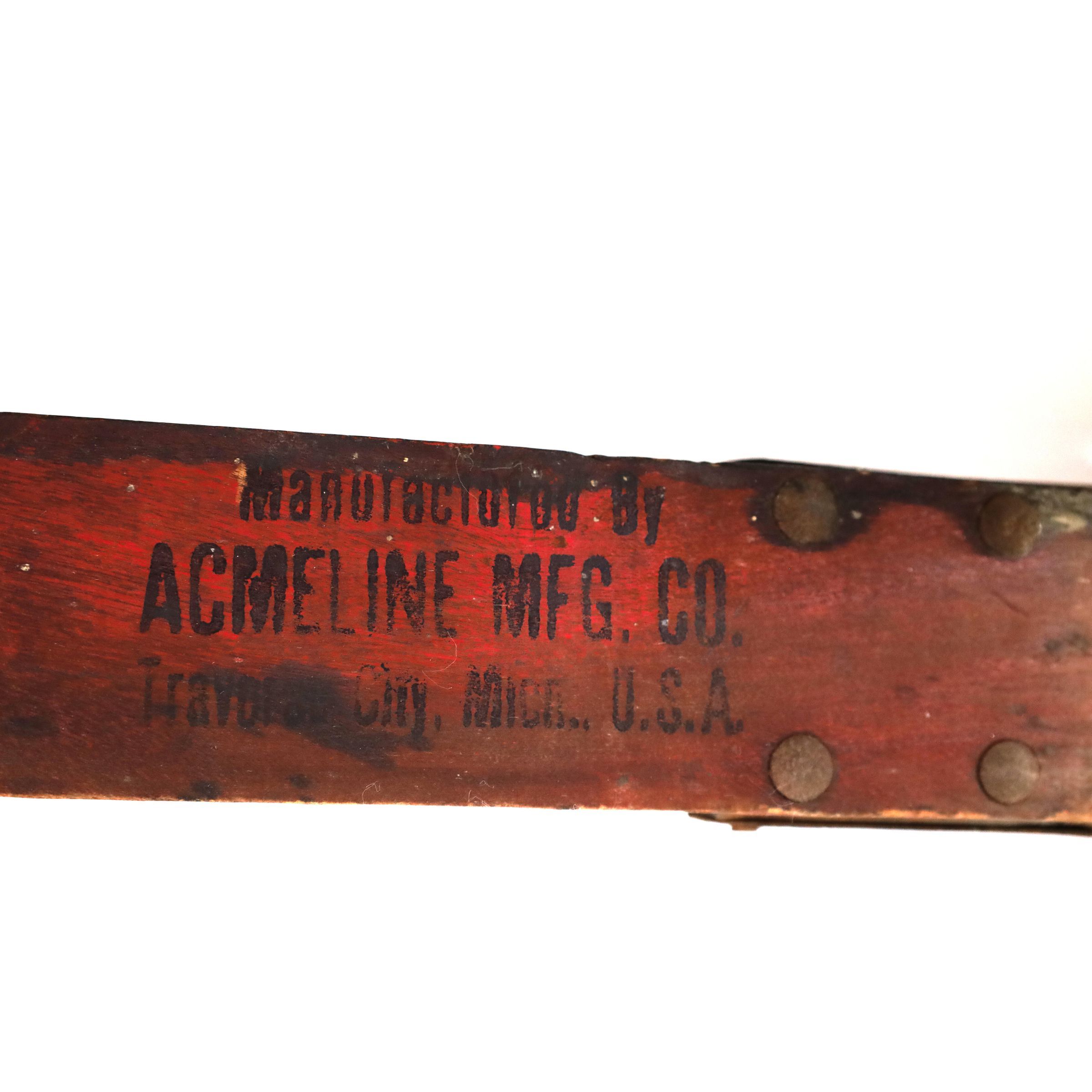 The wood plane is a 16-inch long 2x2 with a wooden handle and a 2.25-inch shaving blade. A stamp on the bottom of the plane reads "Manufactured By Acmeline Mfg. Co Traverse City, Mich. U.S.A."Location