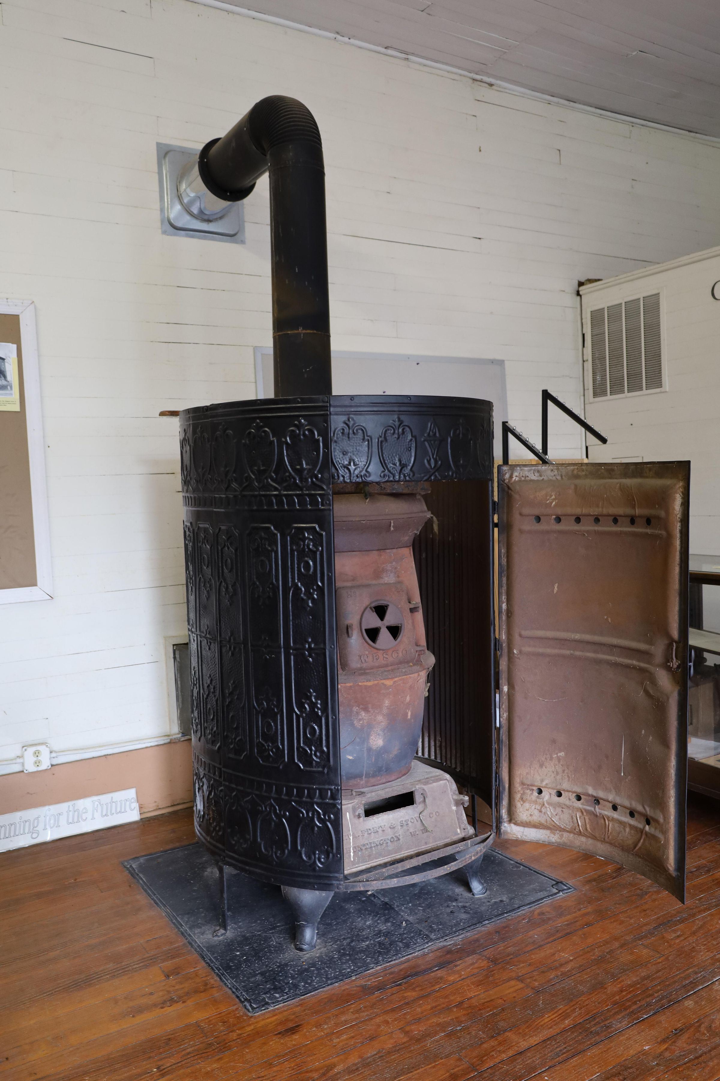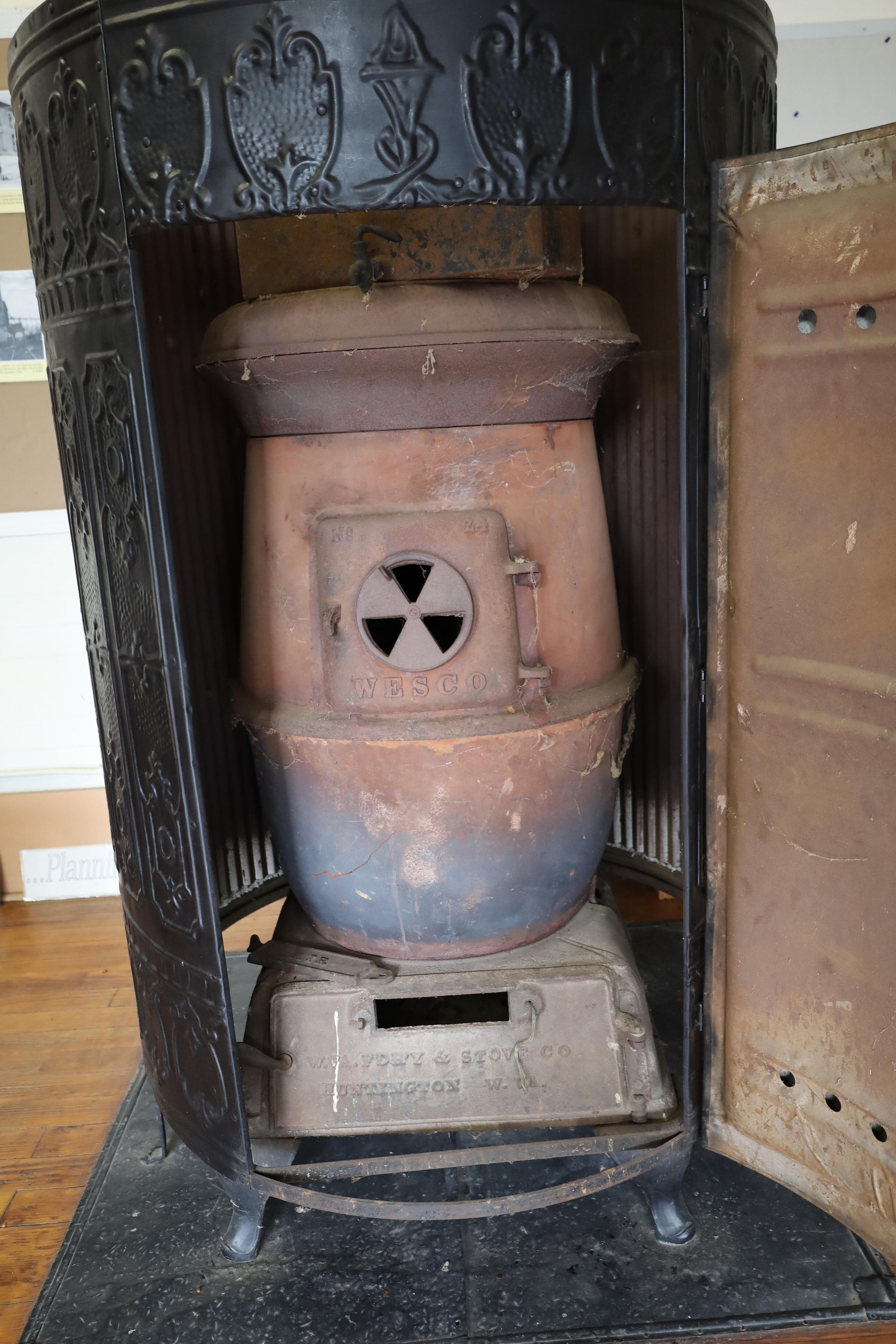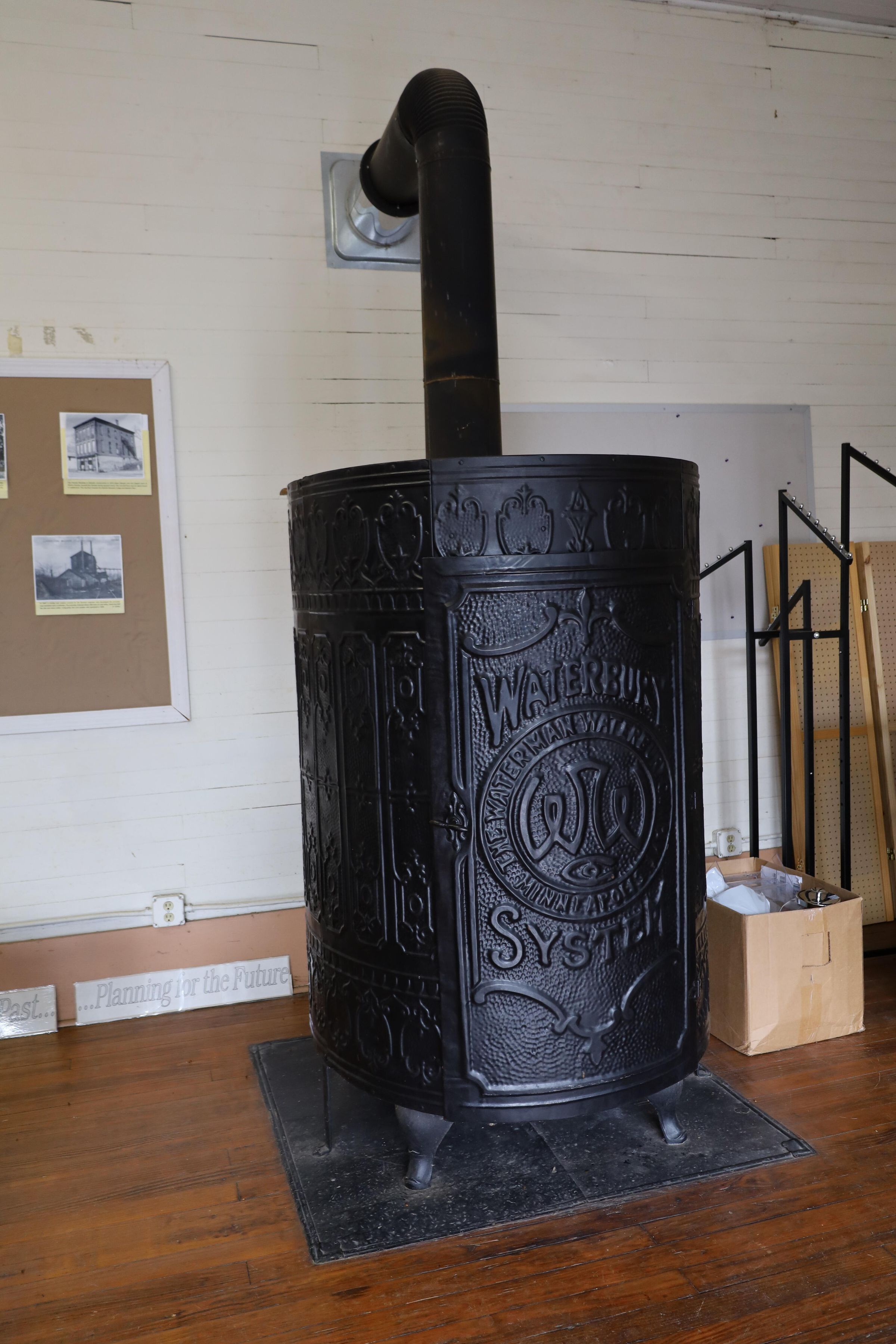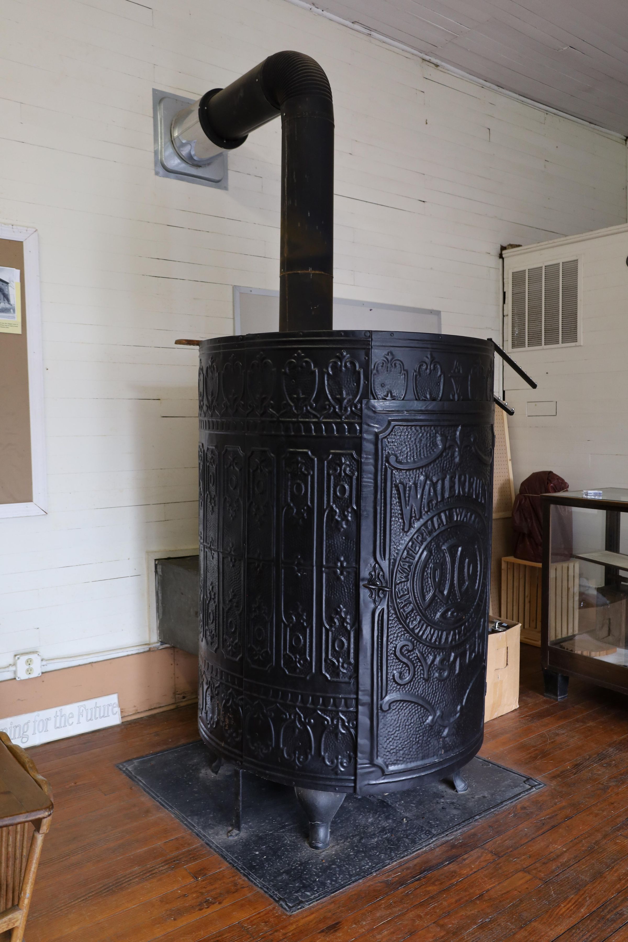 This is a cast iron stove in the 'pot belly' style with an outer insulating shell. The inner stove is marked with "West Virginia Foundry and Stove Company, Huntington, West Virginia, Number 24, WESCO" while the outer shell is embossed with "Waterbury System." According to an advertisement in the School Education journal from January 1908, the Waterbury system boasted that it was "the one right way to Heat and Ventilate your school." The Waterbury shell was intended to provide airflow that drew away harmful smoke from the classroom.Location
