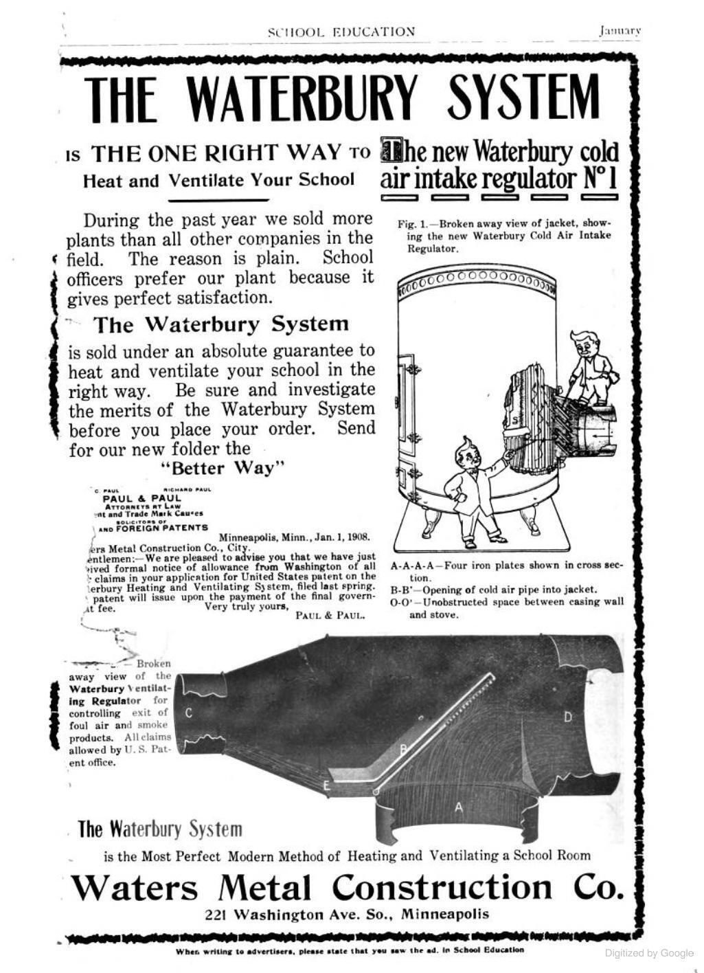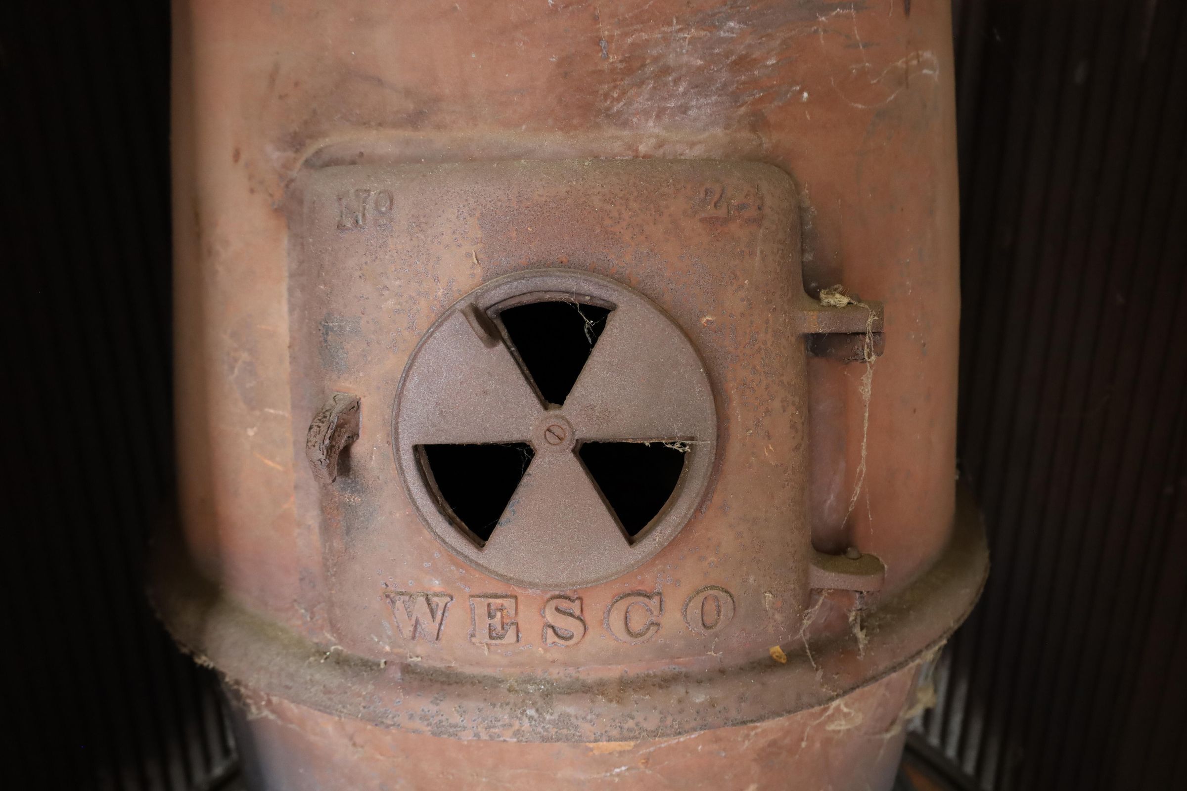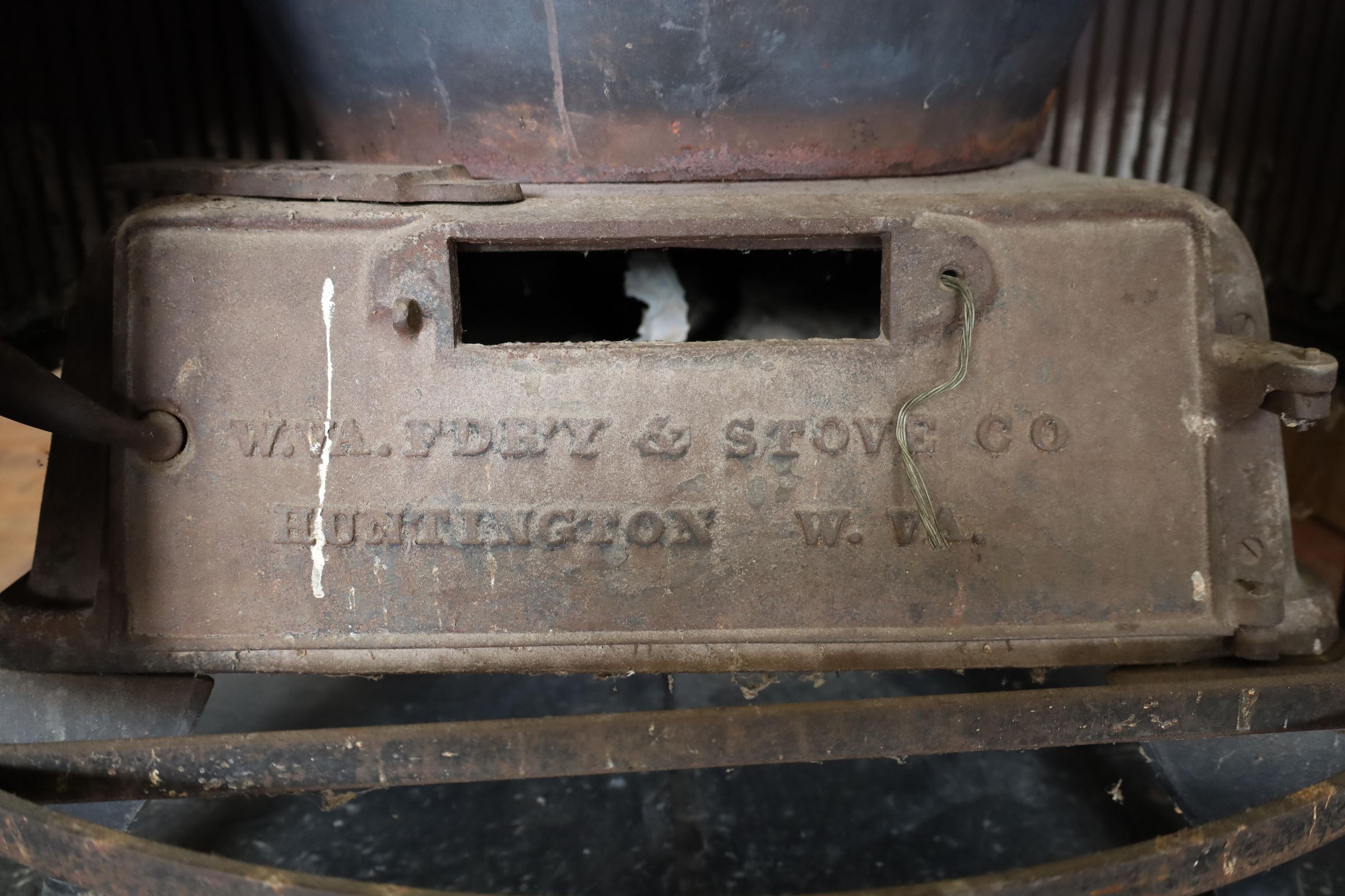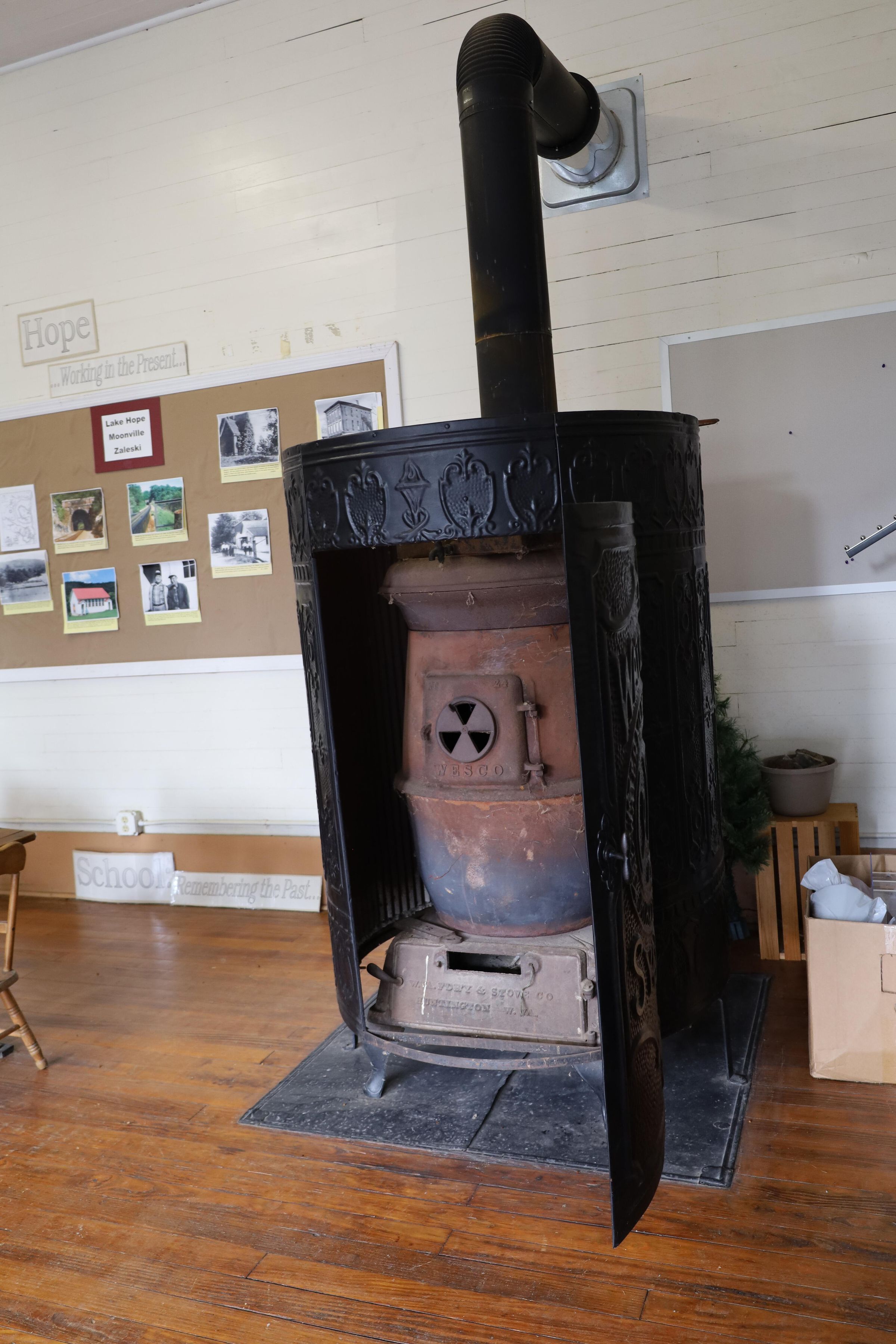 This is a cast iron stove in the 'pot belly' style with an outer insulating shell. The inner stove is marked with "West Virginia Foundry and Stove Company, Huntington, West Virginia, Number 24, WESCO" while the outer shell is embossed with "Waterbury System." According to an advertisement in the School Education journal from January 1908, the Waterbury system boasted that it was "the one right way to Heat and Ventilate your school." The Waterbury shell was intended to provide airflow that drew away harmful smoke from the classroom.Location