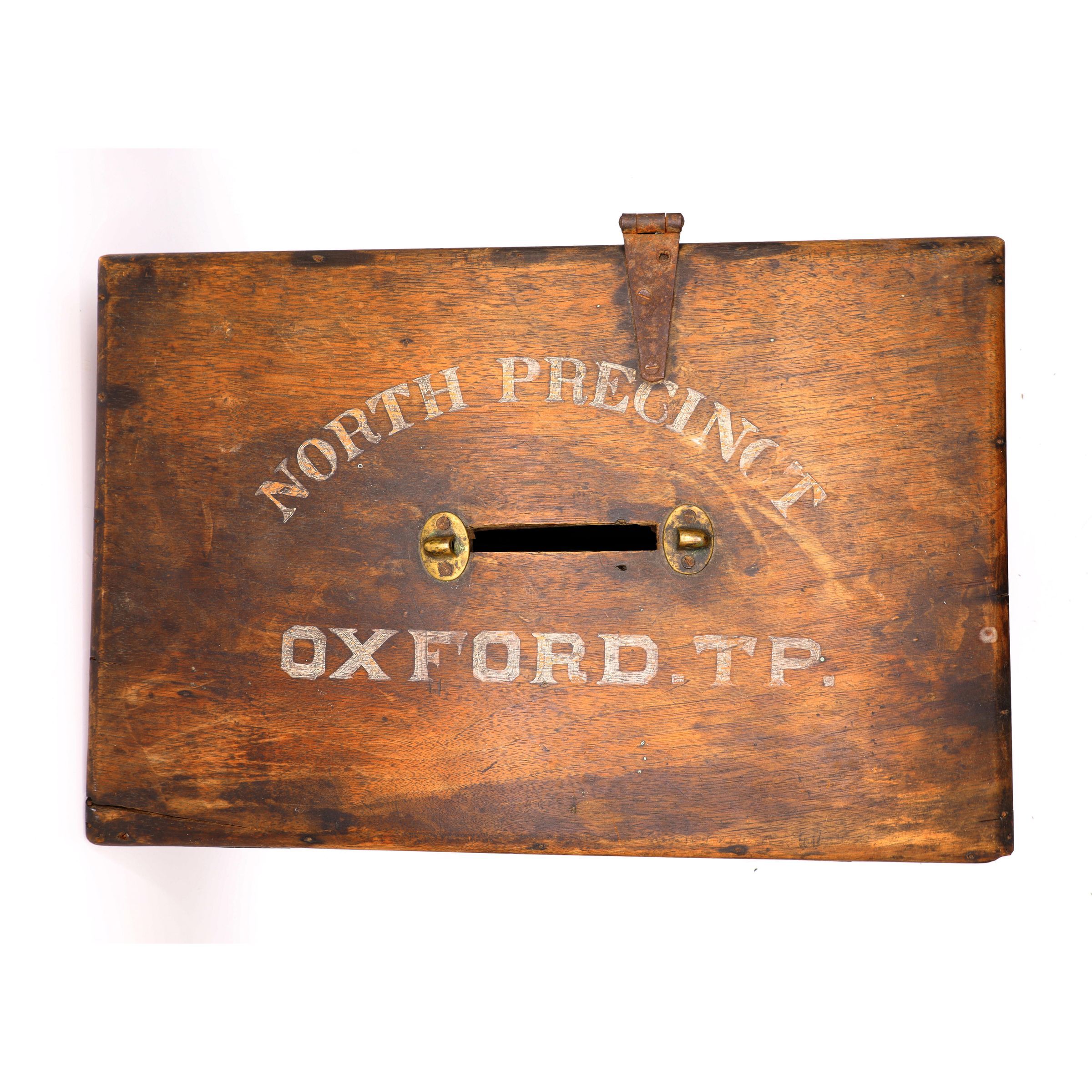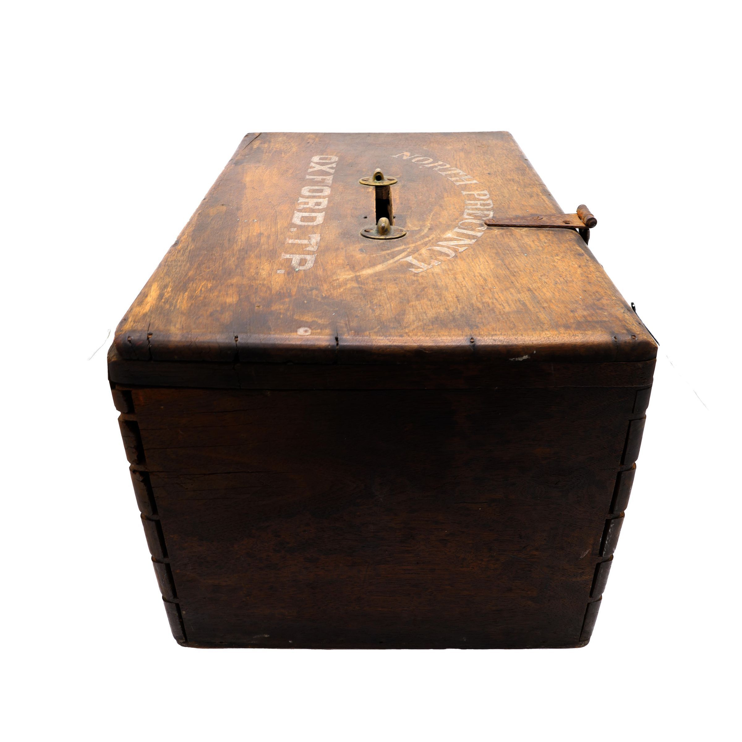This wooden ballot box for Oxford Township, Ohio, has dovetailed corners, a hinged lid, and a locking mechanism. "North Precinct Oxford TP." is lettered on the box lid.