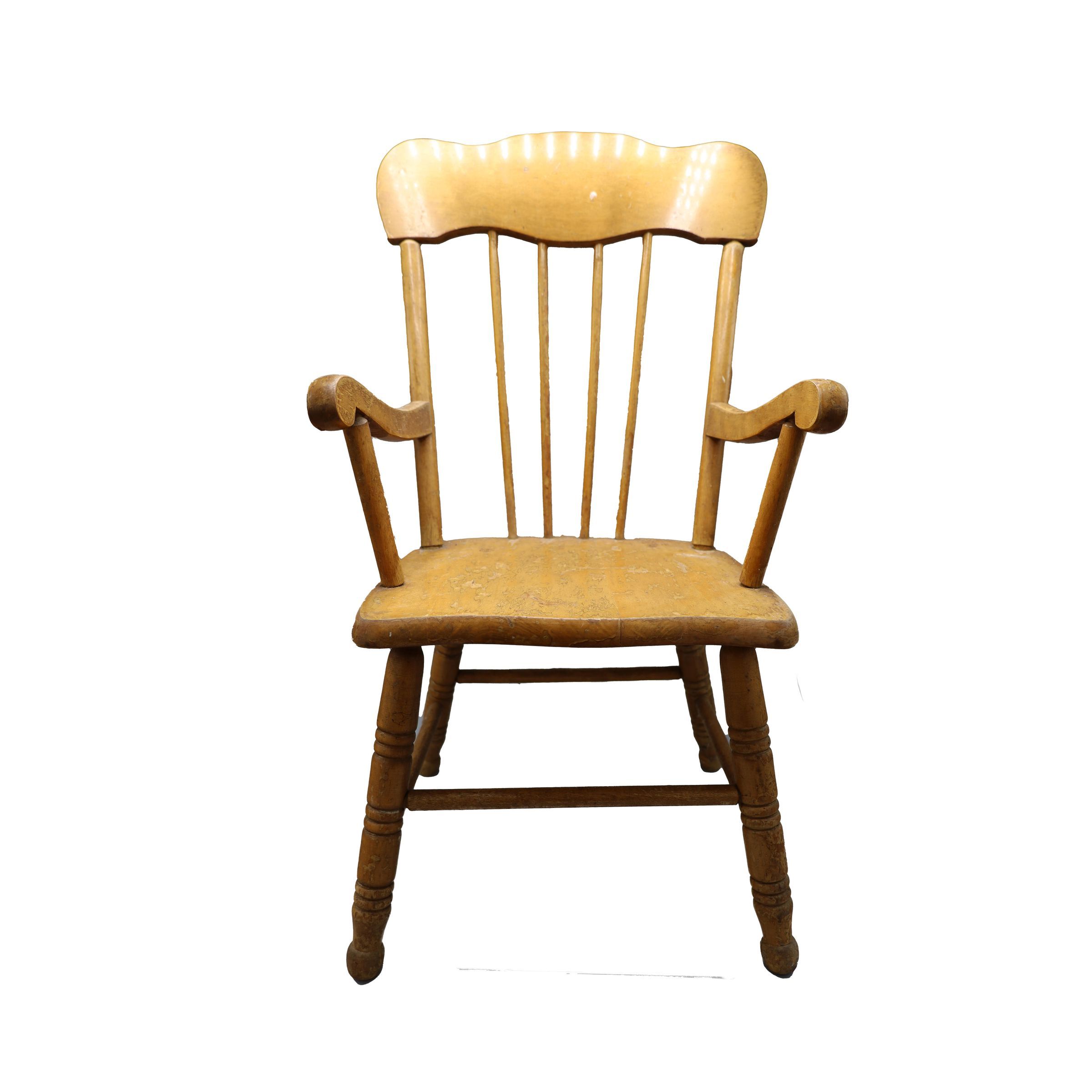 This is a child-sized wooden spindle back chair with curved arms and splayed, carved legs, and a blonde finish. There is some wear on the chair.Location
