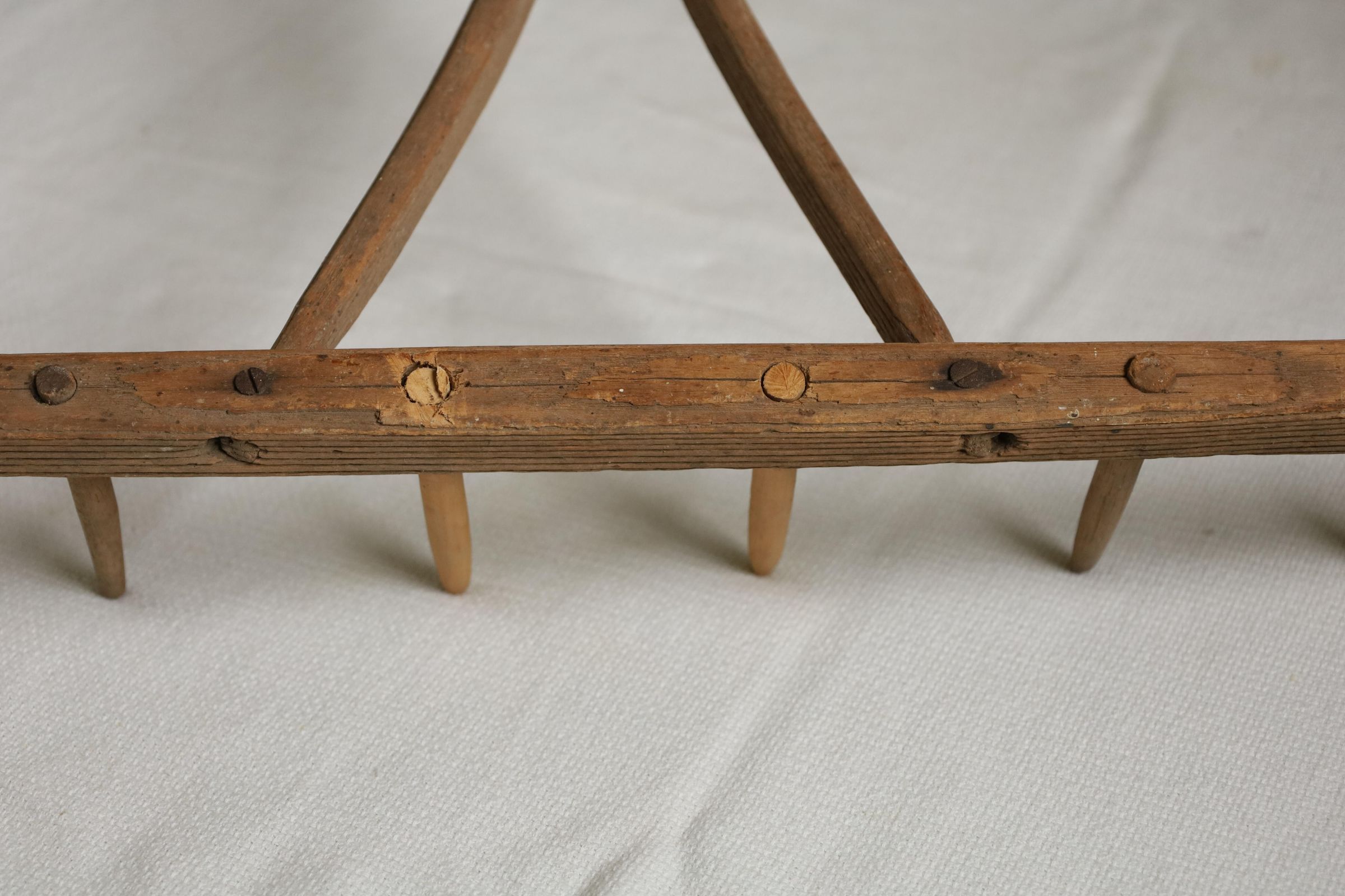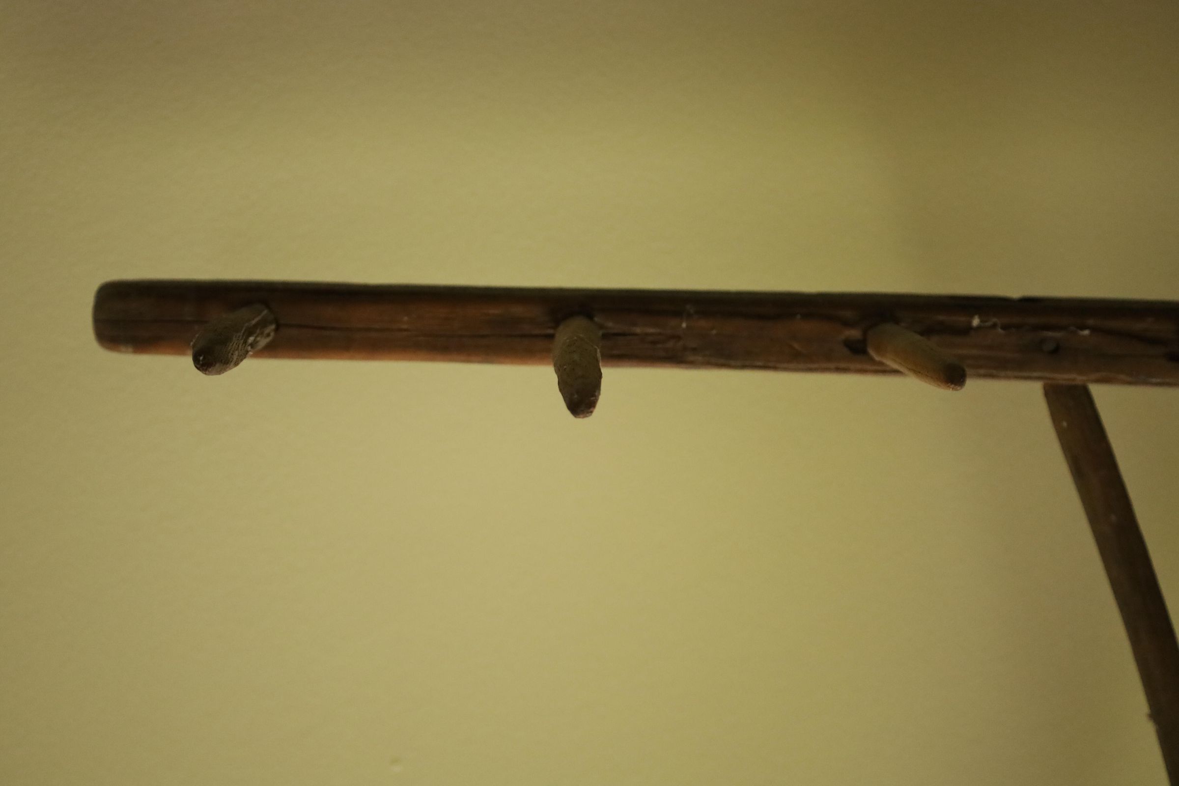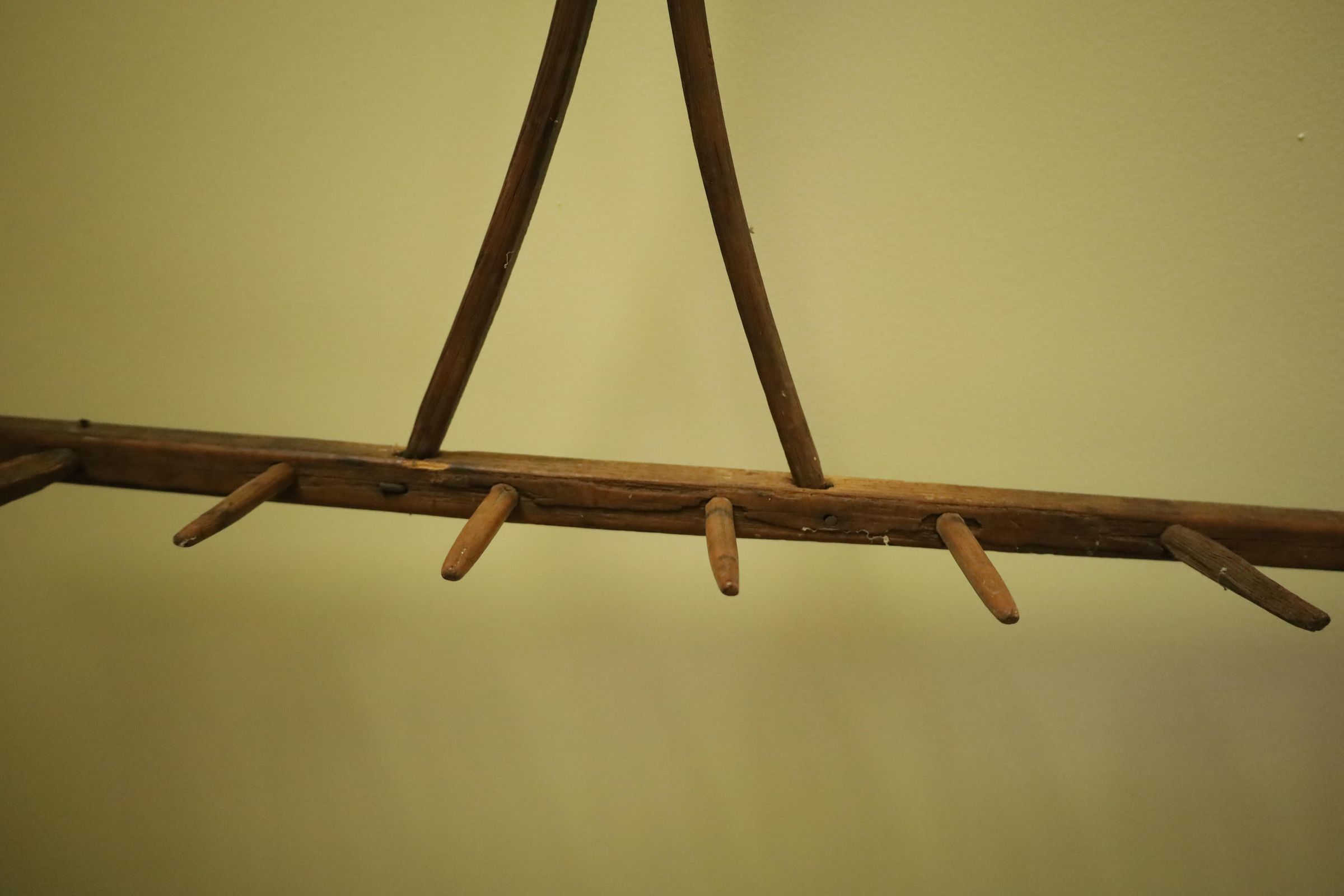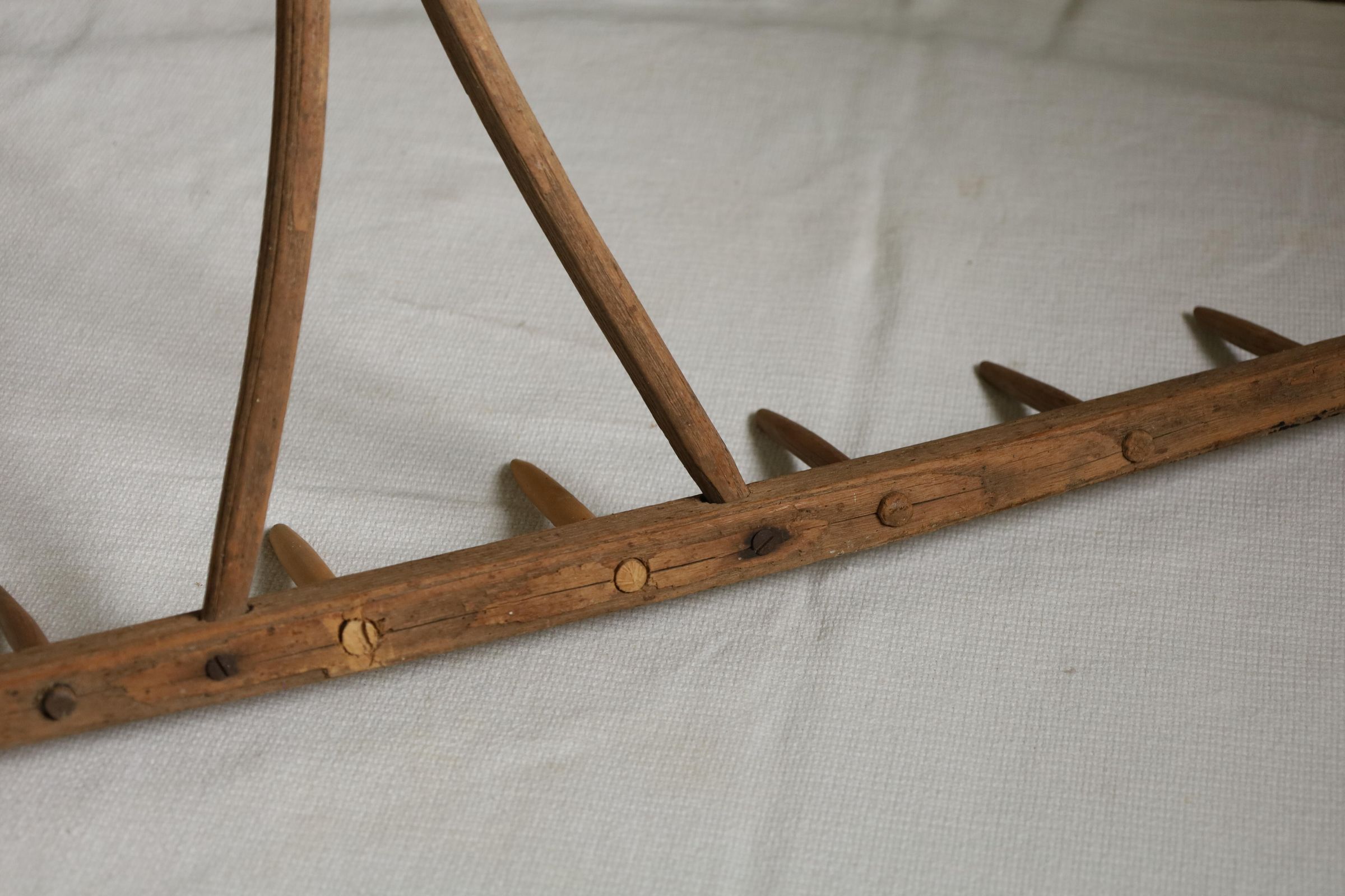 This wooden hay rake was used in the early 19th century. Farmers would cut the hay with a scythe, rake it into piles with the wooden hay rake and then pitch it onto a wagon. Little could be accomplished if you did not own a hay rake.Location