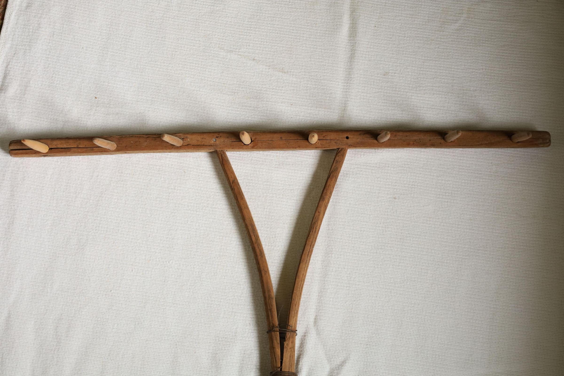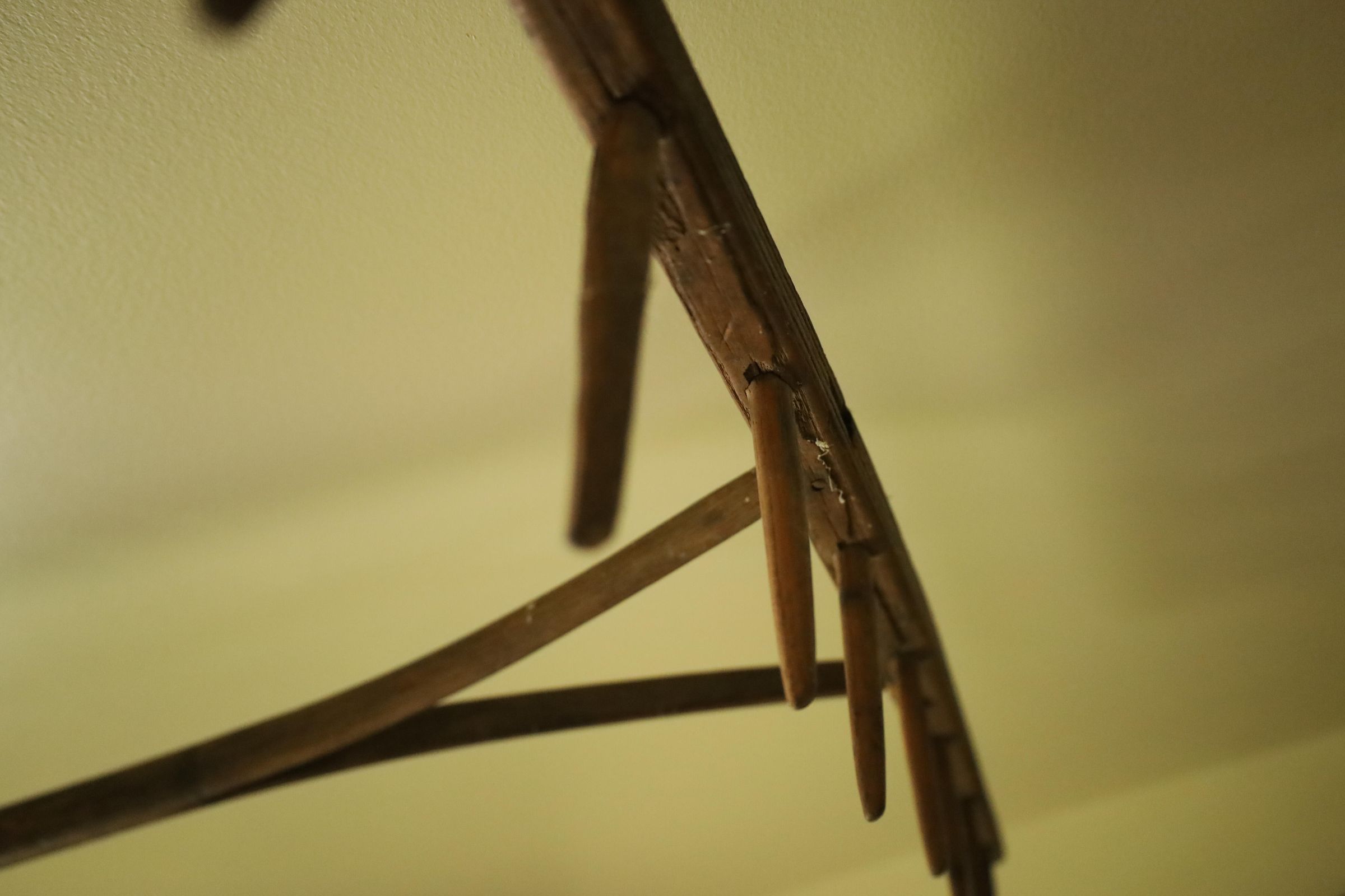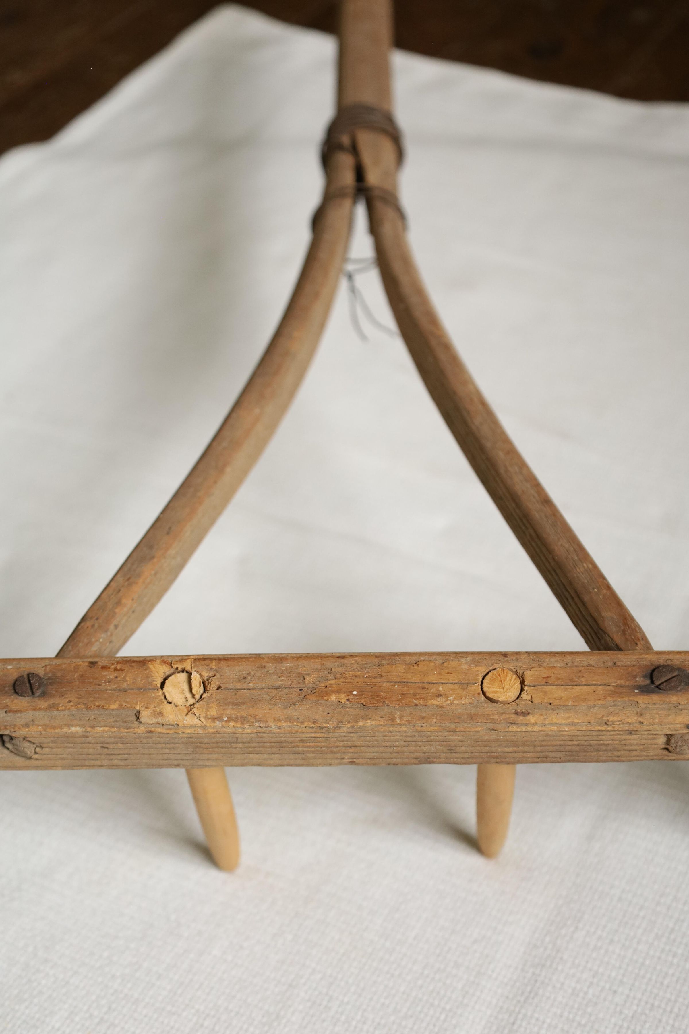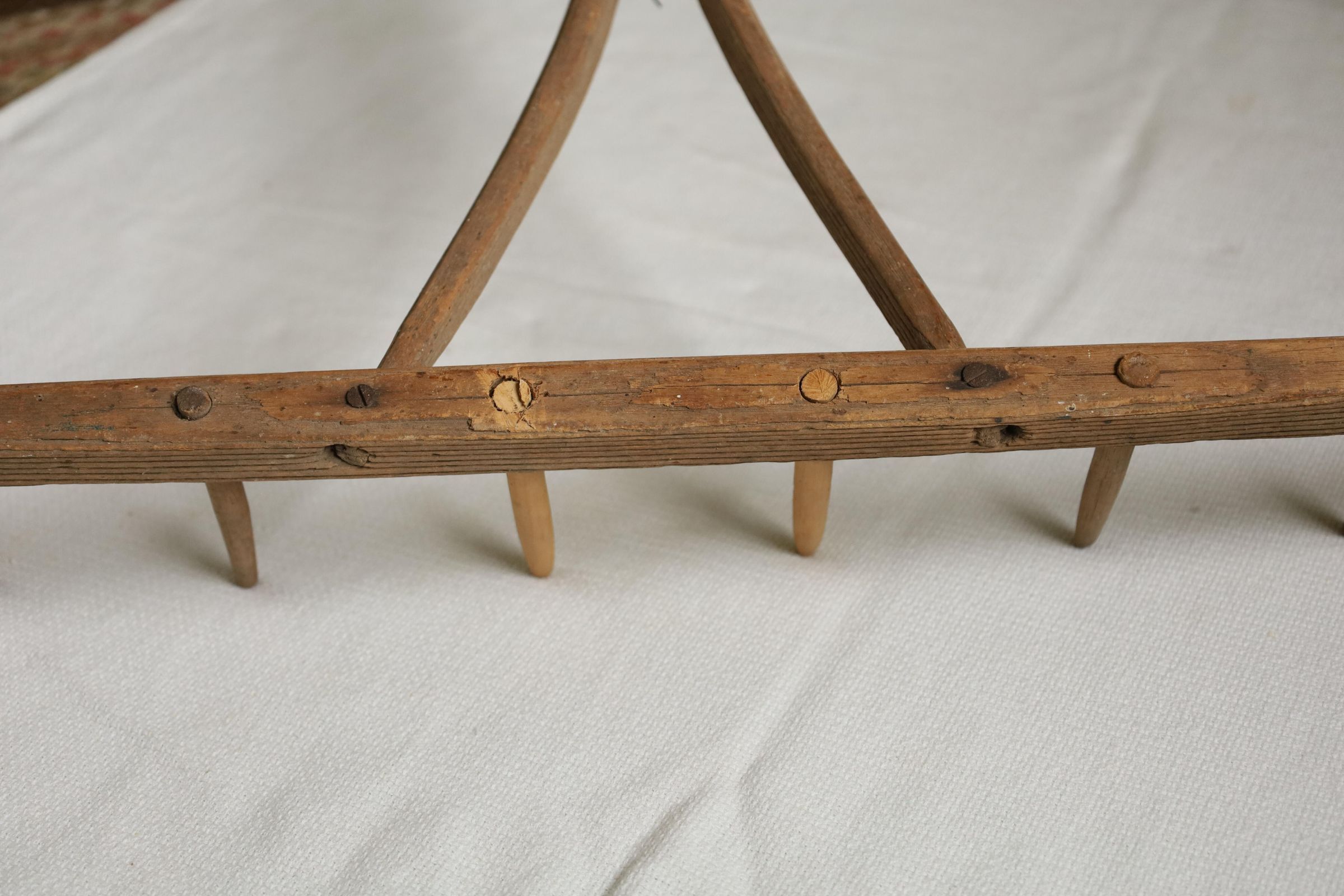This wooden hay rake was used in the early 19th century. Farmers would cut the hay with a scythe, rake it into piles with the wooden hay rake and then pitch it onto a wagon. Little could be accomplished if you did not own a hay rake.Location