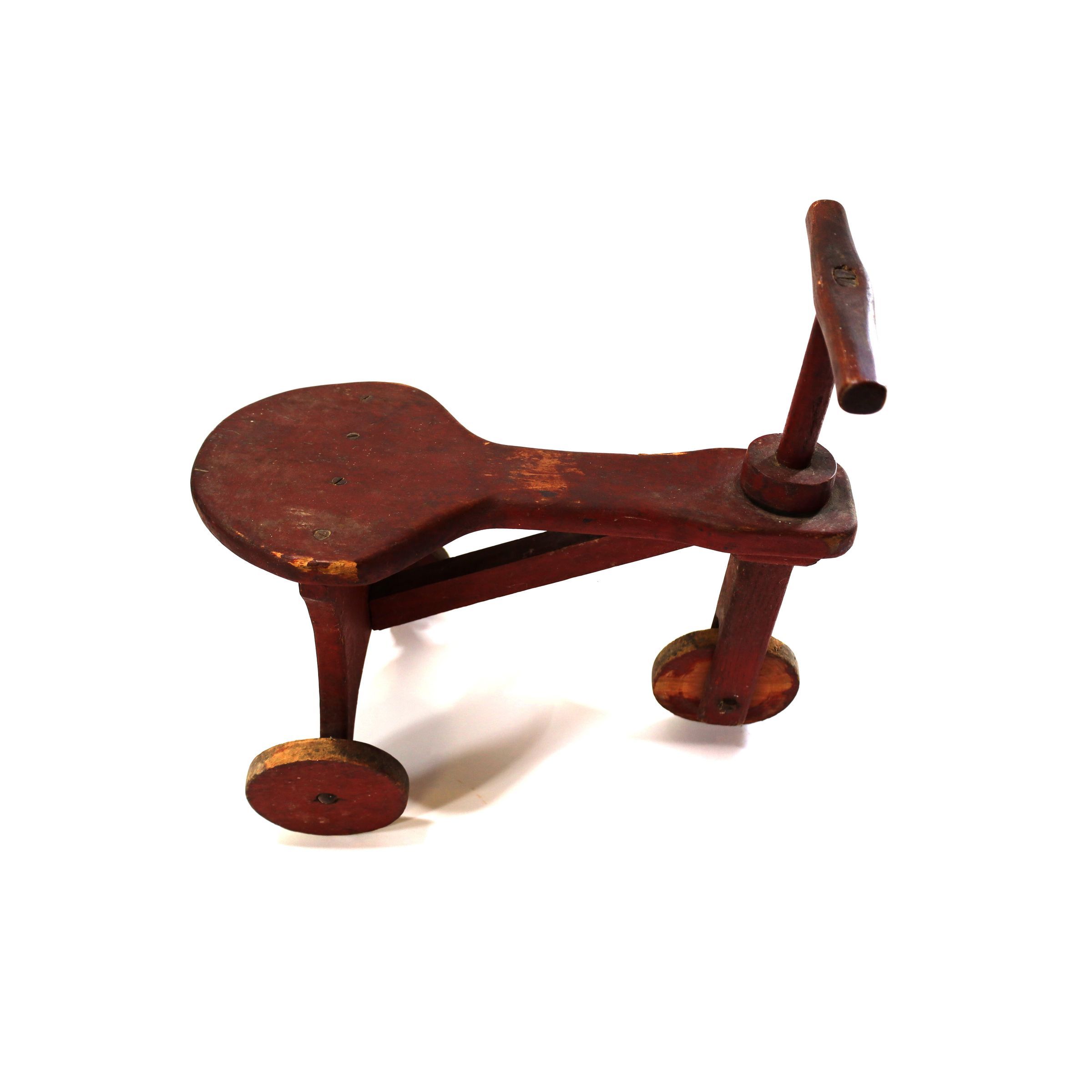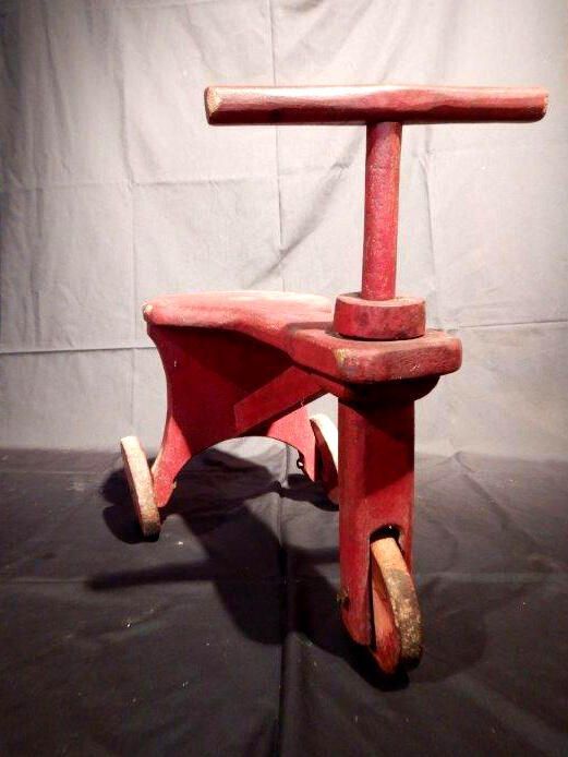 This antique wooden push tricycle is made out of an all-wooden frame and 3 wooden wheels connected the frame by metal bolts. The handlebars can be spun in either direction to allow for steering.Location