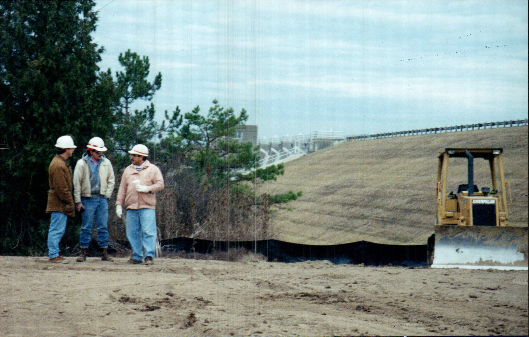 A work crew pauses to chat during a project at Delaware Dam. The earthen and concrete sections of the dam can be seen in this photograph's background.Cataloged By