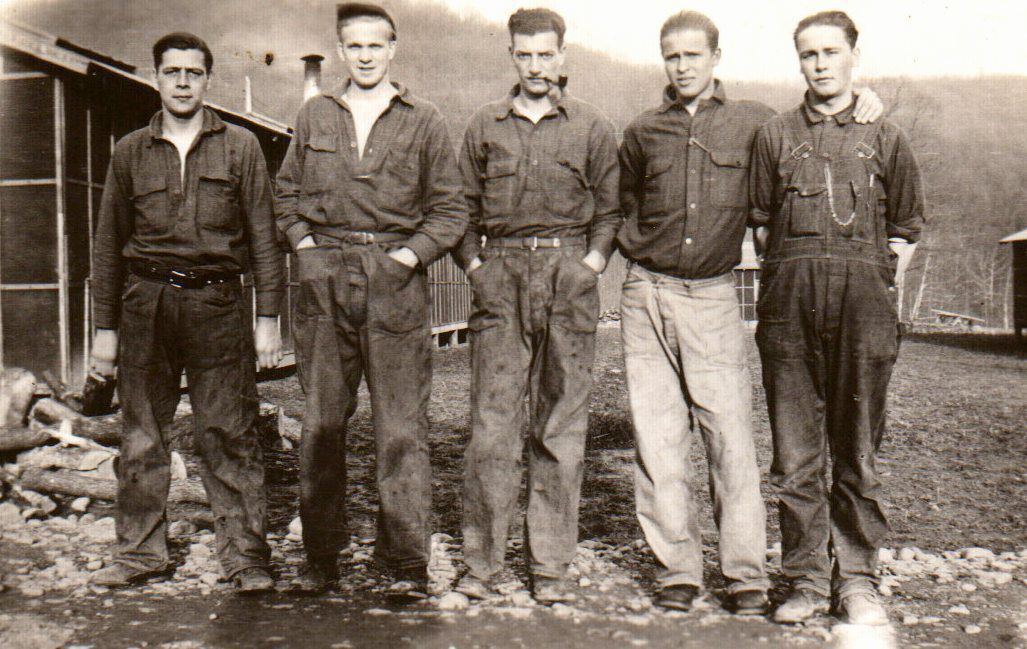 Men from the Civilian Conservation Corps (CCC) Company 503 at Camp Pike post for a photograph in their workwear. Enrollees were issued separate sets of clothing for work and leisure. These men all sport their work denim.Cataloged By