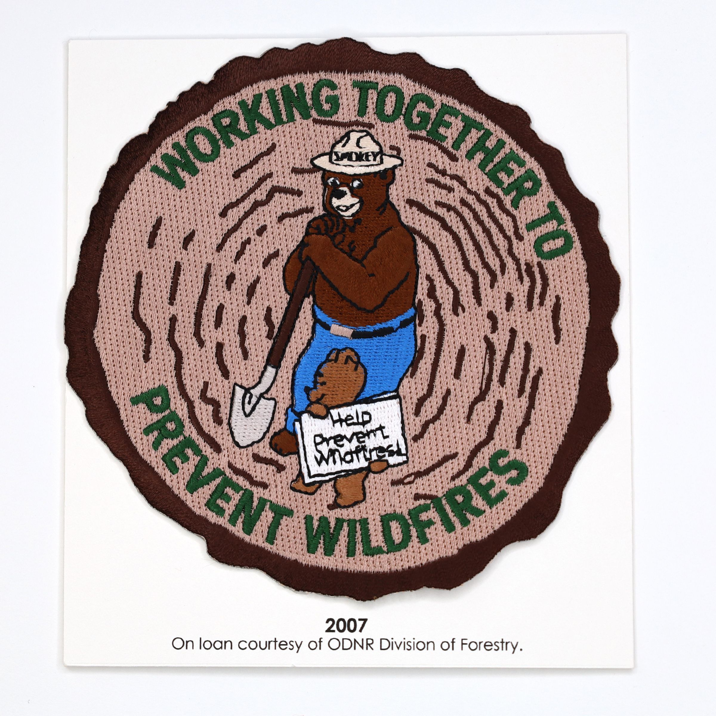 Light brown with a dark brown border to mimic the cross section of a tree and "Working Together To Prevent Wildfires" letters in dark green, this patch is 4.75-inches in diameter. The patch features Smokey Bear with a shovel, as well as a cub holding a sign that reads "Help prevent wildfires!" While the cub might receive an "A" for effort on his sign, he doesn't quite spell his message correctly.