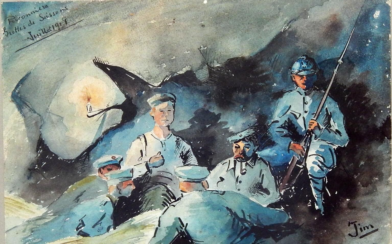 This small watercolor is simply signed “Jim” in the lower right corner. In the upper left corner are the French words “Prisonners Grottes de Soissons Juillet 1918” This translates to “Prisoners, Cave of Soissons, July 1918.”