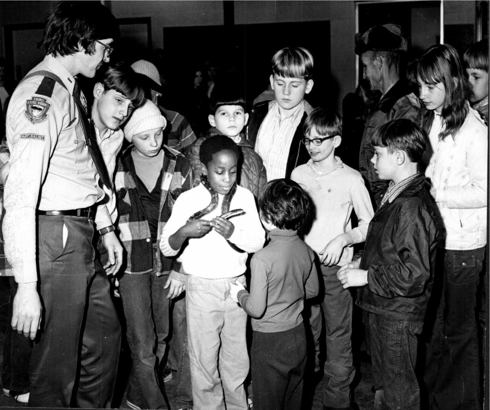 A park naturalist at Dillon State Park has transferred a snake to a young boy. The boy wears the snake like a scarf and other children crowd around, interested to interact with this sociable serpent.Cataloged By