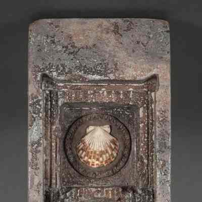 The photo depicts an unusual artifact--a weathered stone slab featuring two carved clam shells within decorative frames. The upper shell is patterned and lighter--more pronounced--while the lower shell appears darker and blends with the stone. The overall texture of the slab is rough, with visible signs of erosion and aging, displaying a mix of brown, gray, and white hues. The intricate detailing around the shells holds the viewers attention.