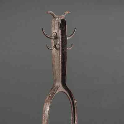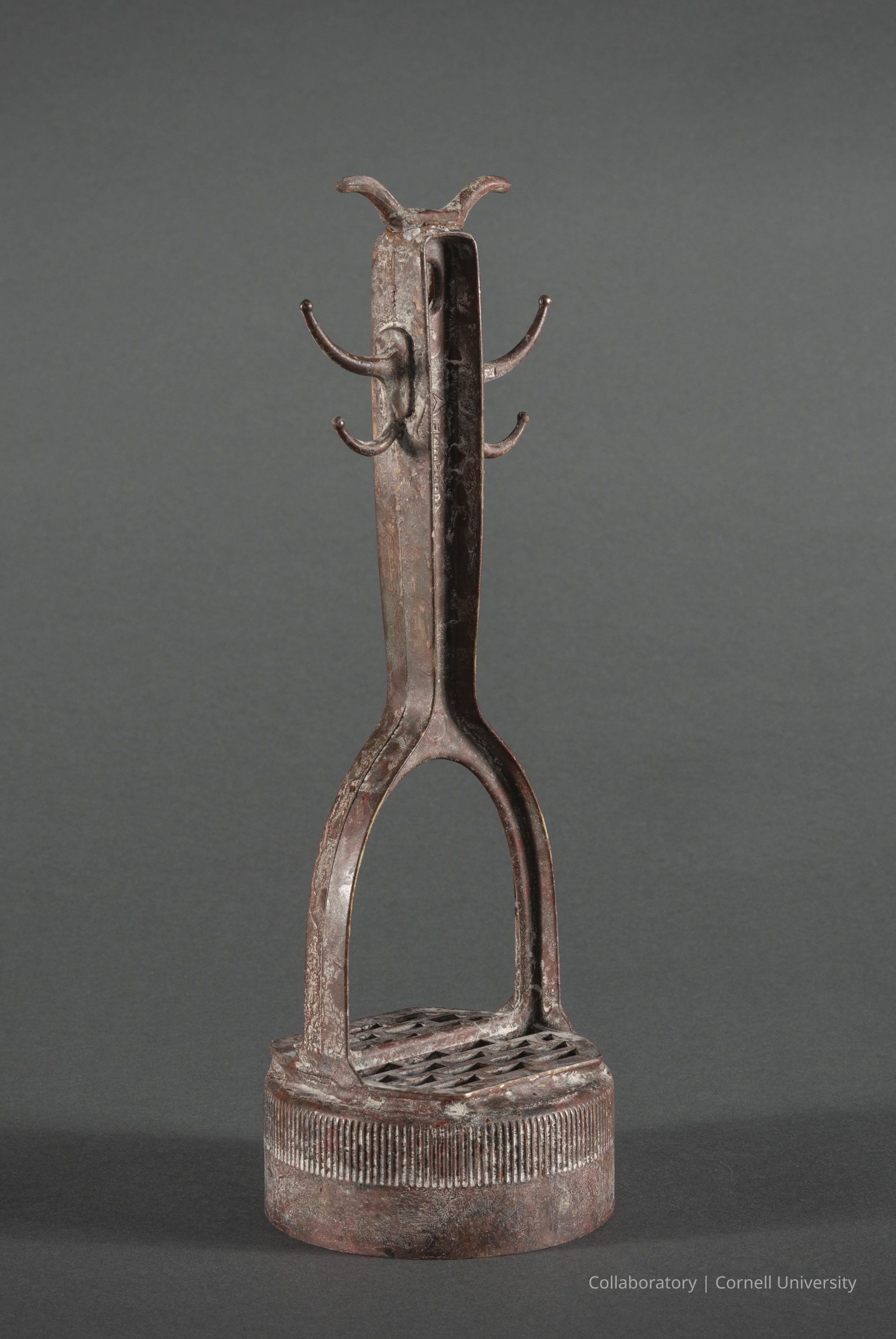 The image displays a rusted metal artifact representing the iconic ceremonial dwarf monster of Llhuroscian lore. It features a distinctive head with horns or antlers and two pair of arms. Its elongated body is seated on a rounded, grille-like base with ribbed detailing. The object is set against a formal gray background.