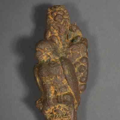 The photo depicts an ancient, weathered ceramic artifact with a rough texture and a brownish hue; its surface features intricate patterns and what appear to be small, abstracted figures perhaps a parrot and lion, evoking a sense of mystery and hinting at a possibly ancient cultural origin; the object's uneven texture suggests the passage of time, while its distinctive shape and carvings could imply it served a specific, yet perhaps merely a decorative purpose; It is set against a neutral gray background. -------------------------------------------------------------------------------------------------------------------------- This ceramic piece was probably the upper decoration of a fulcrum. Llhuroscian reclining couches (klirzai) were, typically, adorned with fulcra. These decorations, especially by Naciremian craftsmen, were whimsical, usually with references to the ancient bird god, Aar-Teen. In this fulcrum there is the unlikely congress of the giant "ernon" of the genus Psittacus and the stunted breeds of lion and bear. [1972 Exhibition Catalog]