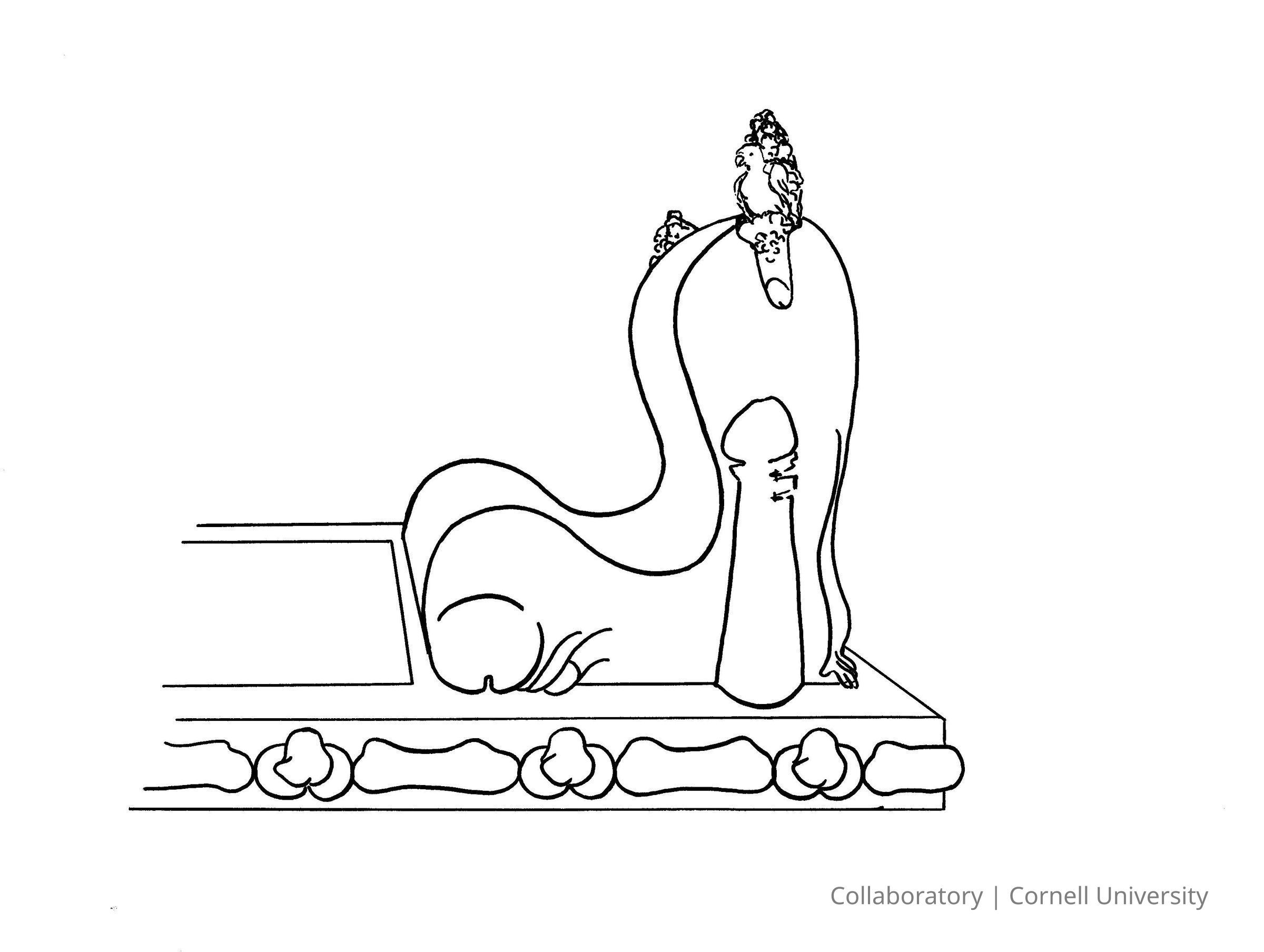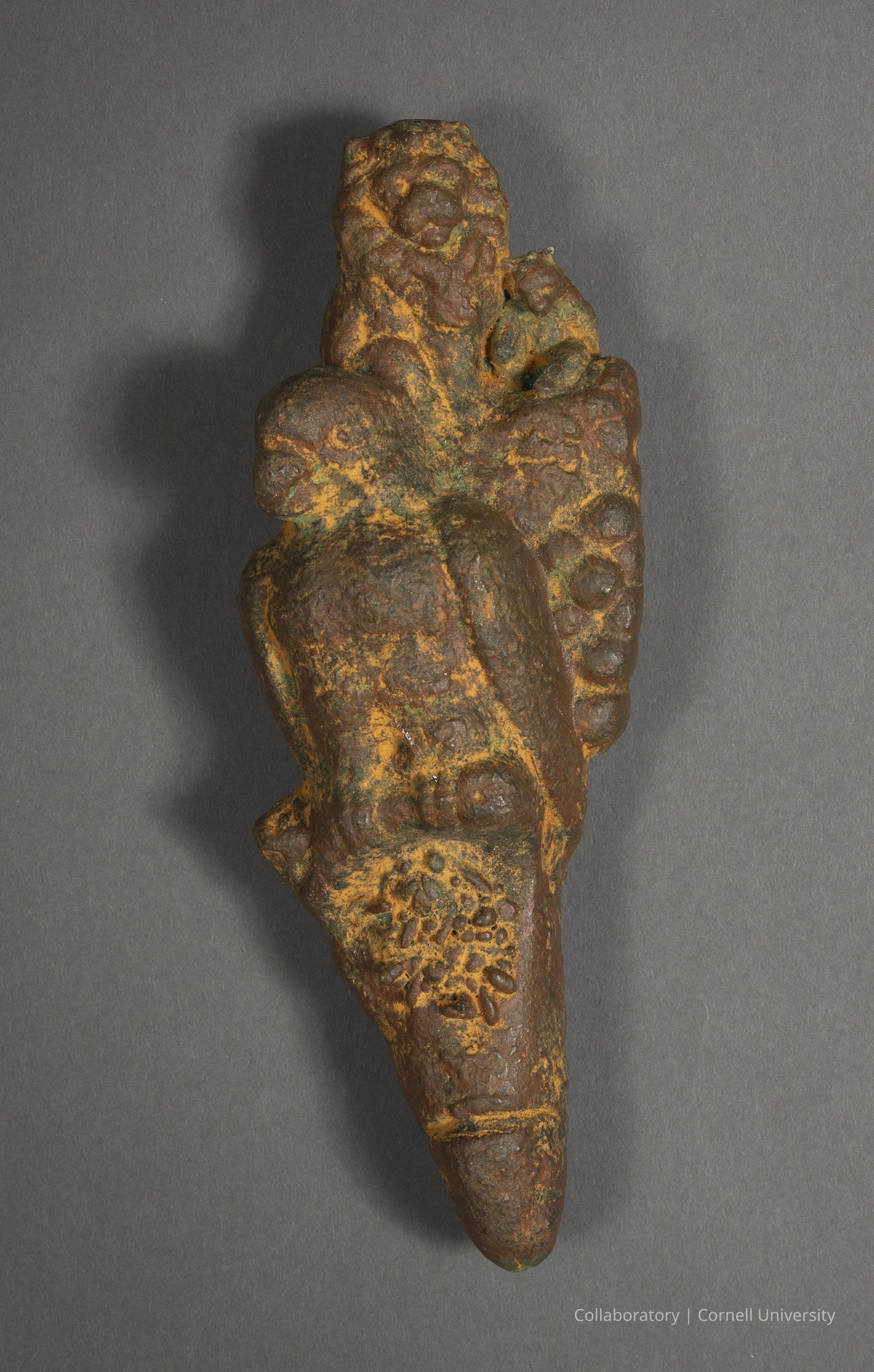 ![FRAGMENT OF A FULCRUM (Headboard) | 1969 | Photo by Ann Cady, 2024 | ©2025 Cornell Univsersity: The photo depicts an ancient, weathered ceramic artifact with a rough texture and a brownish hue; its surface features intricate patterns and what appear to be small, abstracted figures perhaps a parrot and lion, evoking a sense of mystery and hinting at a possibly ancient cultural origin; the object's uneven texture suggests the passage of time, while its distinctive shape and carvings could imply it served a specific, yet perhaps merely a decorative purpose; It is set against a neutral gray background.