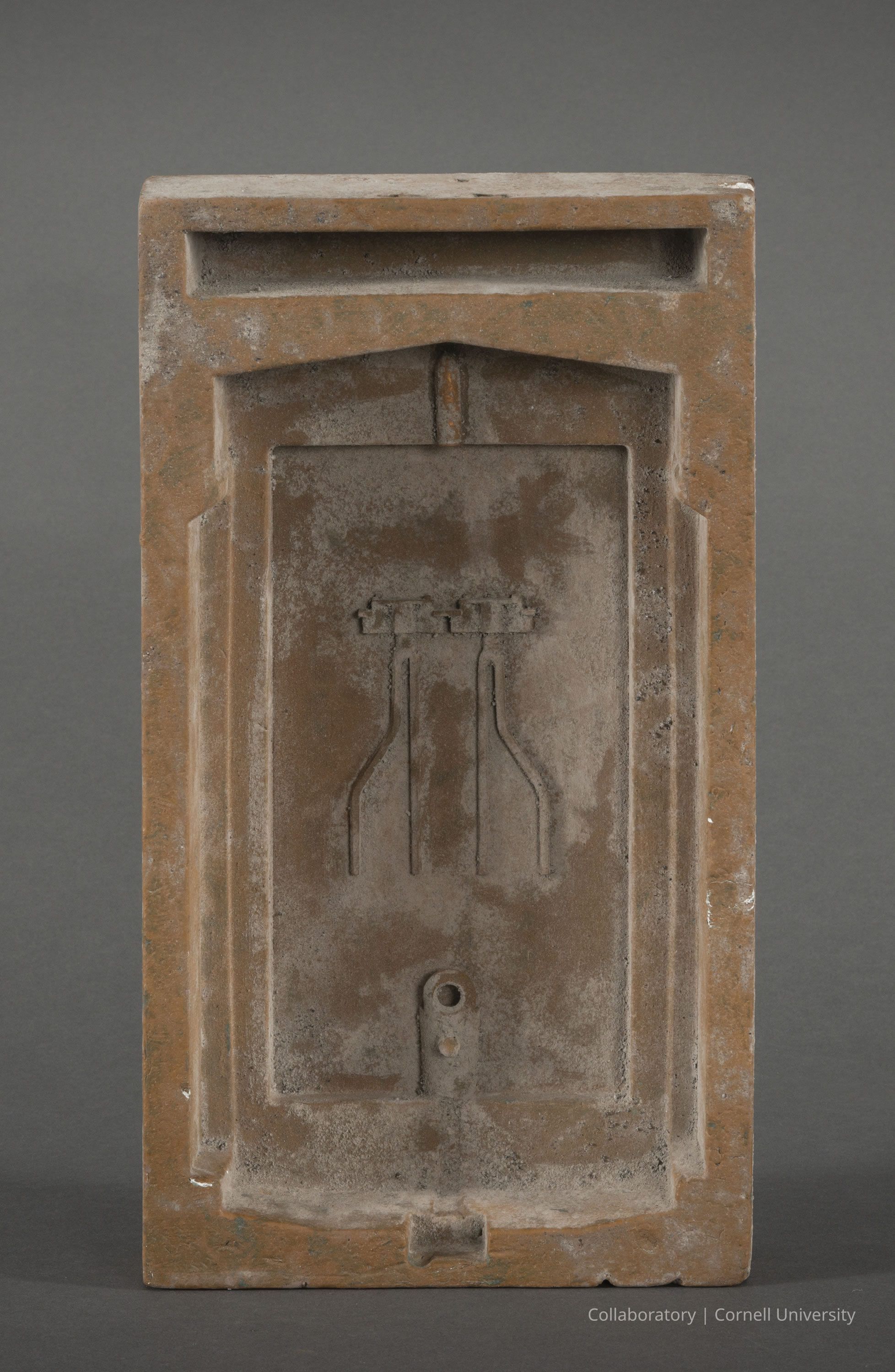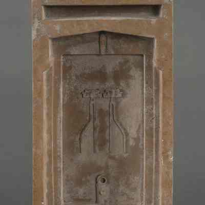 The photo depicts a rectangular, weathered stone relief with a slightly raised border and a recessed central panel, symmetrical lines leading into geometric shapes, resembling simplified architectural elements, set against a dark grey background, with the entire piece exhibiting signs of age and natural wear, giving it a historical and ancient appearance that suggests it may have been used as a decorative or functional architectural element in a historical building or structure, highlighting human craftsmanship and artistry from a bygone era.