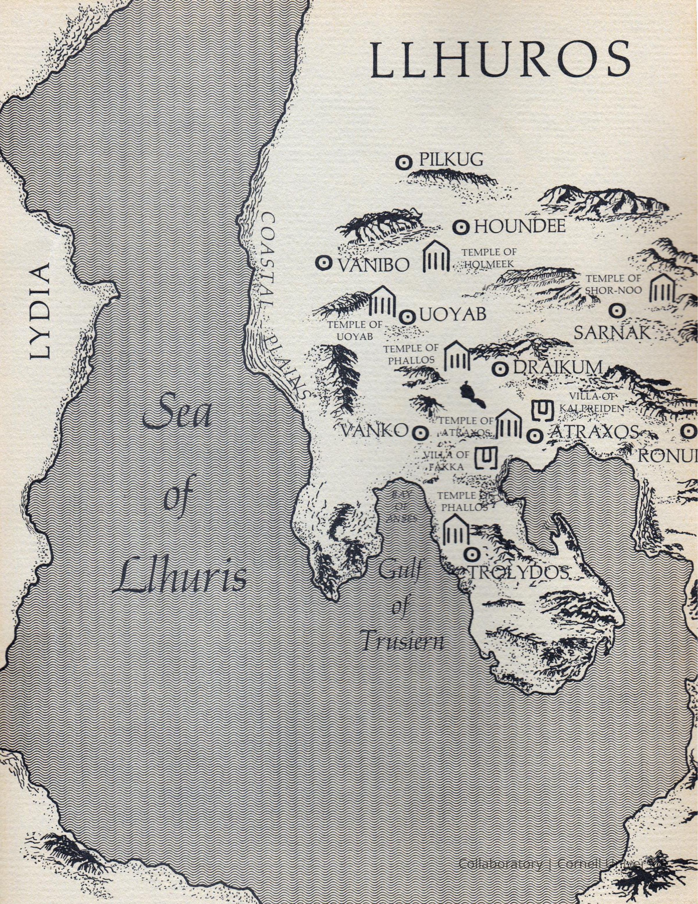 The image features a detailed map of "Llhuros," a land bordered by "Lydia" to the west and showcasing the "Sea of Llhuris" and the "Gulf of Trusiern." Various sites are marked, including temples, villas of tyrants, and mountains spread across the terrain, each labeled with distinct names like "Temple of Holmeek" and "Villa of Fakka." The map is styled with intricate topological features.