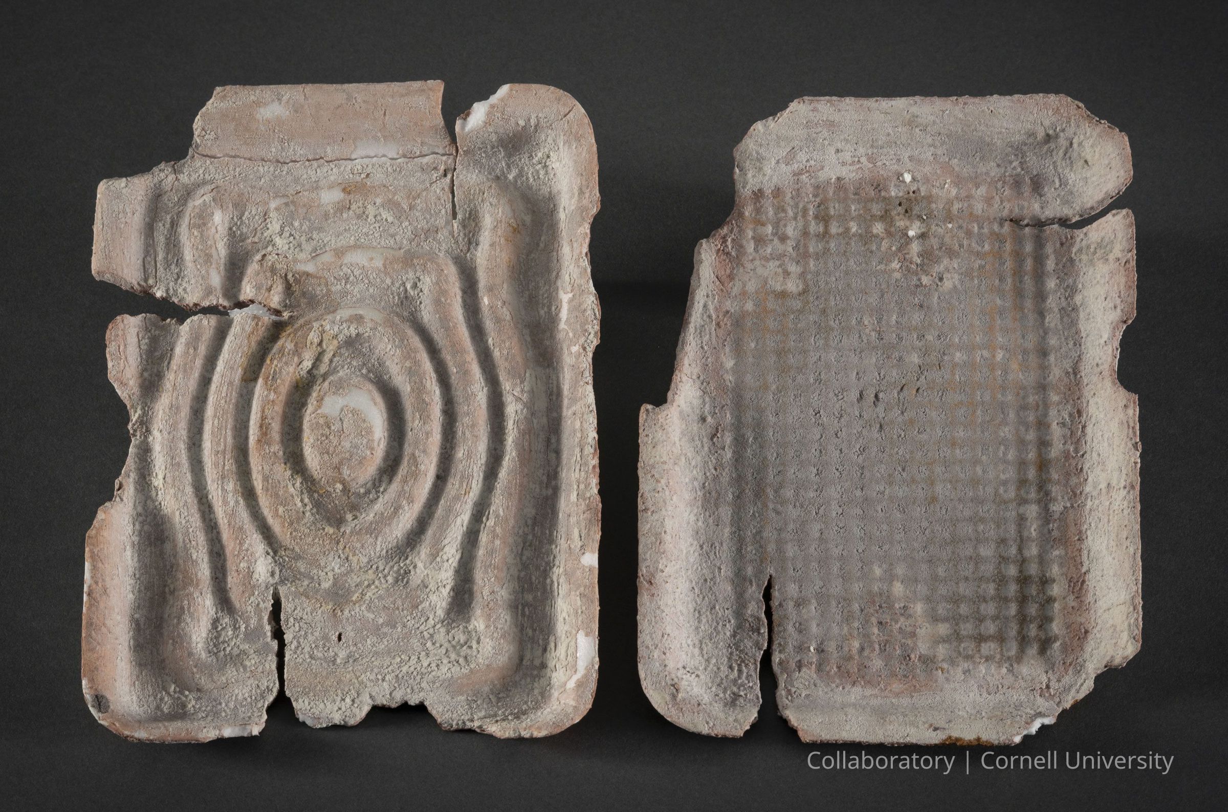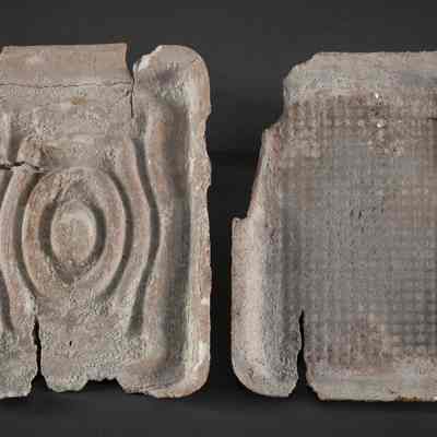 The photo depicts two ancient, weathered trays with distinct patterns; the left mold features concentric oval and circular designs with significant erosion and cracks, while the right mold has a grid-like texture with similar wear, each displaying unique texture and erosion patterns, and set against a dark, neutral background that highlights their intricate details and aged, rough surfaces, evoking a sense of a bygone era. ---------------------------------------------------------------------------------------- [1972 Exhibition Catalog]The depressions held juices of spices and herbs for 516 cures in a single tray. Such trays are believed to have been used earlier by the Uoyabian priesthood that was famed for its intricacies of gastronomy. These were found at the Temple of Holmeek in the excavations at Houndee in 1966 by the Swedish Institute of Archaeological Science and Research.
