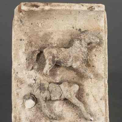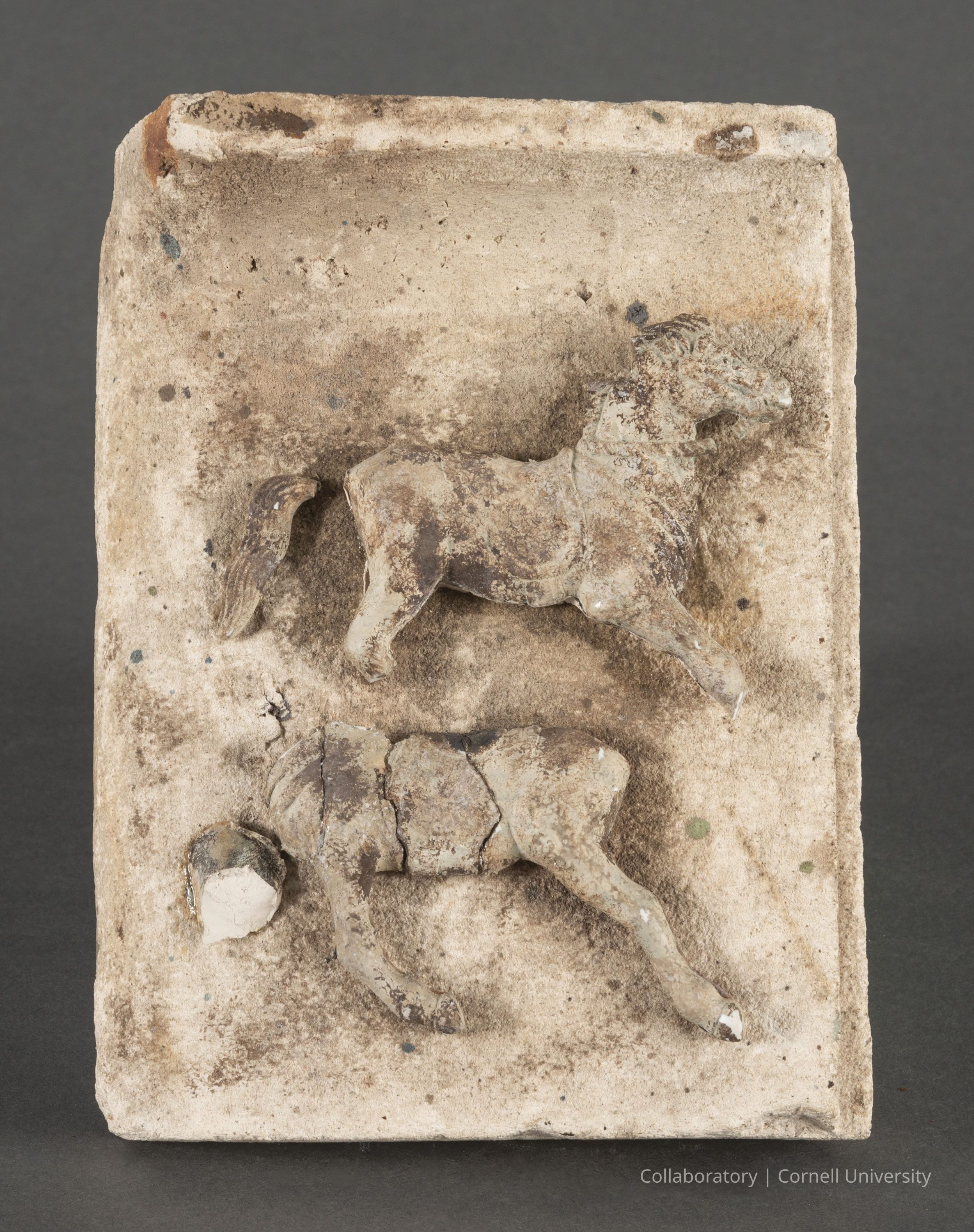 The photo shows a rectangular, textured stone relief depicting two fragmented horse figures, one above the other; the top horse appears slightly more complete than the bottom, with visible heads and limbs, though both exhibit signs of wear and erosion, indicating age; the surface of the stone displays varied shades of beige and gray, speckled with darker spots, contributing to an impression of antiquity; the overall texture is rough and weathered, suggesting it may be an archaeological artifact. -------------------------------------------------------------------------------- [1972 Exhibition Catalog] Karl Louis Aftman suggests that despite the equine naturalism, the plastic simplicity makes an earlier dating more likely ("Some Aspects of Llhuroscian Architecture," p. 216).