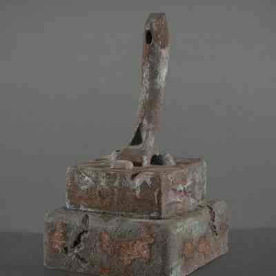 A rustic, weathered, double-pedestal form with an erect phallic shape on top, exhibiting signs of rust and oxidation; the top layer is somewhat smaller compared to the base, which rests on a flat surface; together they create a geometric form with clearly visible, irregular patches of corrosion, providing a textured appearance against the plain, neutral backdrop. The phallic shape suggests its use as a votive in a temple, perhaps the Temple of Phallus at Trolydos.