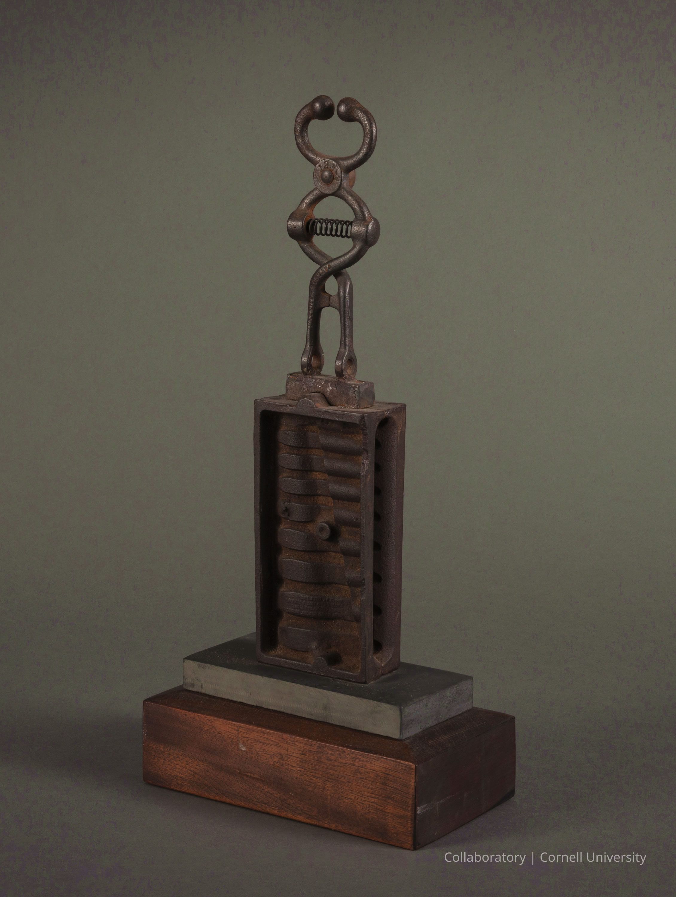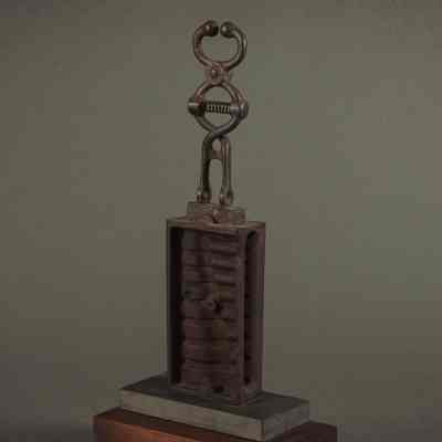 The photo, thought to be a representation of the Llhuroscian god Shor-Noo, features a metal artifact comprised of a rectangular section with vertically stacked, rounded segments, topped by a stylized humanoid-like metal figure with a spring-like torso and spherical elements at the top, possibly representing a head. The artifact is displayed on a two-tiered wood and slate base.