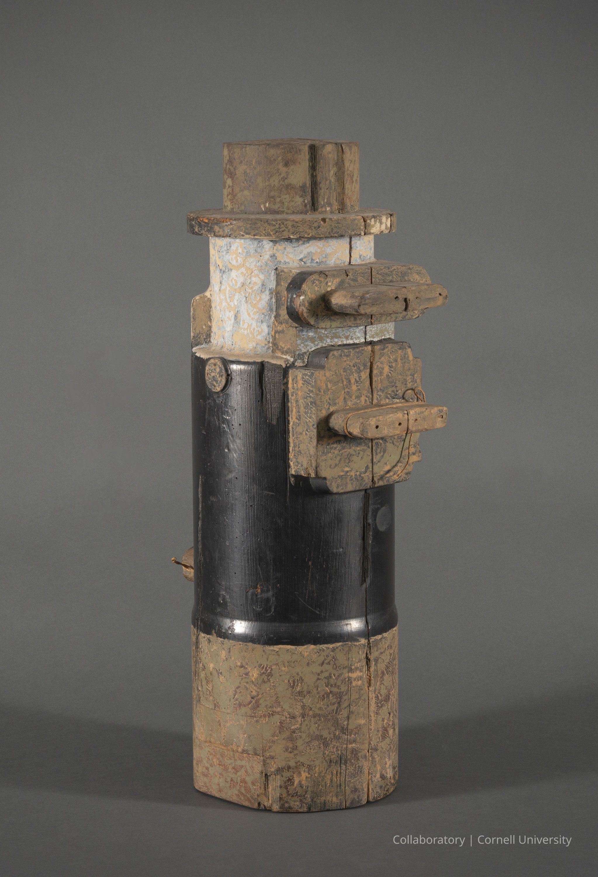 The photo features a weathered and rustic anthropomorphic artifact consisting of assorted wooden and metallic parts, including what appear to be flaking paint layers, cylindrical and block-like components of varying textures and colors, assembled to resemble a torso with extended arms and a face-like top. The combination of elements suggests exudes an aura of historical depth and handcrafted individuality against a neutral gray background.
