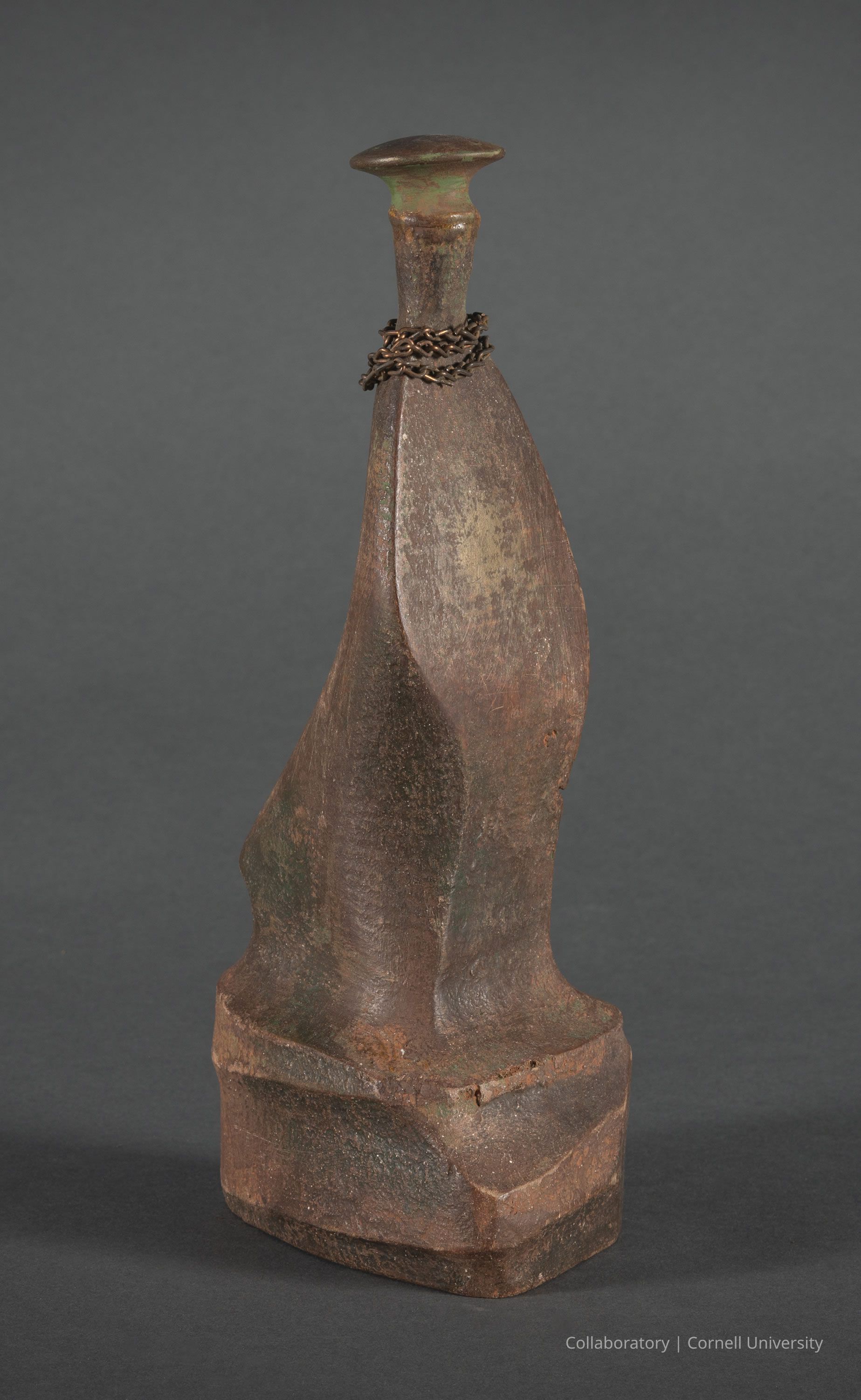 The photo depicts an intricately designed, aged wooden artifact with a greenish and brown patina, featuring a uniquely curved and textured body, and topped with a wide, rounded 'stopper' reminiscent of a beret; a rusted chain is wrapped around the neck of the figure, enhancing its narrative mystery. The artifact is set against a plain, dark background that contrasts with and highlights the details and texture of the figure.