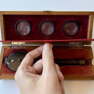 The lens system consists of seventeen lenses in a single disc with an auxiliary lens. Also included are lenses for indirect ophthalmoscopy.Dimensions
