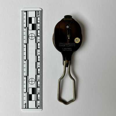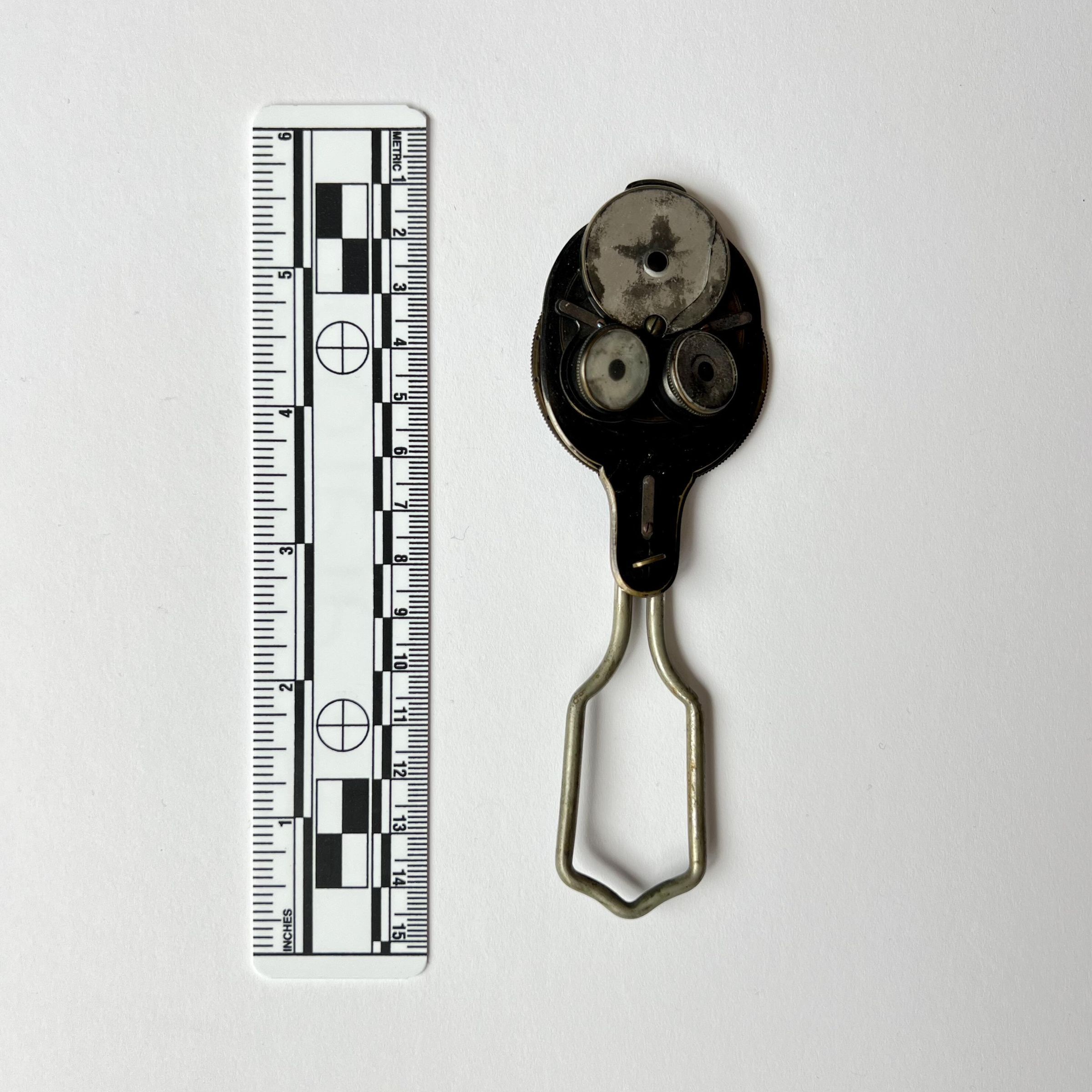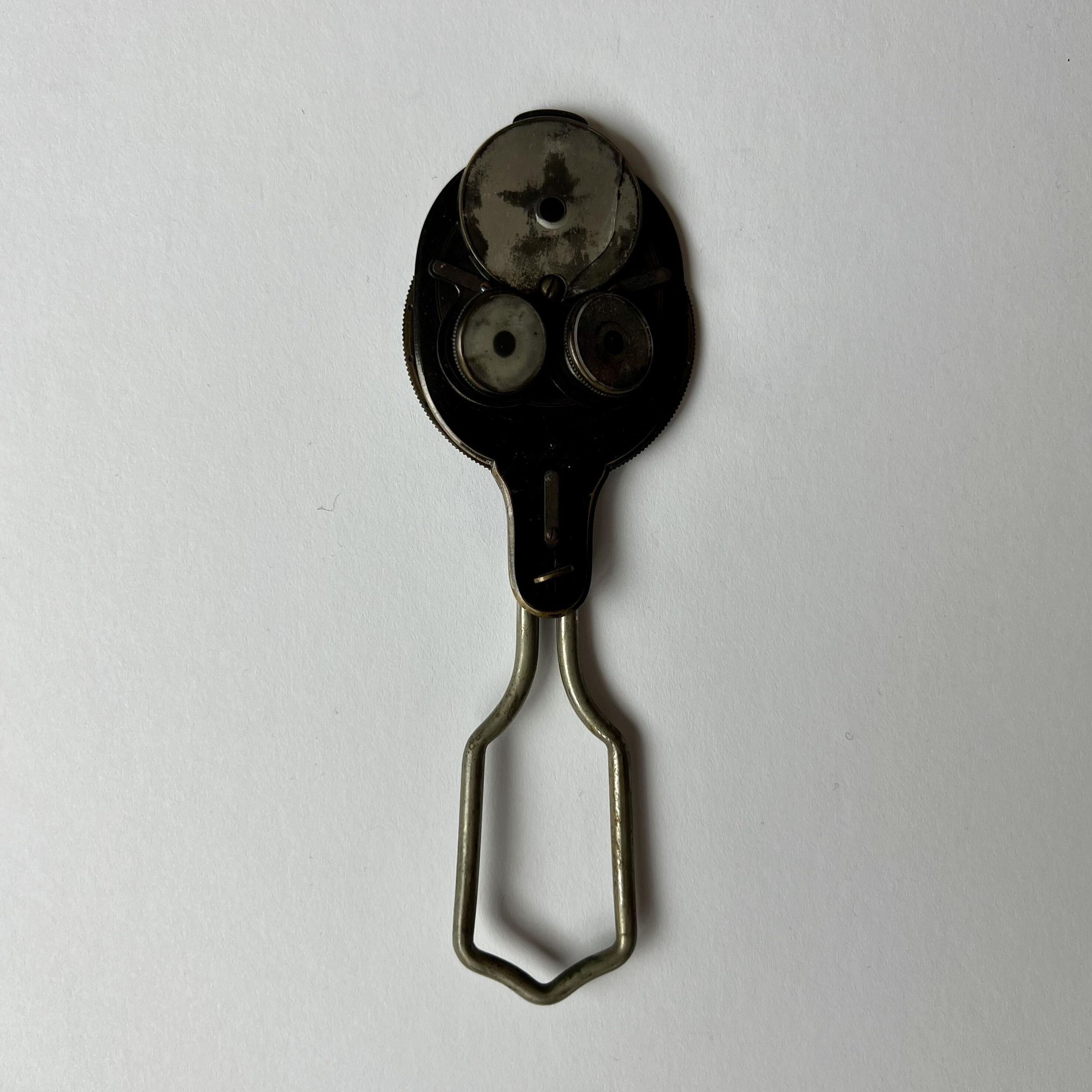 This ophthalmoscope contains a single battery of lenses from +9 to 0 to -8, and a 0.5 lens in a slide over the sight-hole. There are two small oblique mirrors (concave and plane) and a large plain mirror mounted on a rotating disc.Dimensions