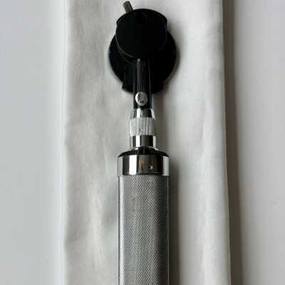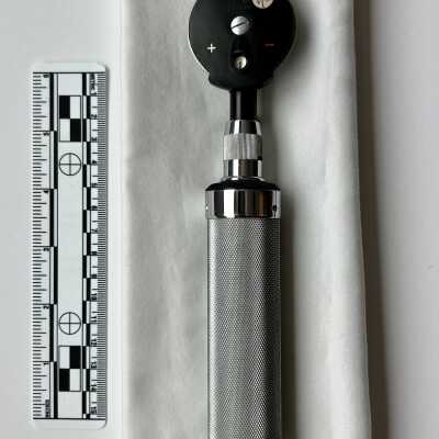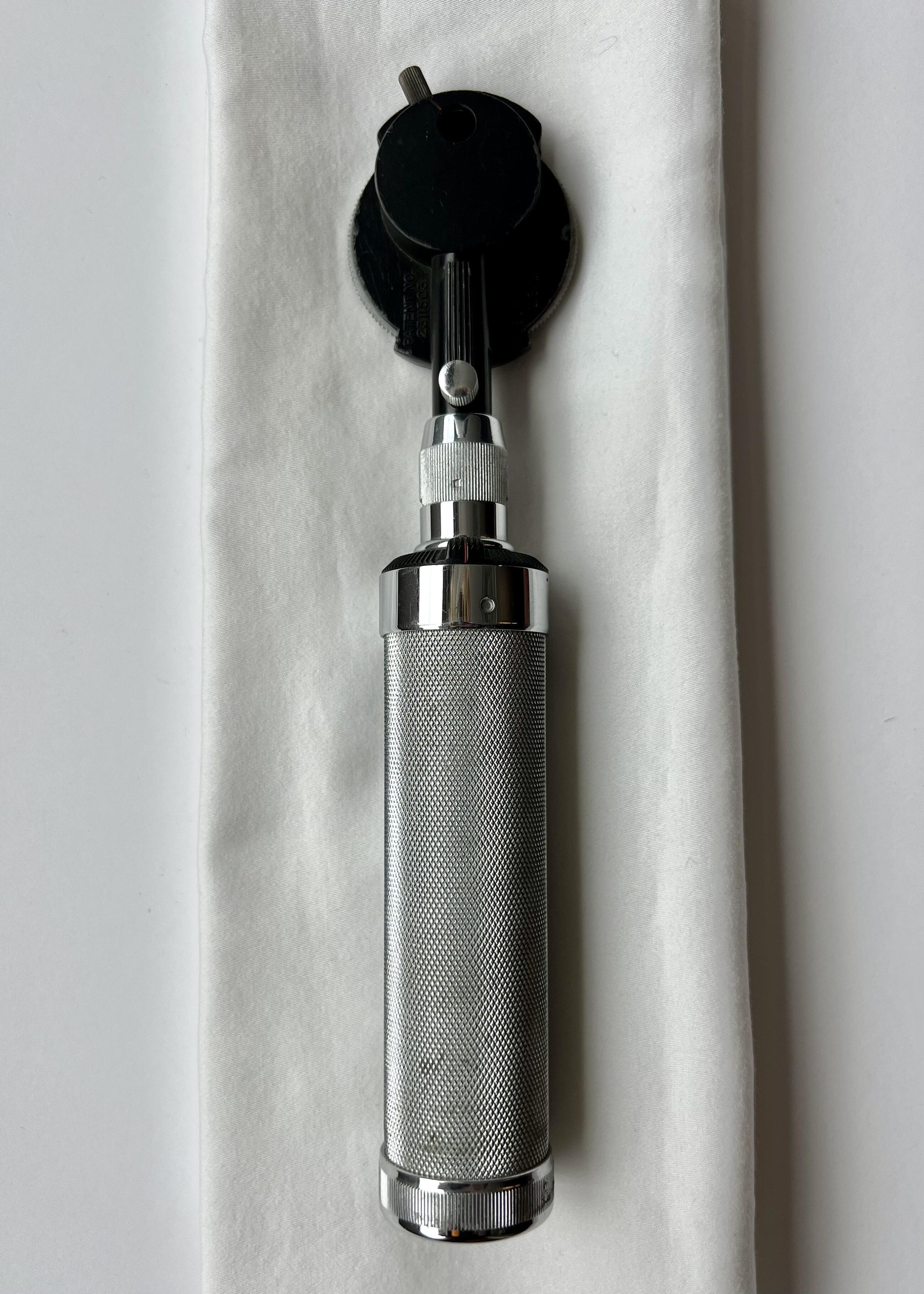 This ophthalmoscope's lens system consists of 23 lenses, with an illuminated dial. The light is produced from a small lamp in the handle which is reflected into the eye by a prism.Made/Created
