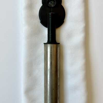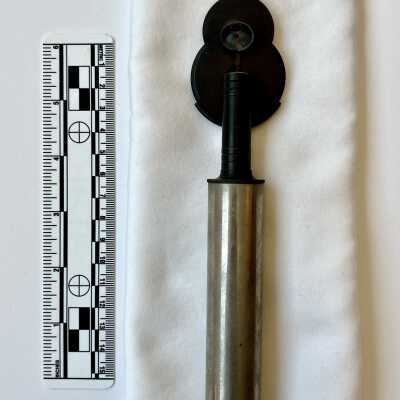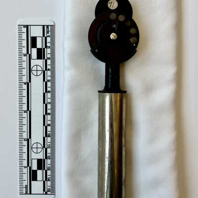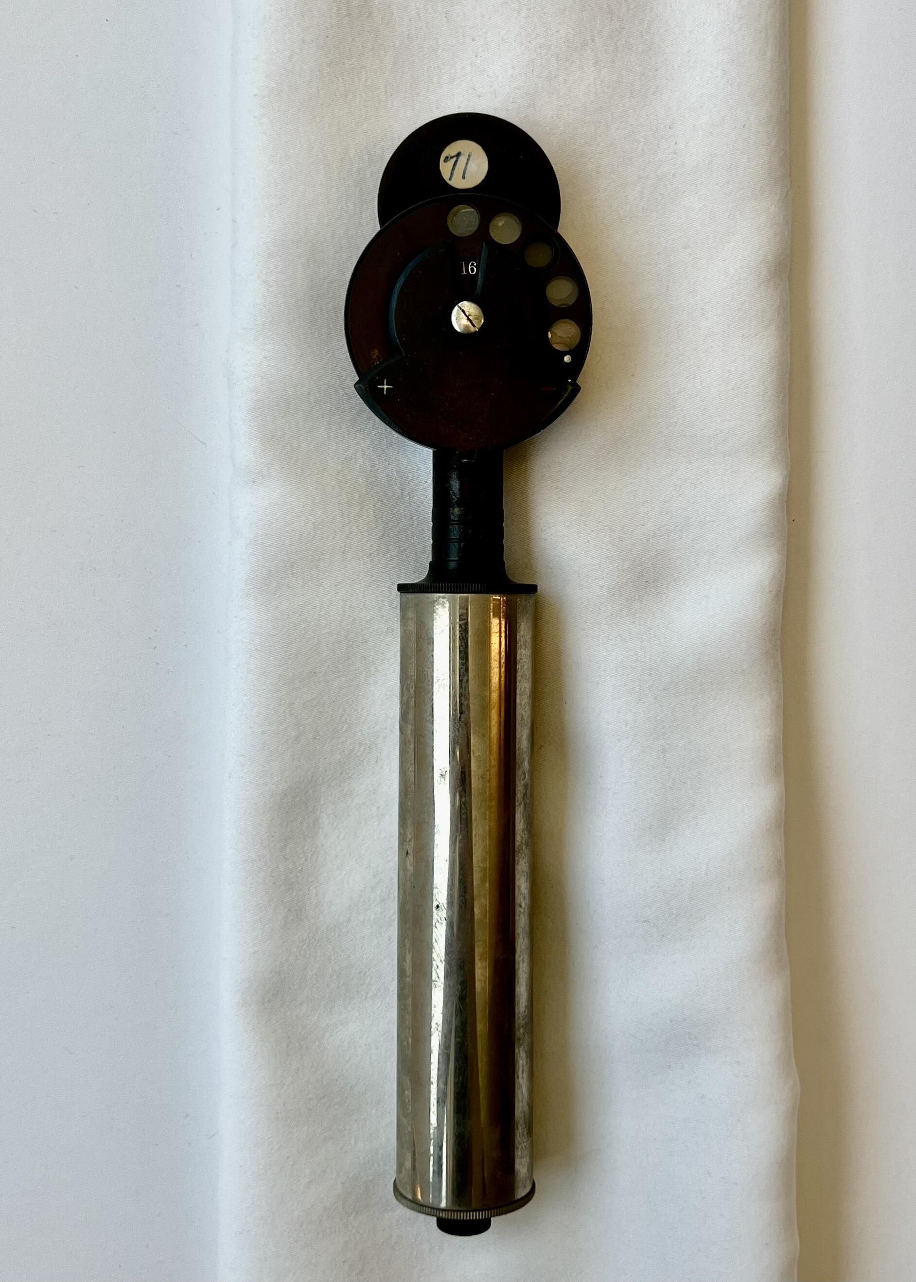 This ophthalmoscope uses small dry battery cells, combined with a DeZeng Loring lens system and an imperforate mirror.Dimensions