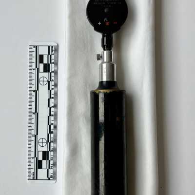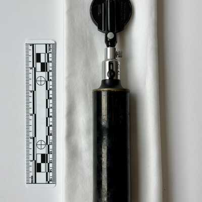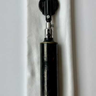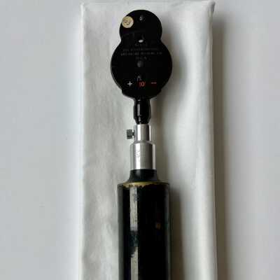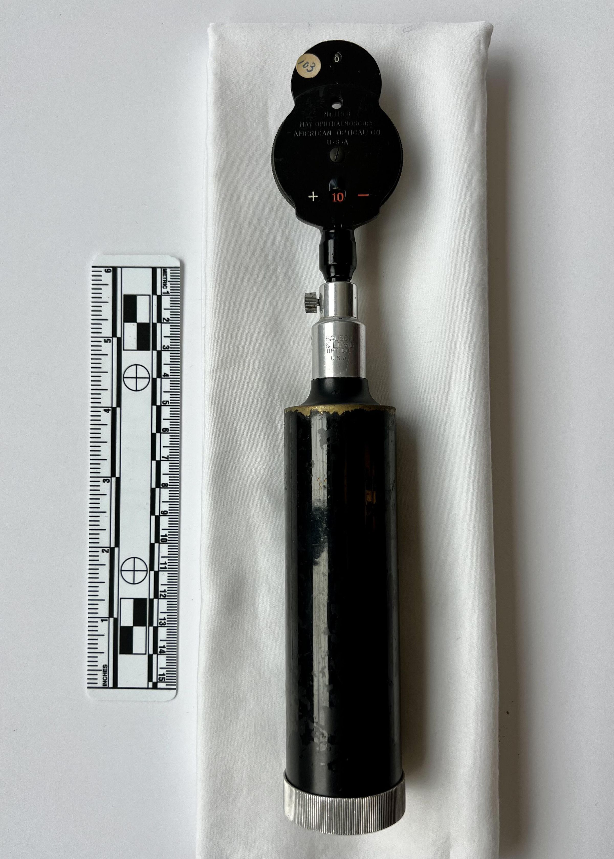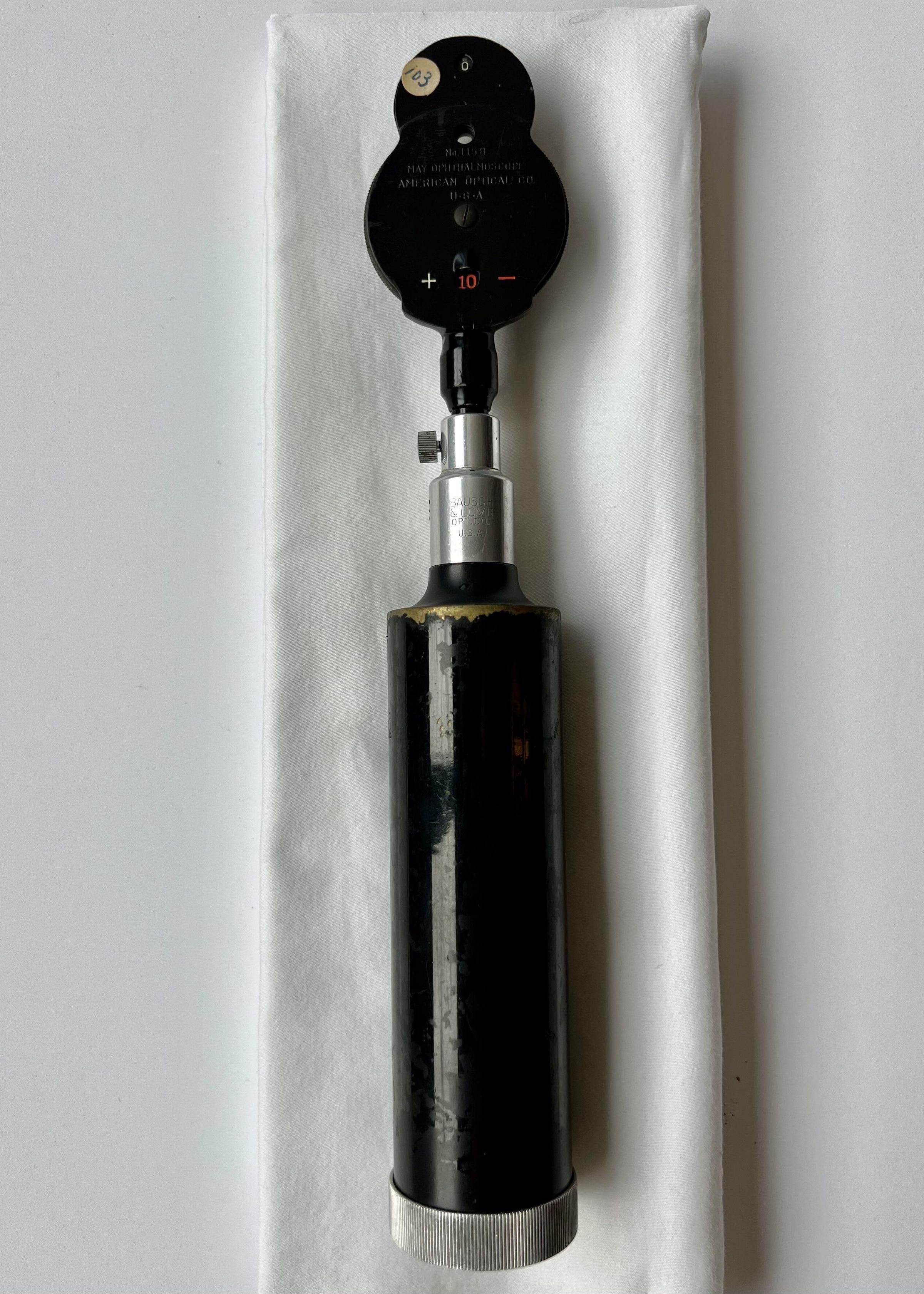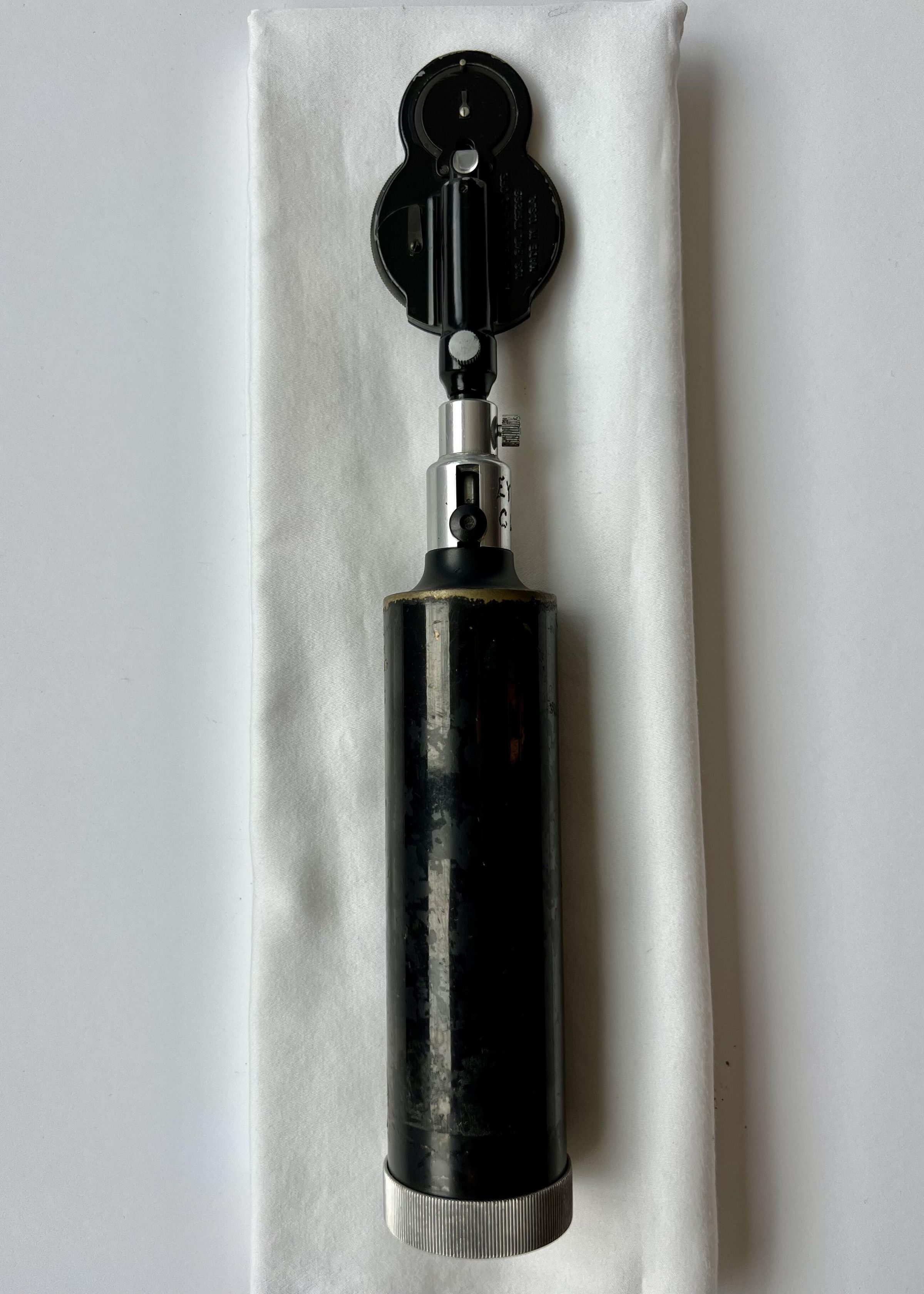 This instrument has a large battery handle and was once a popular type of ophthalmoscope.Made/Created