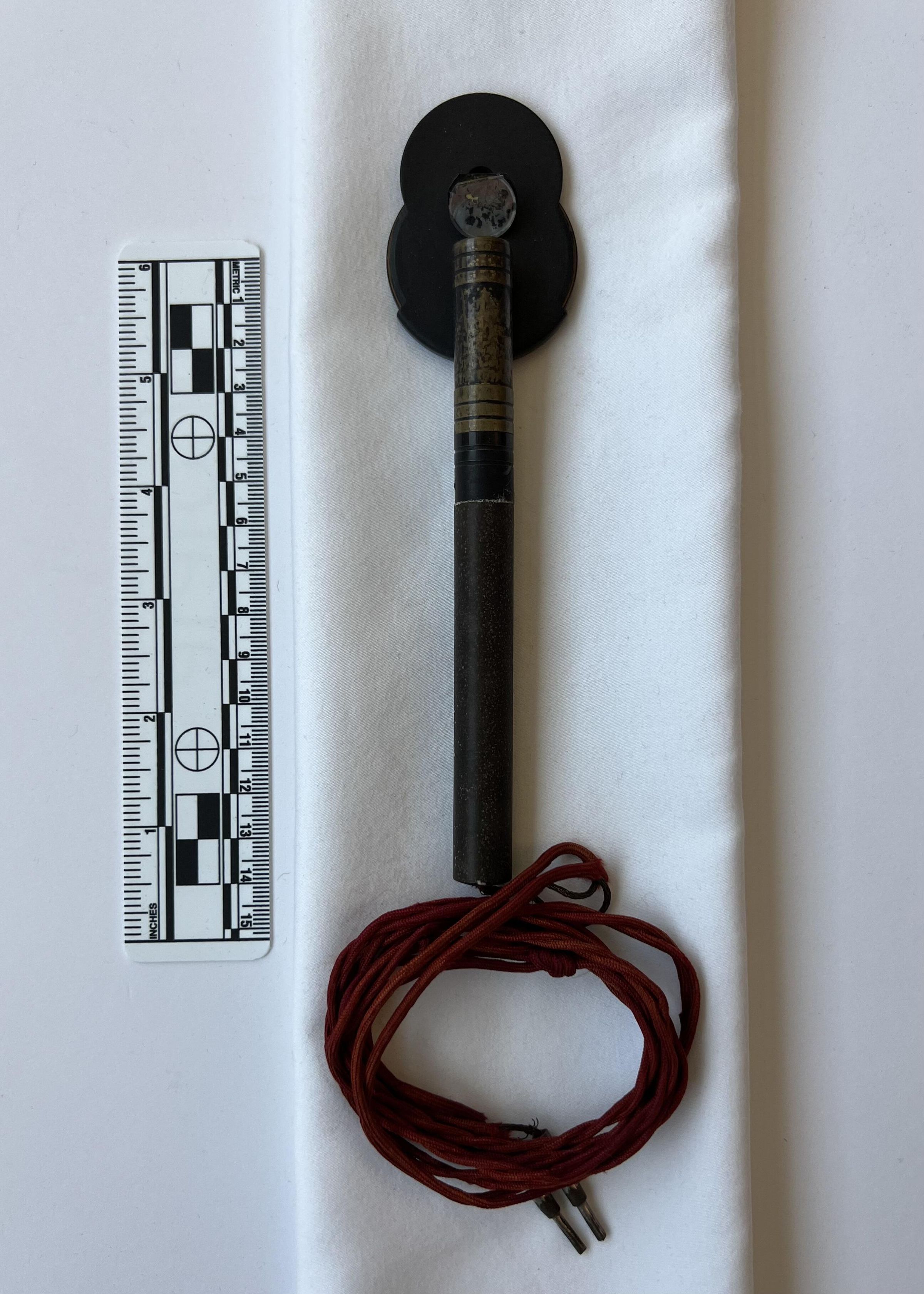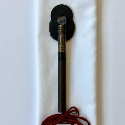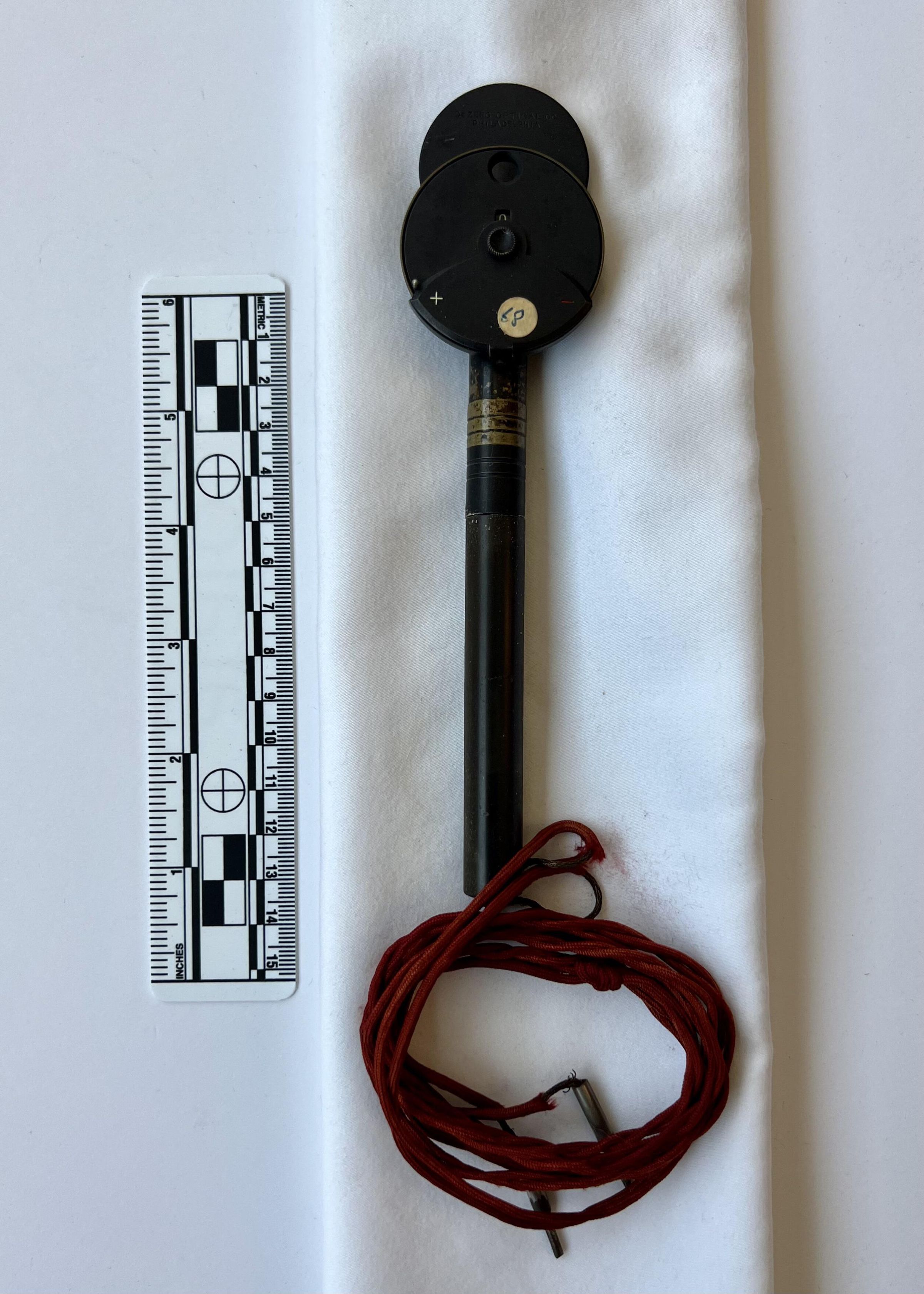 Inside the handle is a small lamp, which is connected to the red wires running out the end. To power the lamp, the wires were plugged into a wooden box containing dry cell batteries. The accompanying wooden battery container was once part of the original collection but has since been lost. This instrument used the DeZeng Loring lens system.Dimensions