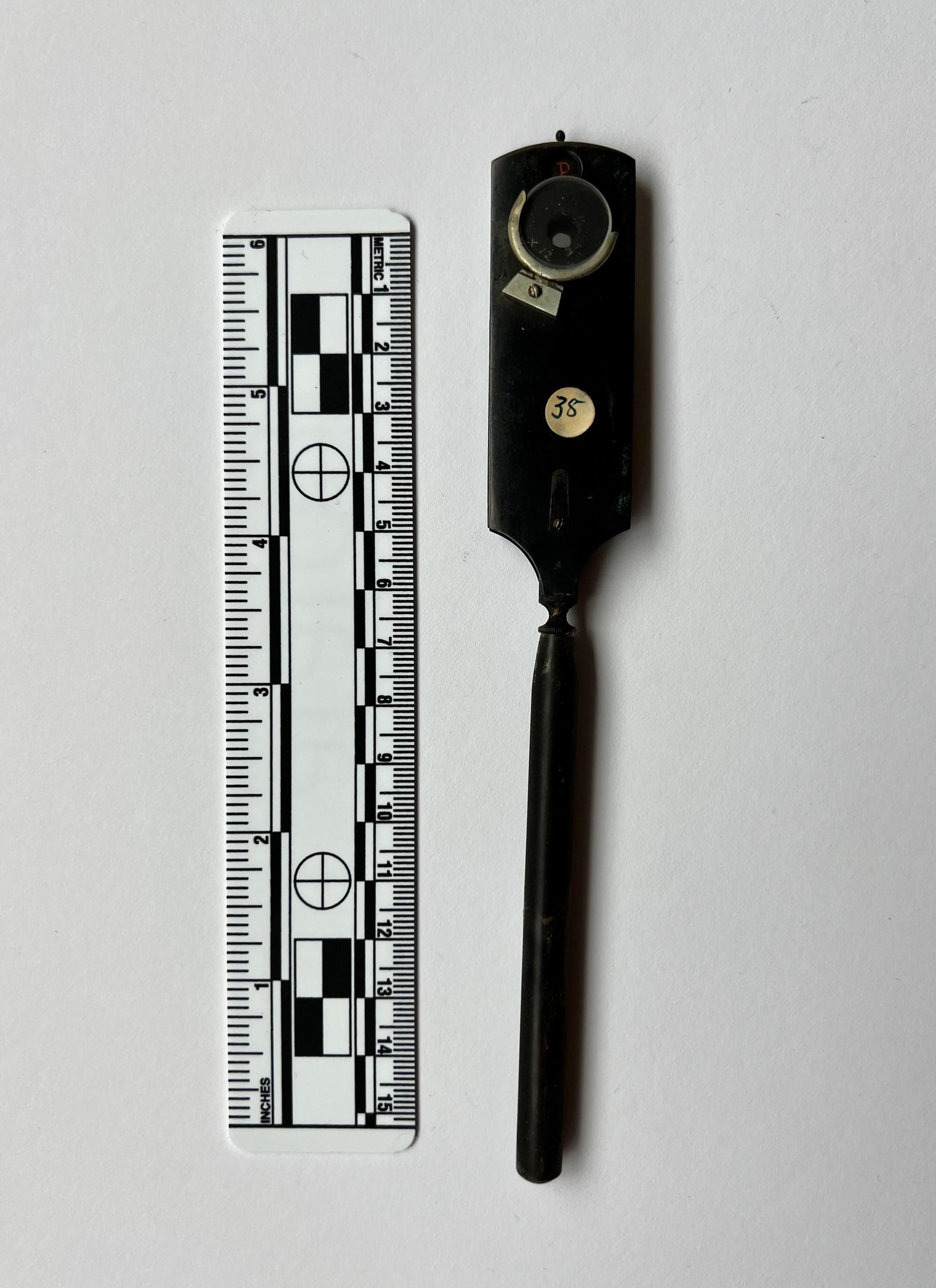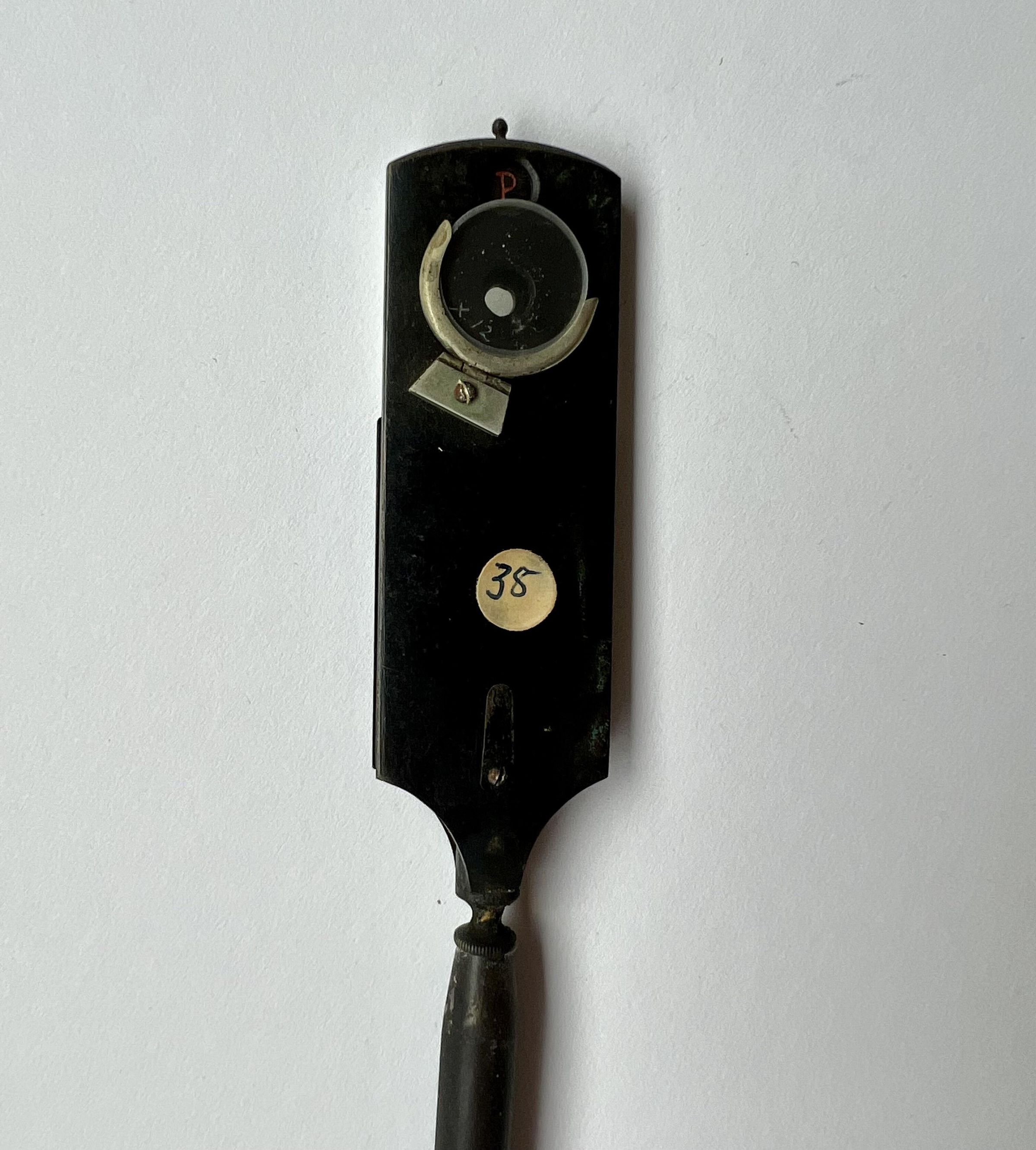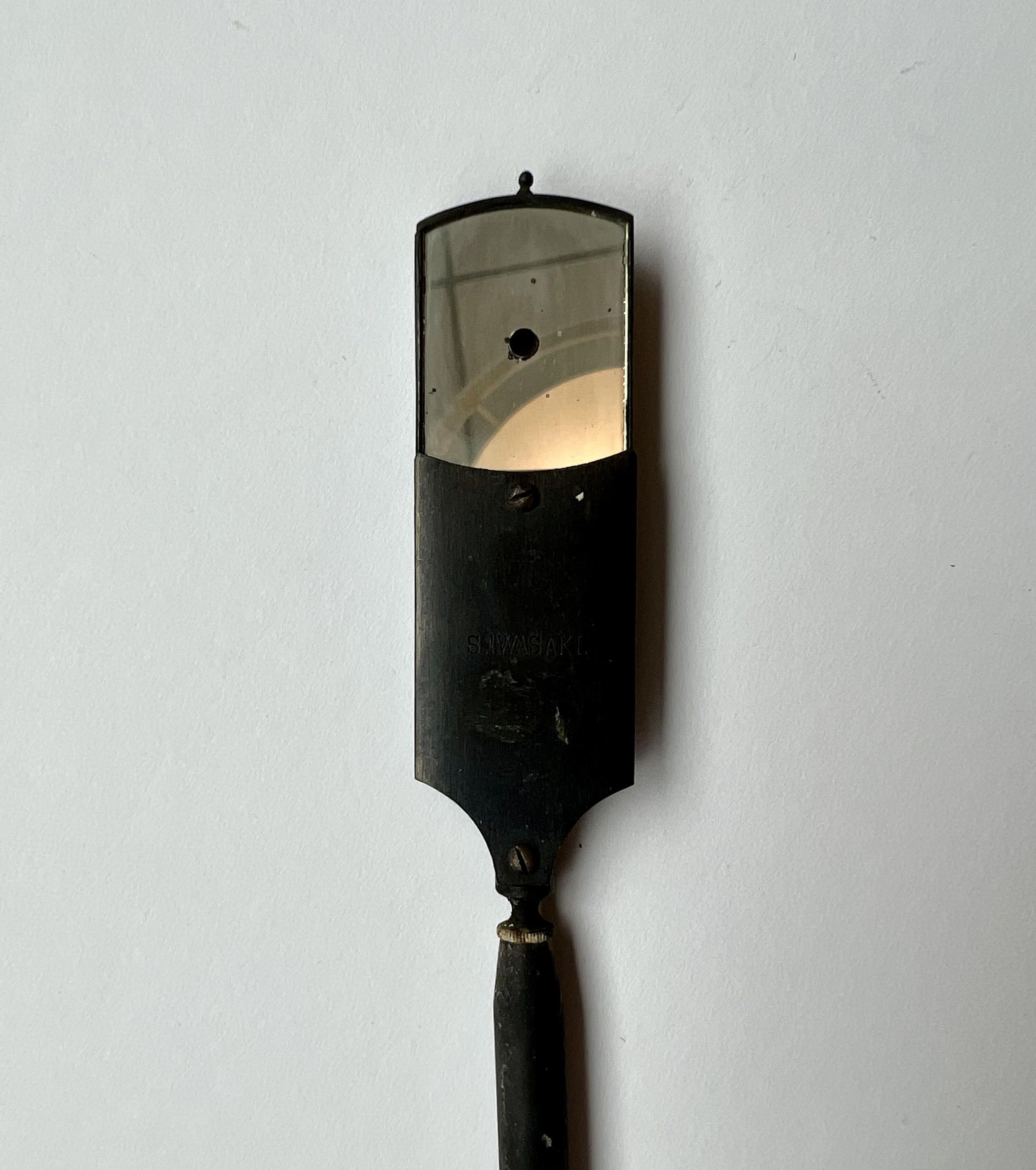 The instrument has two mirrors (concave and plane) that can be rotated. The Liebreich principle of lenses is used.Dimensions