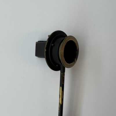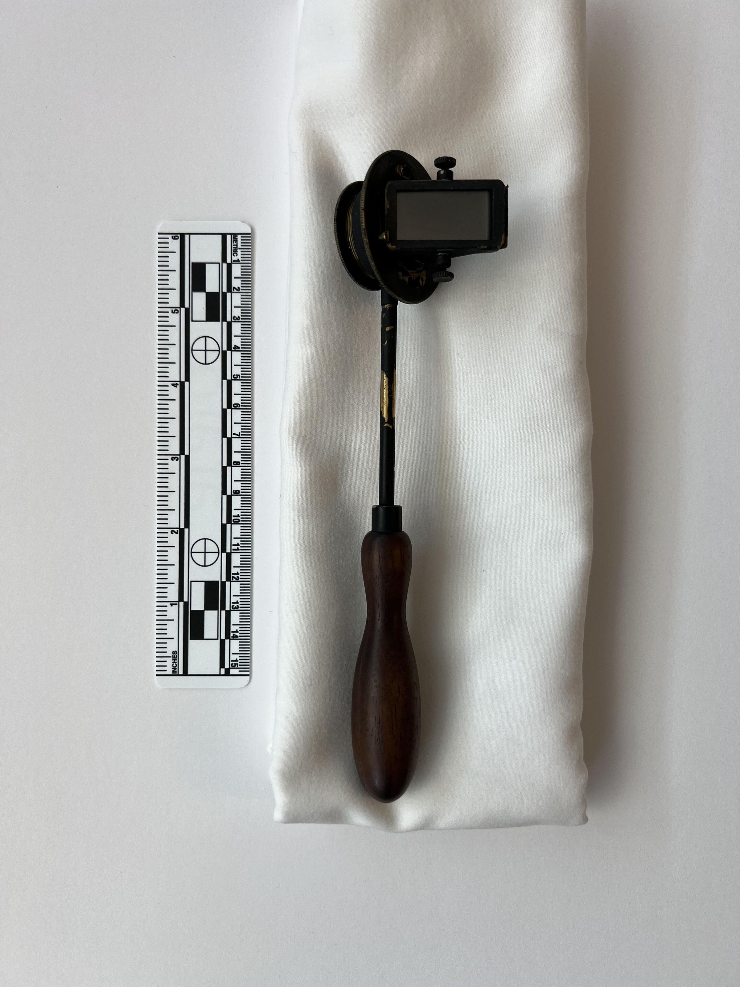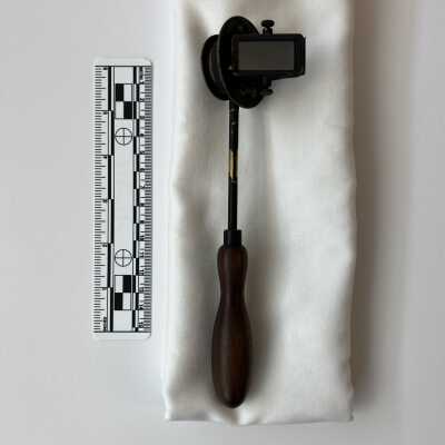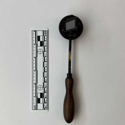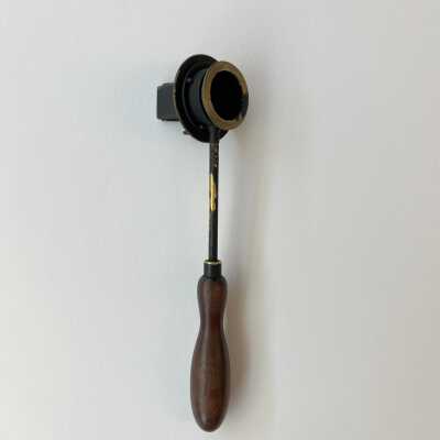 The Helmholtz ophthalmoscope was produced by several manufacturers, and its design evolved over time. This model, with its long thin handle, is from the second phase of the instrument’s production. Of all its variations, there are approximately 100 Helmholtz ophthalmoscopes left.