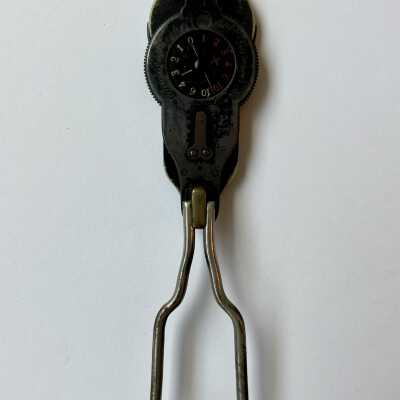 This ophthalmoscope features three mirrors, one for the erect image and the other two for the inverted image. It has a single disc with plus and minus lenses.