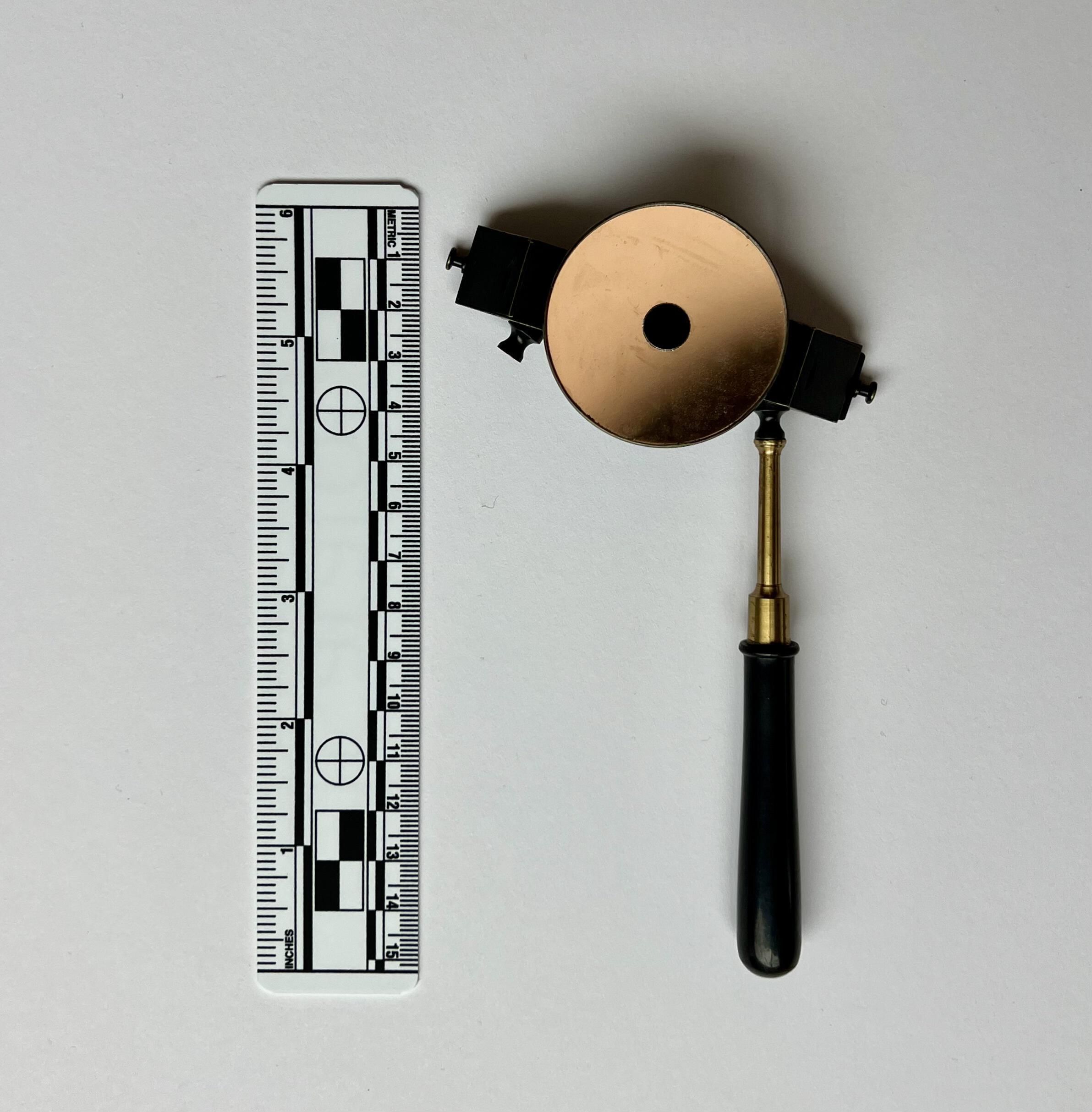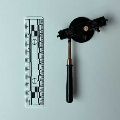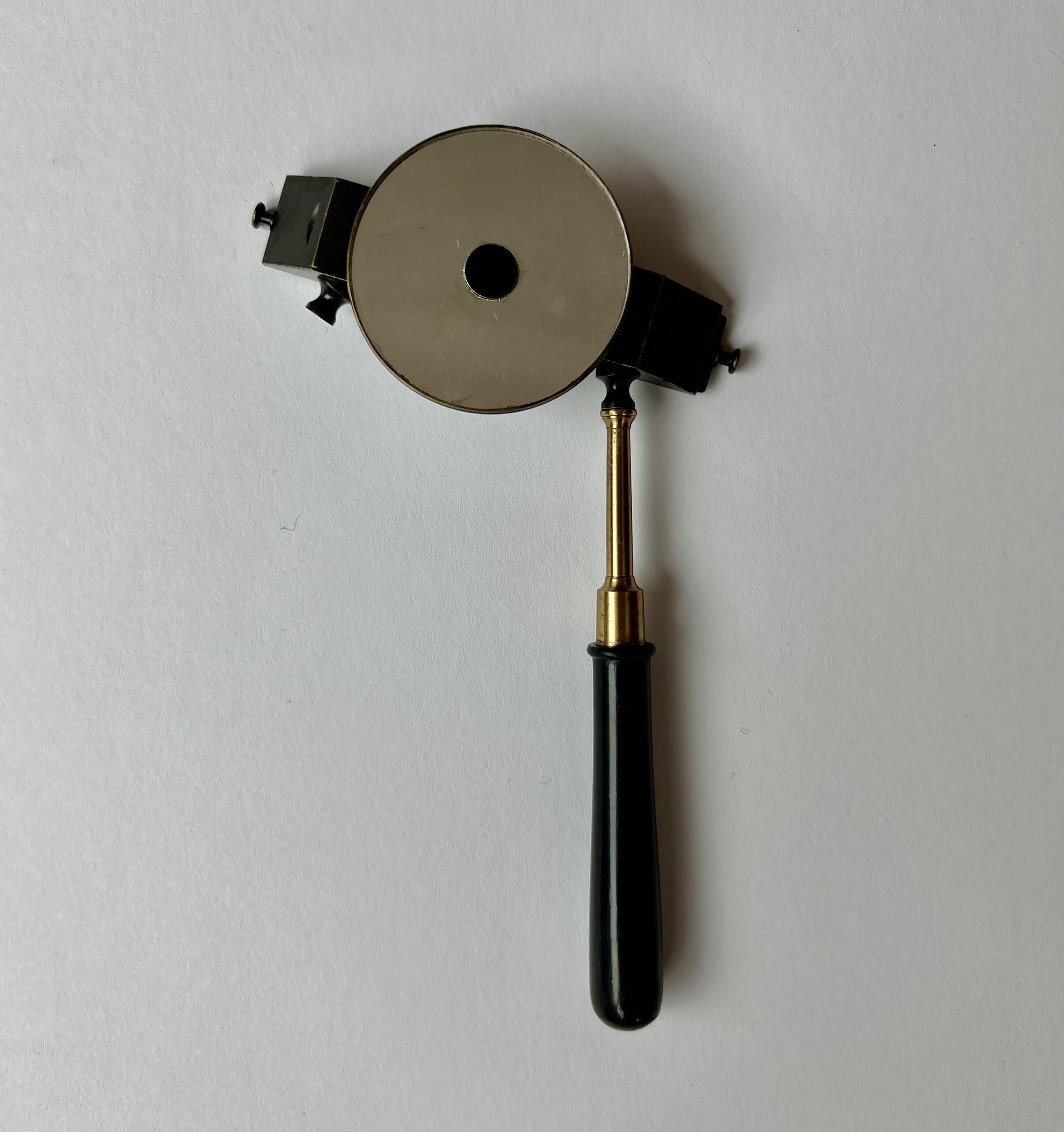 Illumination from a source positioned above the patient’s head was reflected by the concave mirror with aperture into the patient’s eye through a condensing lens. The operator viewed the image of the fundus binocularly, by means of two totally reflecting prisms whose apexes were placed together. There was no means of varying the inter-pupillary separation of the eyepieces. Provision was made for holding the instrument with either hand.Dimensions